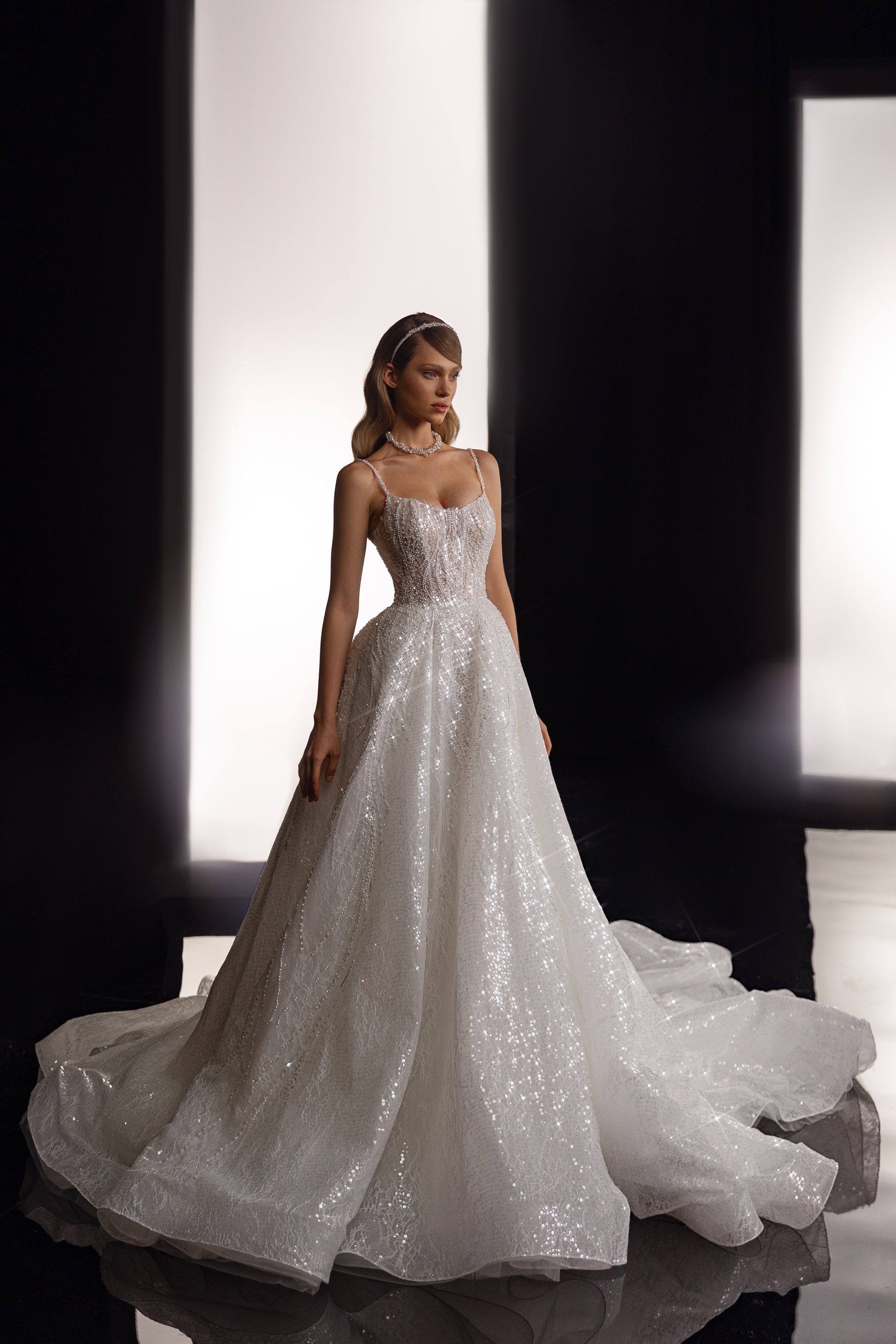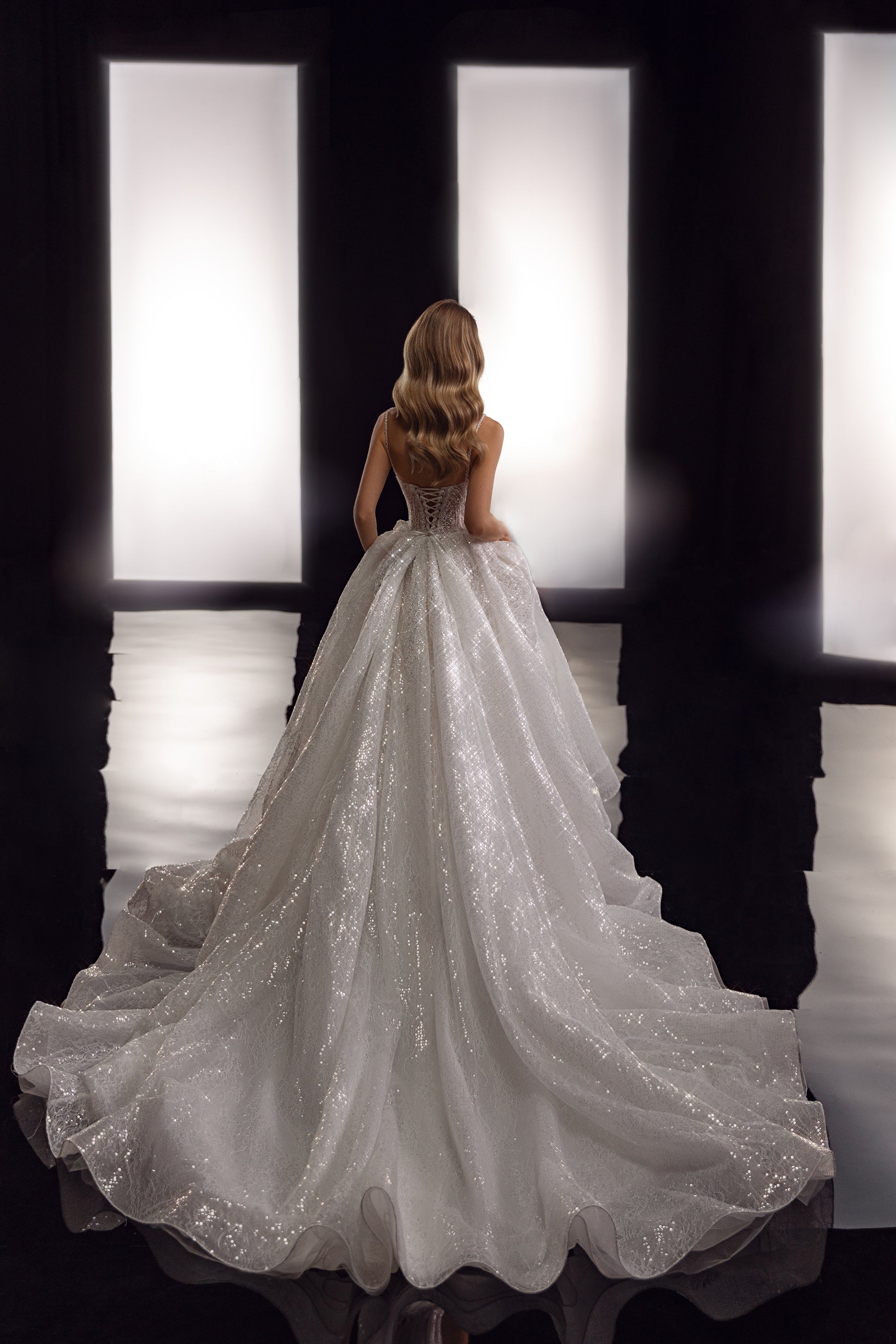 This ivory Chantilly lace gown captures the retro charm of a bygone era, shimmering with sequins across its hand-embroidered, beaded corset front and back. Adorned with guipure accents, pearls, and delicate hand-beaded thin straps, it radiates glimmer and grace. The deep-folded skirt flows into a long trail, laced up the back in a princess silhouette, embodying timeless elegance with a celestial aura.