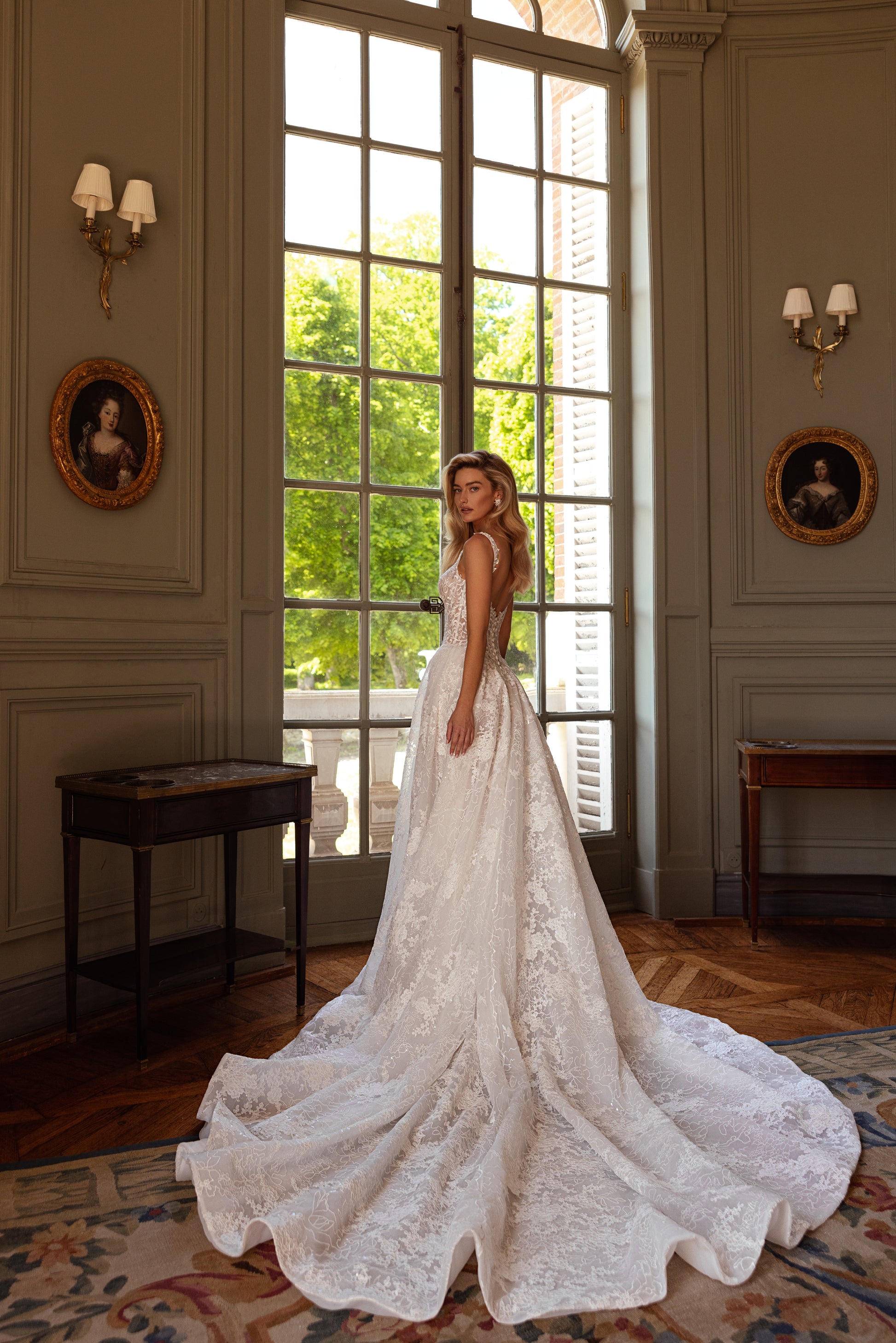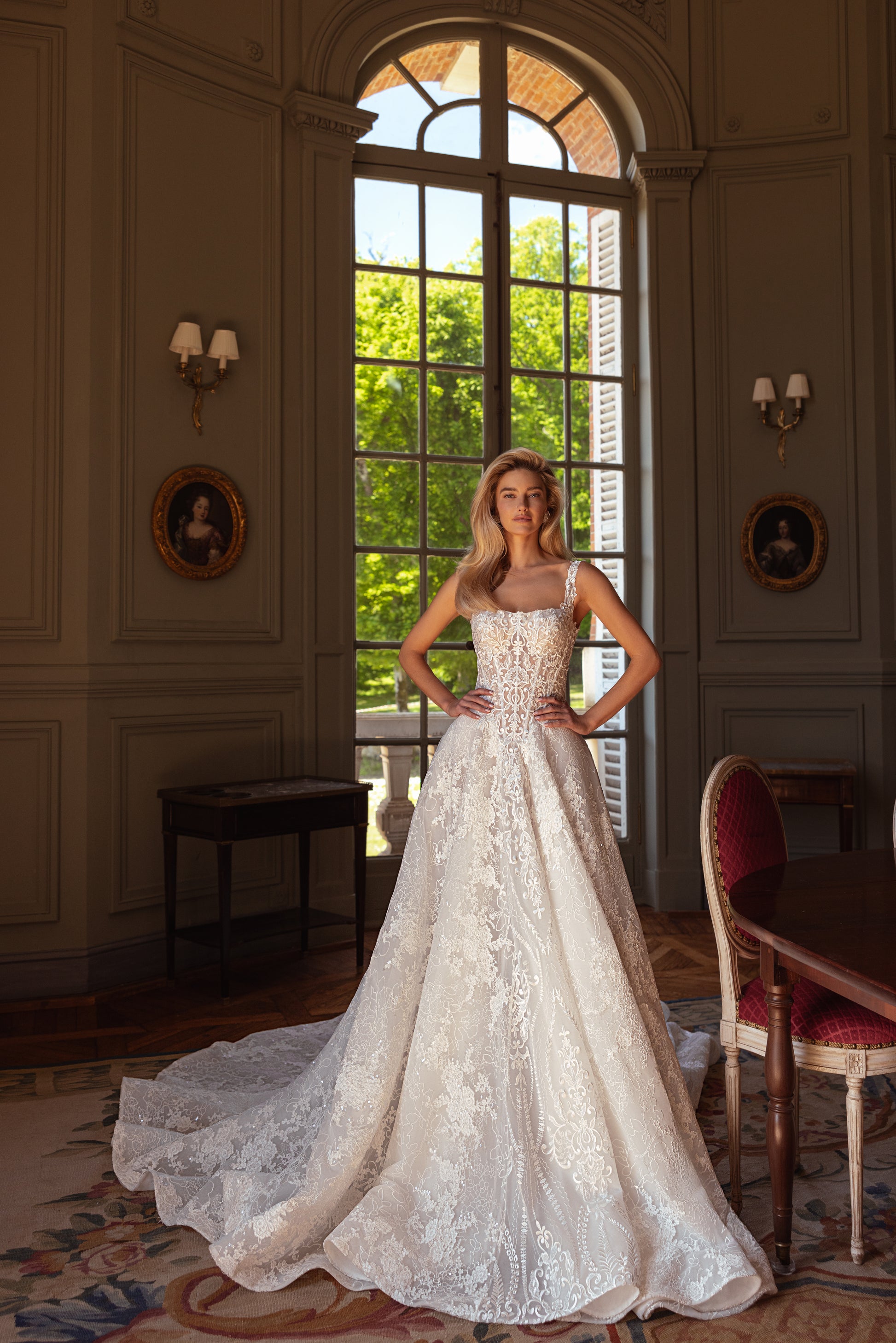This ivory gown crafted from lace with sequins and soft tulle features delicate appliques cascading along the skirt. The handmade A-line silhouette and straight neckline create a lush, soft, and tender look, blending timeless elegance with exquisite craftsmanship for a dress that feels breezy and gentle.