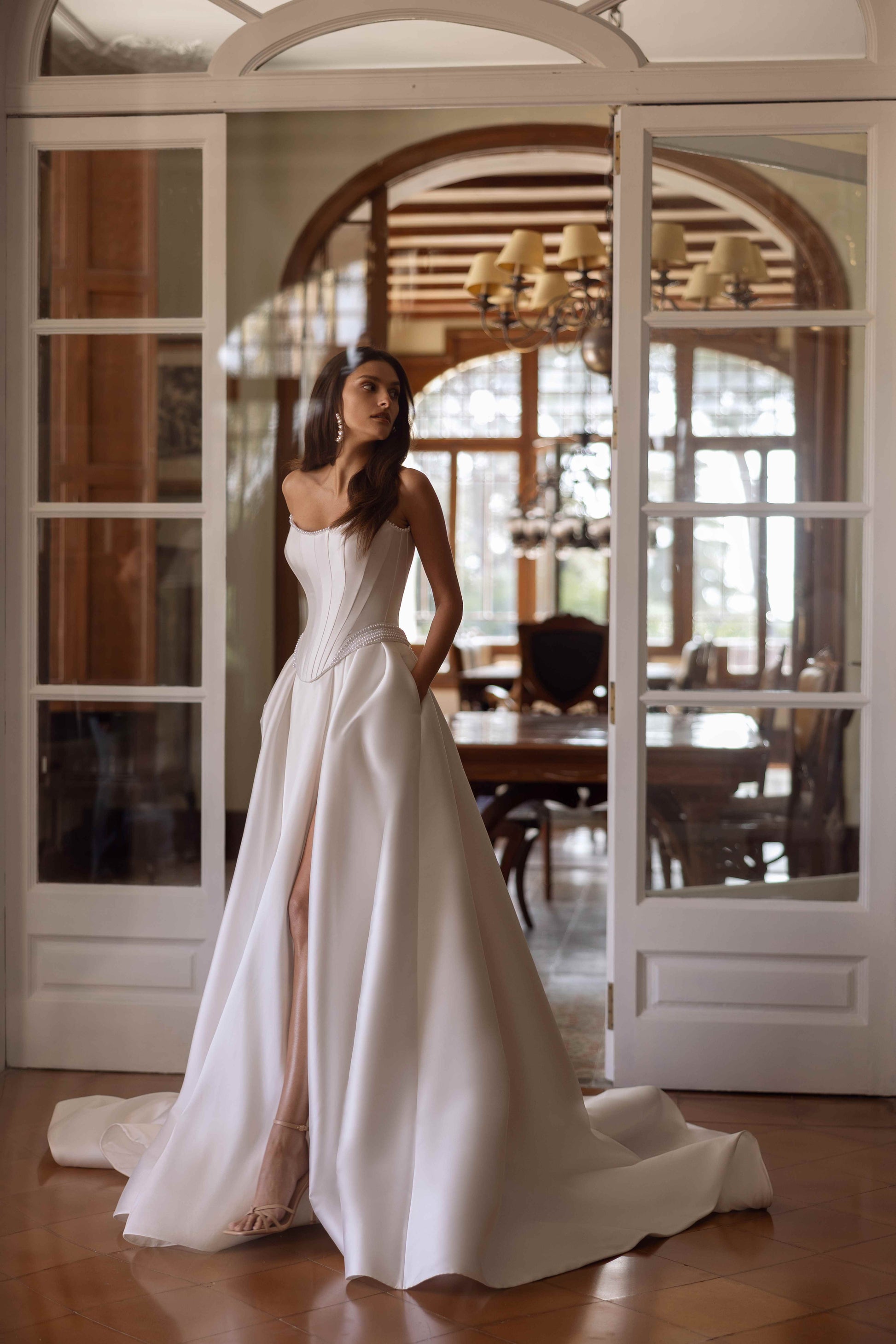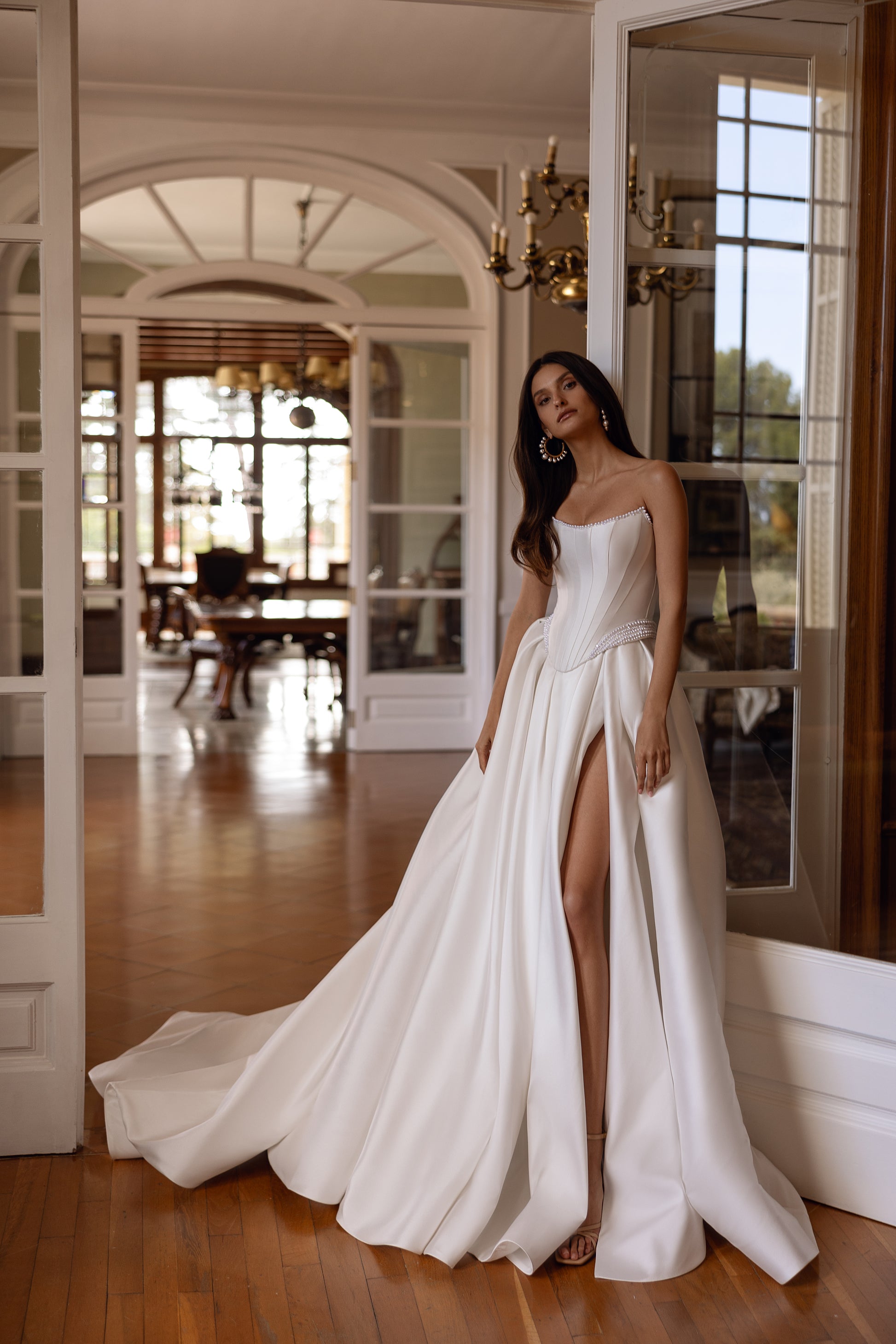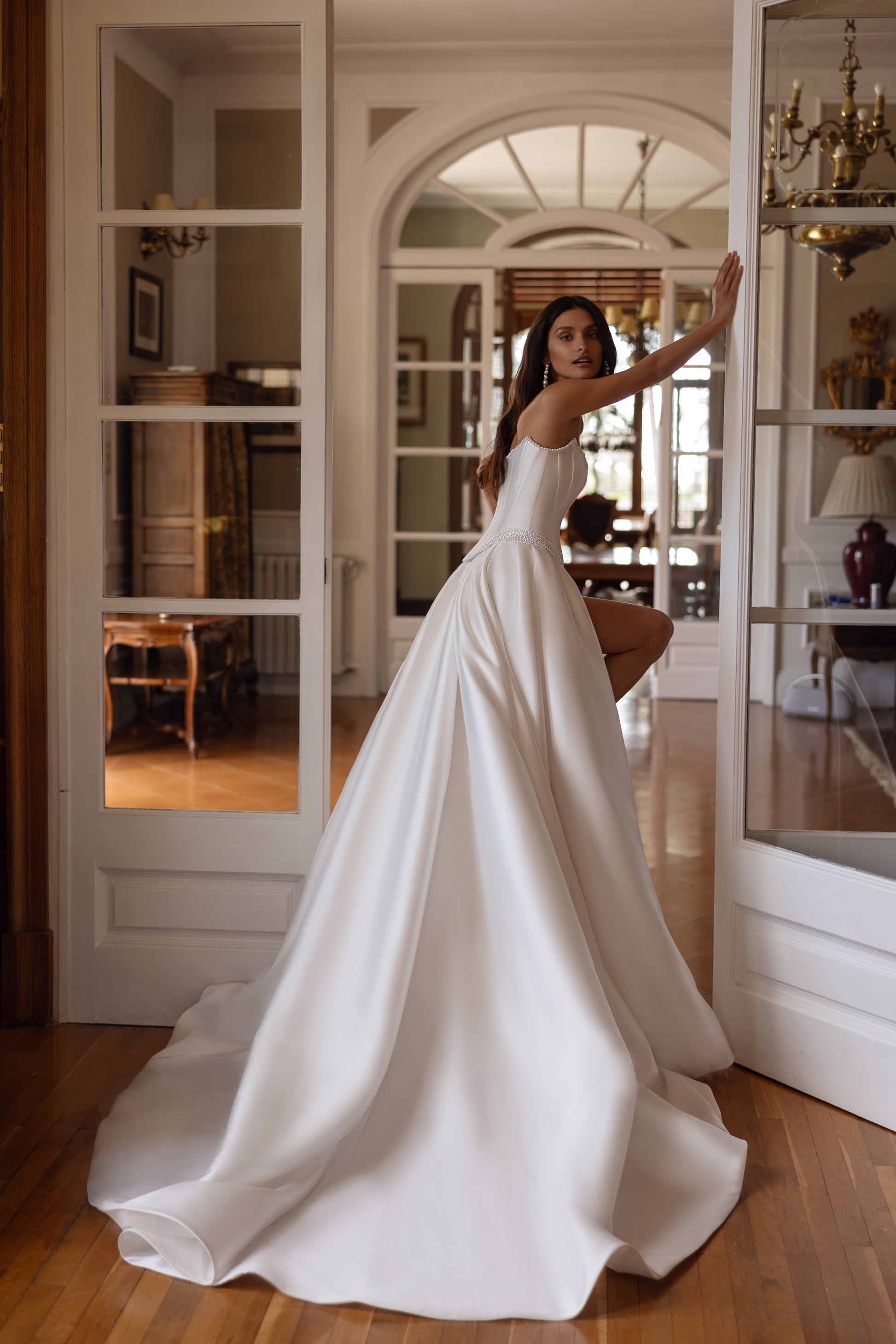 A bold statement of elegance and strength. Crafted from luxurious mikado in classic ivory, this hand-made A-line gown features a semi-sweetheart neckline and a dramatic slit that reveals just enough leg. Pearly bead accents and a flowing train add a touch of timeless glamour, perfect for a confident, unforgettable bride.