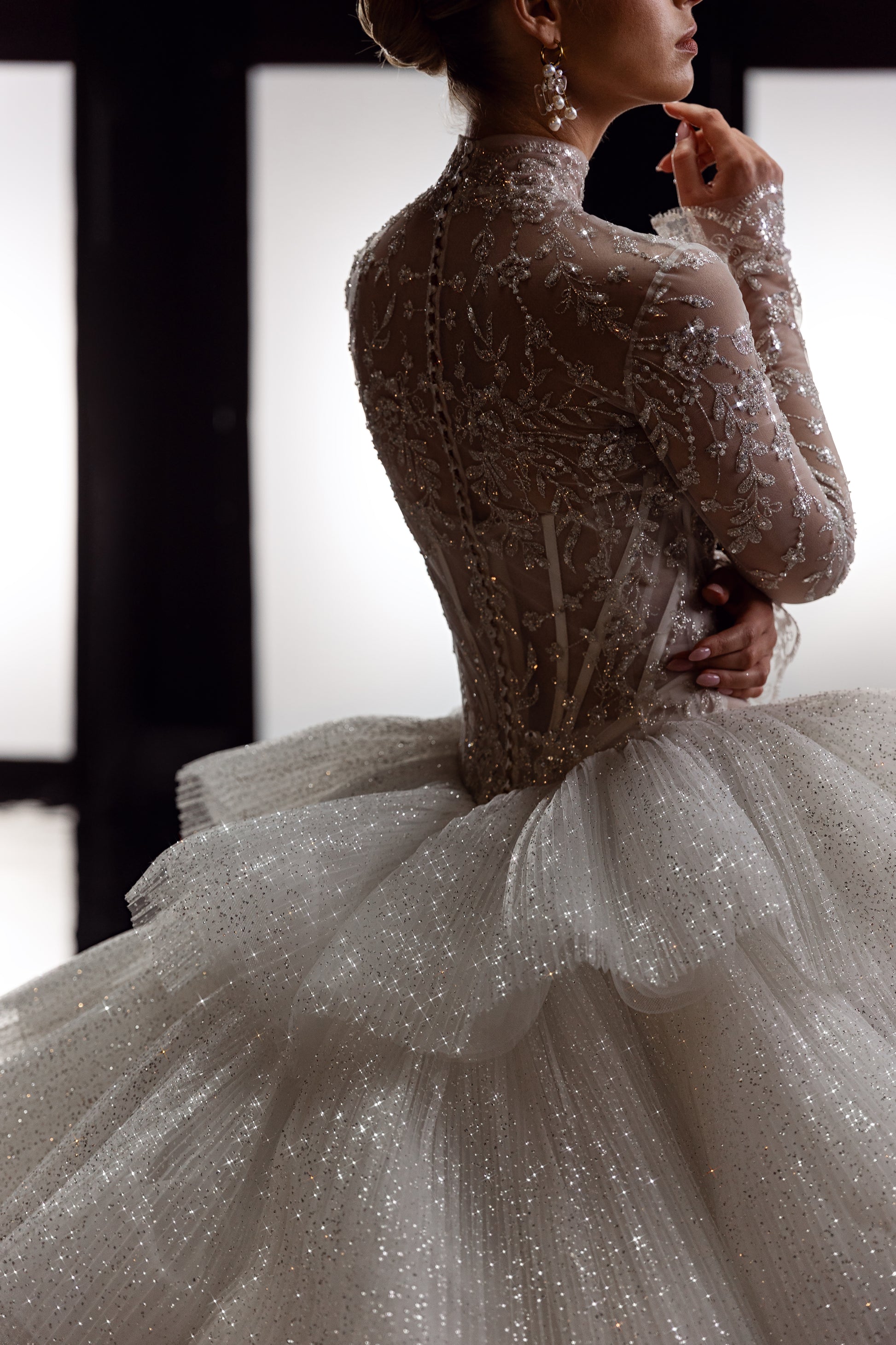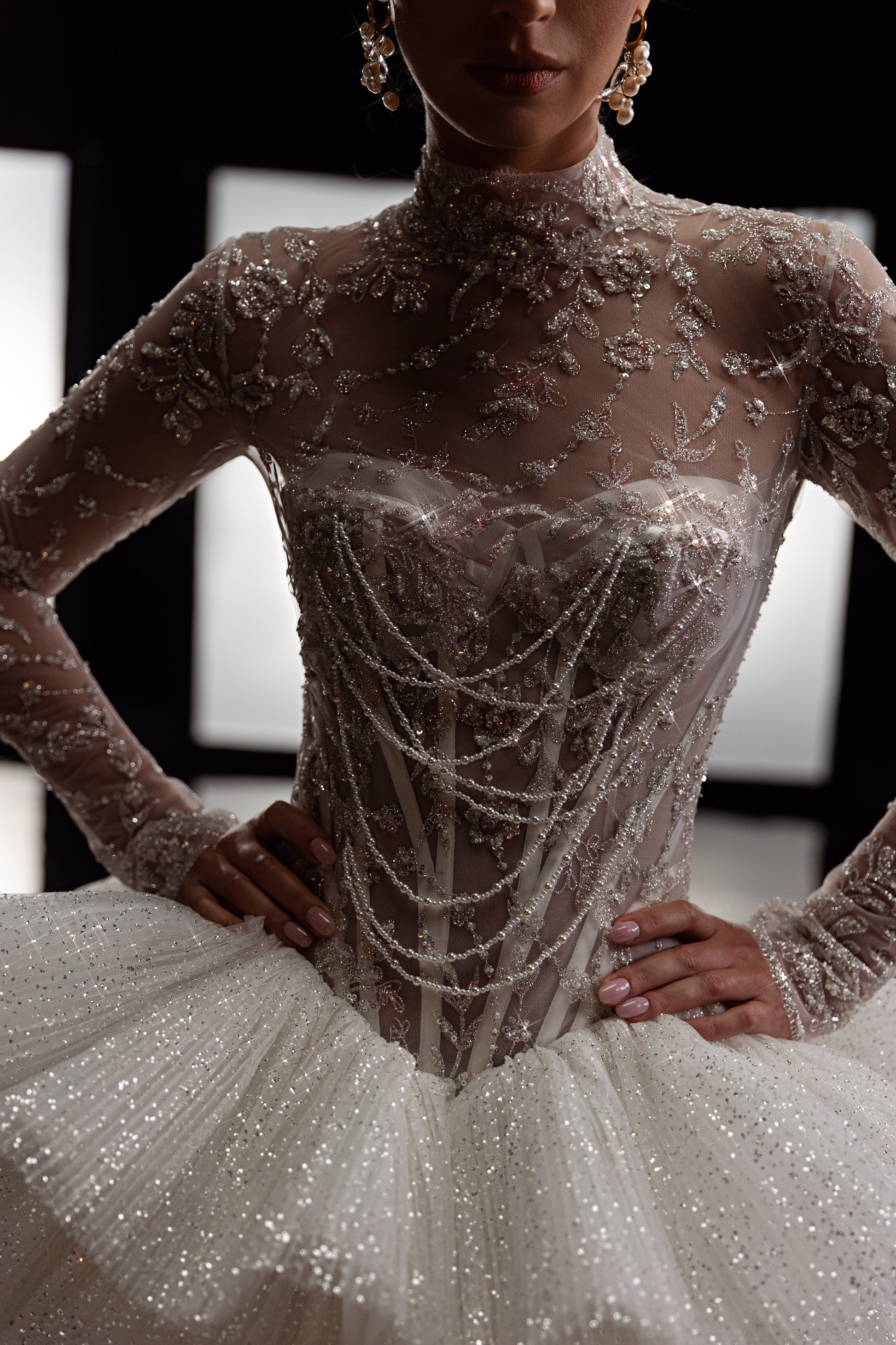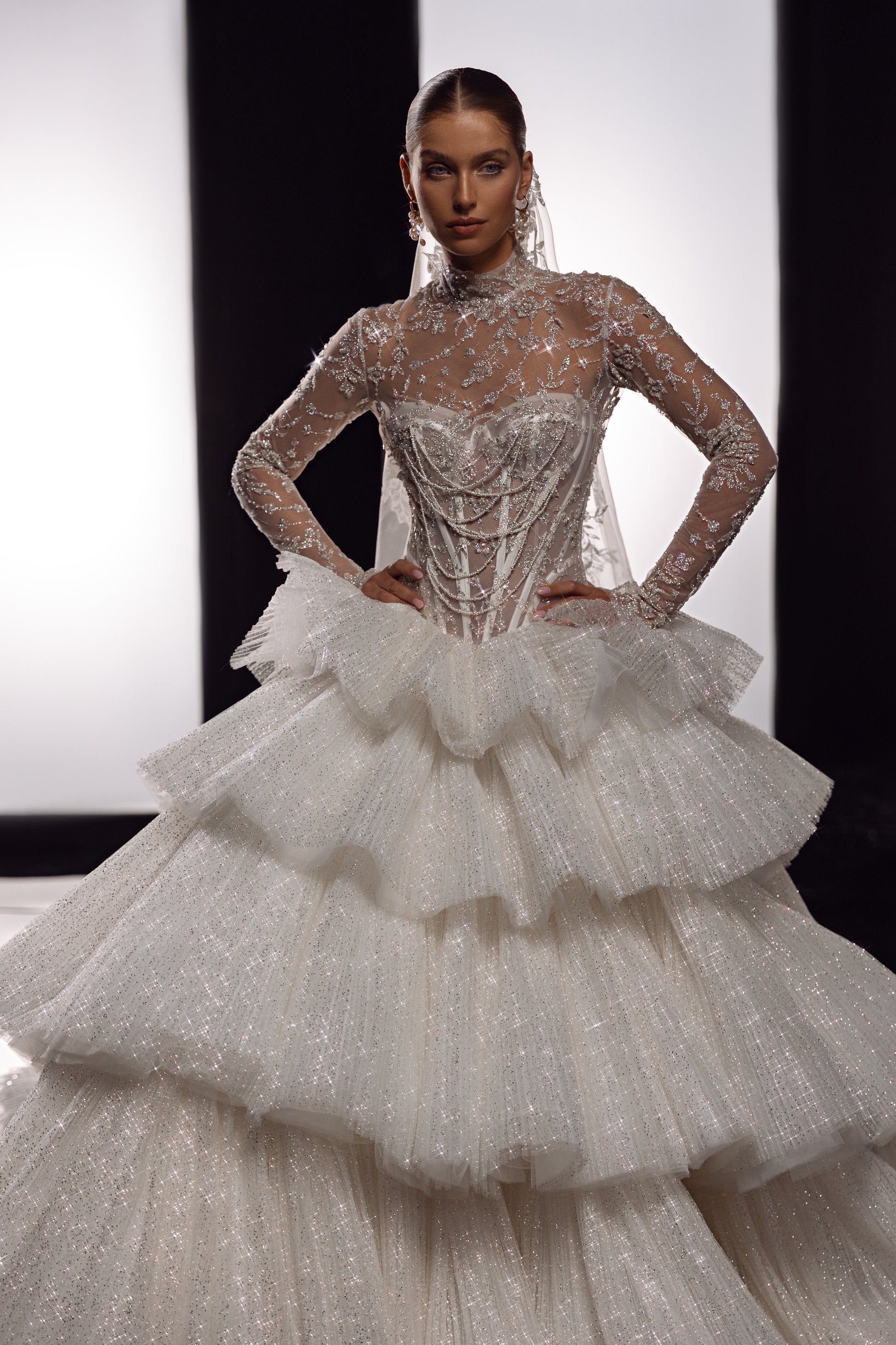 This cappuccino couture masterpiece blends a majestic four-level pleated glitter tulle skirt with a transparent, hand-beaded corset. Rich and structured, its basque waistline and intricate details contrast boldly with the gown’s tender romance, flowing into a very long, fluffy princess trail—perfect for a bride embracing striking elegance.