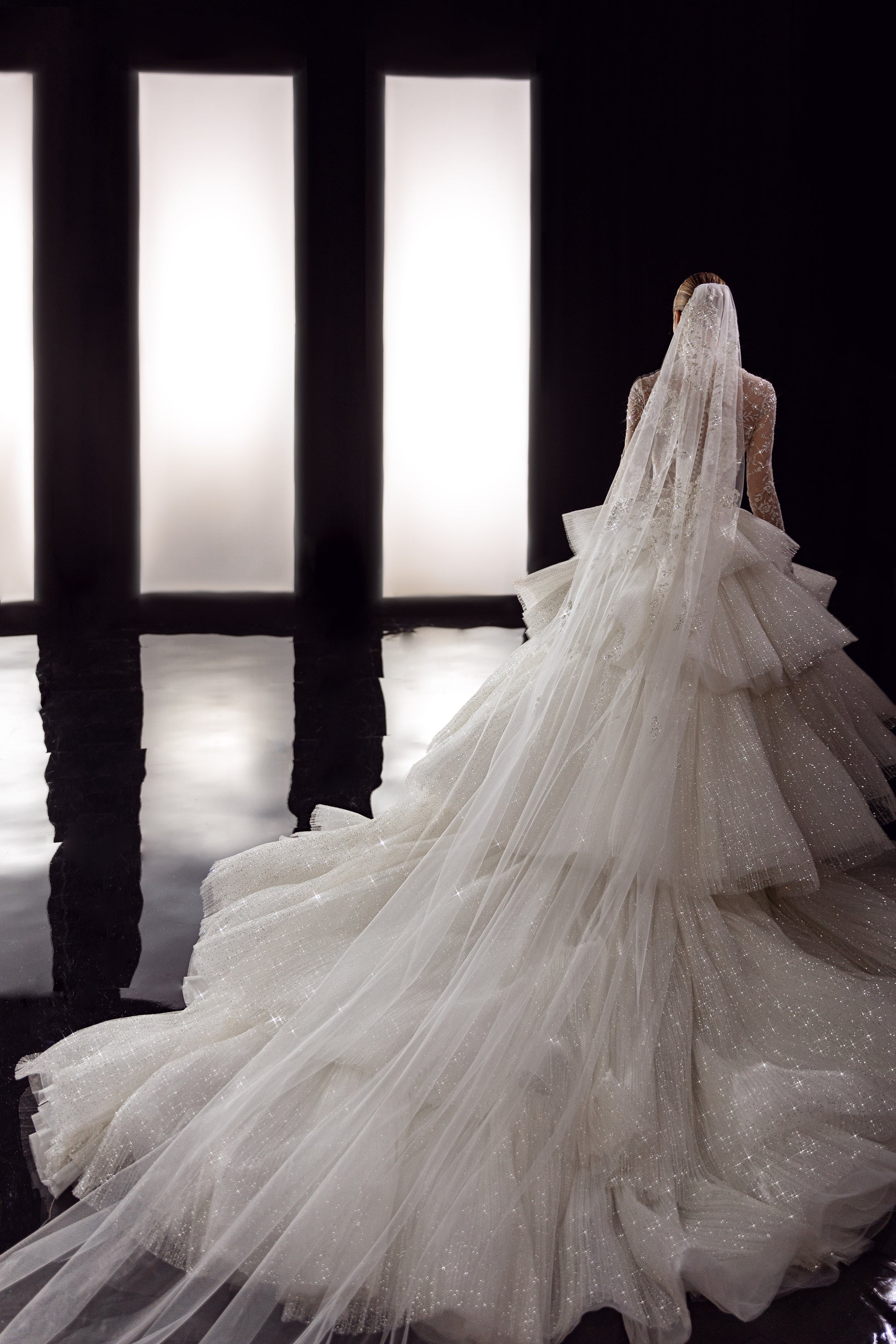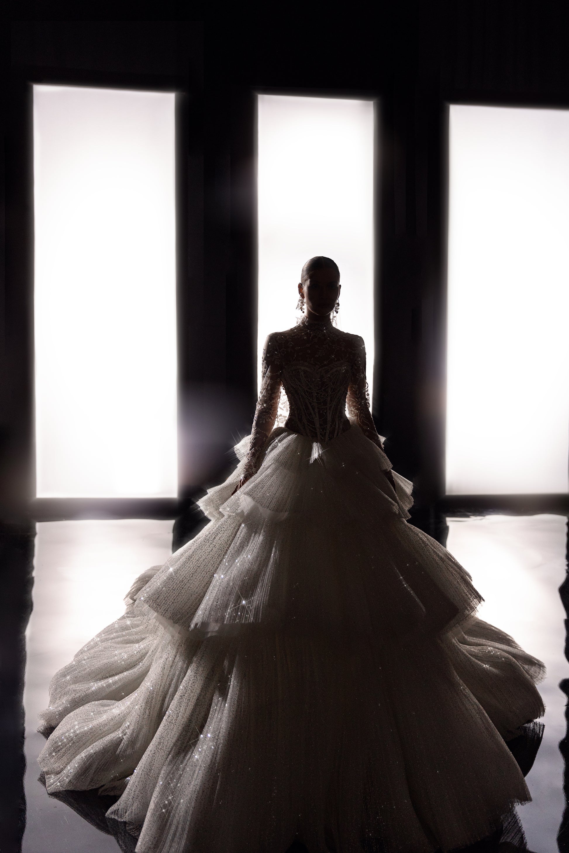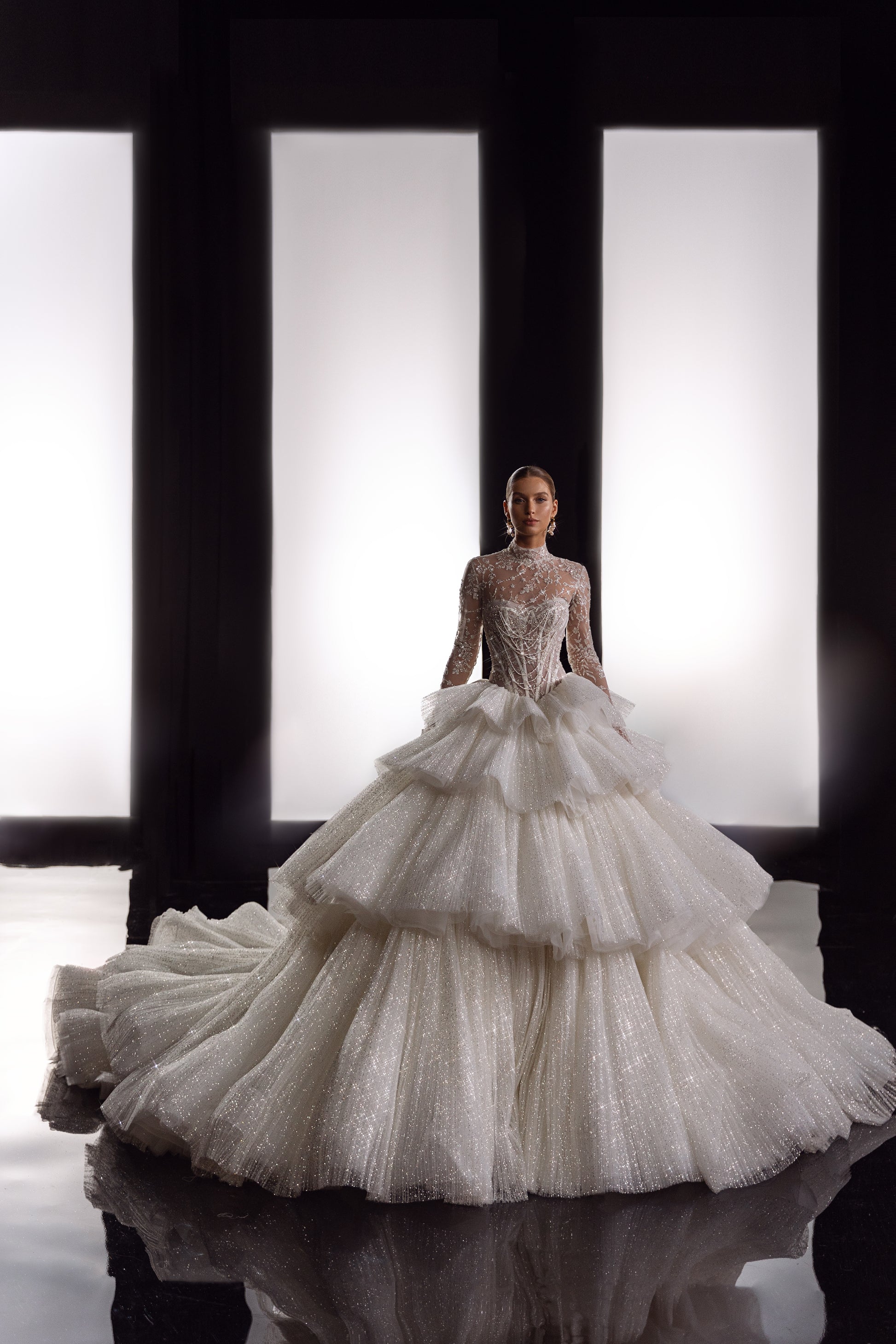 This cappuccino couture masterpiece blends a majestic four-level pleated glitter tulle skirt with a transparent, hand-beaded corset. Rich and structured, its basque waistline and intricate details contrast boldly with the gown’s tender romance, flowing into a very long, fluffy princess trail—perfect for a bride embracing striking elegance.