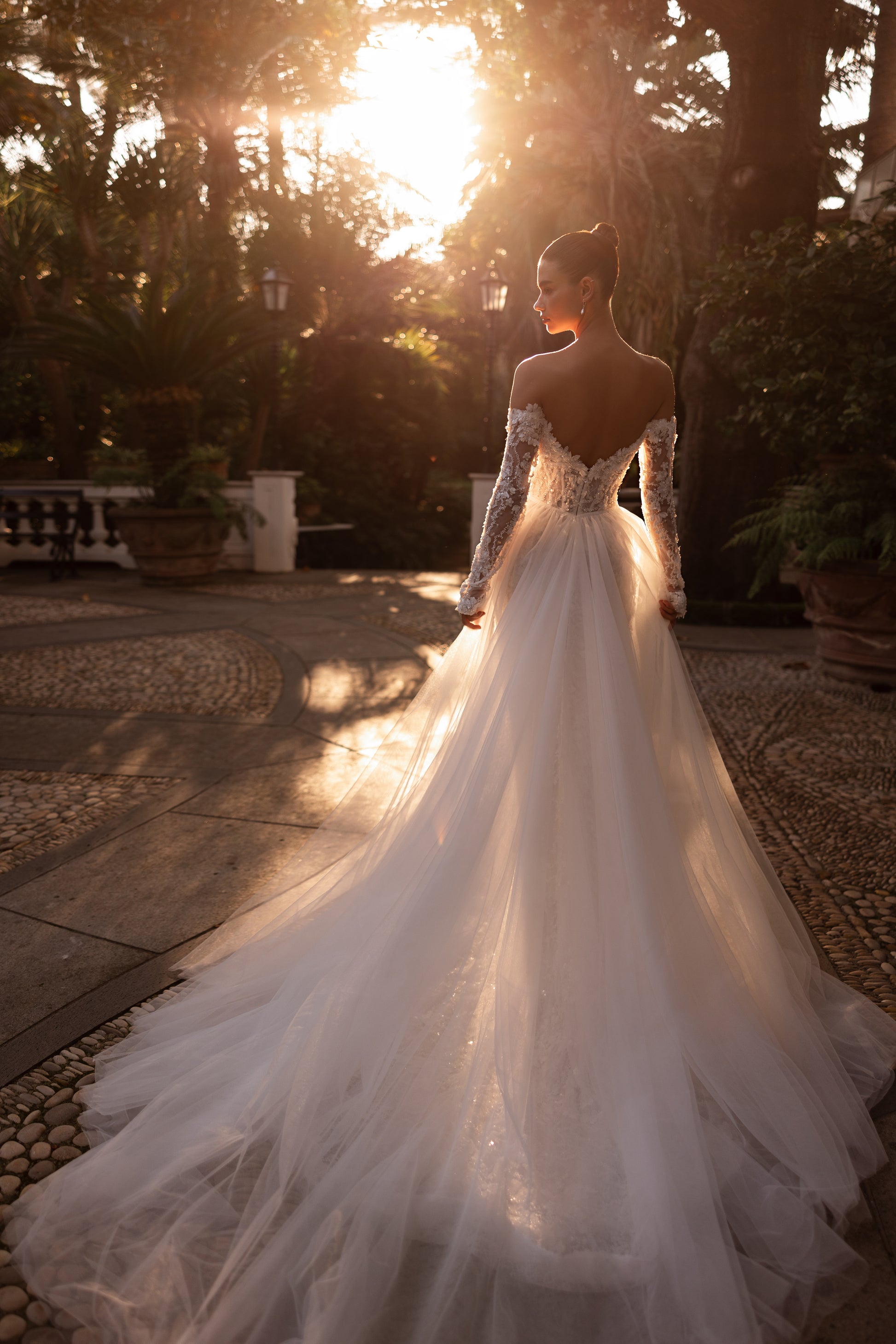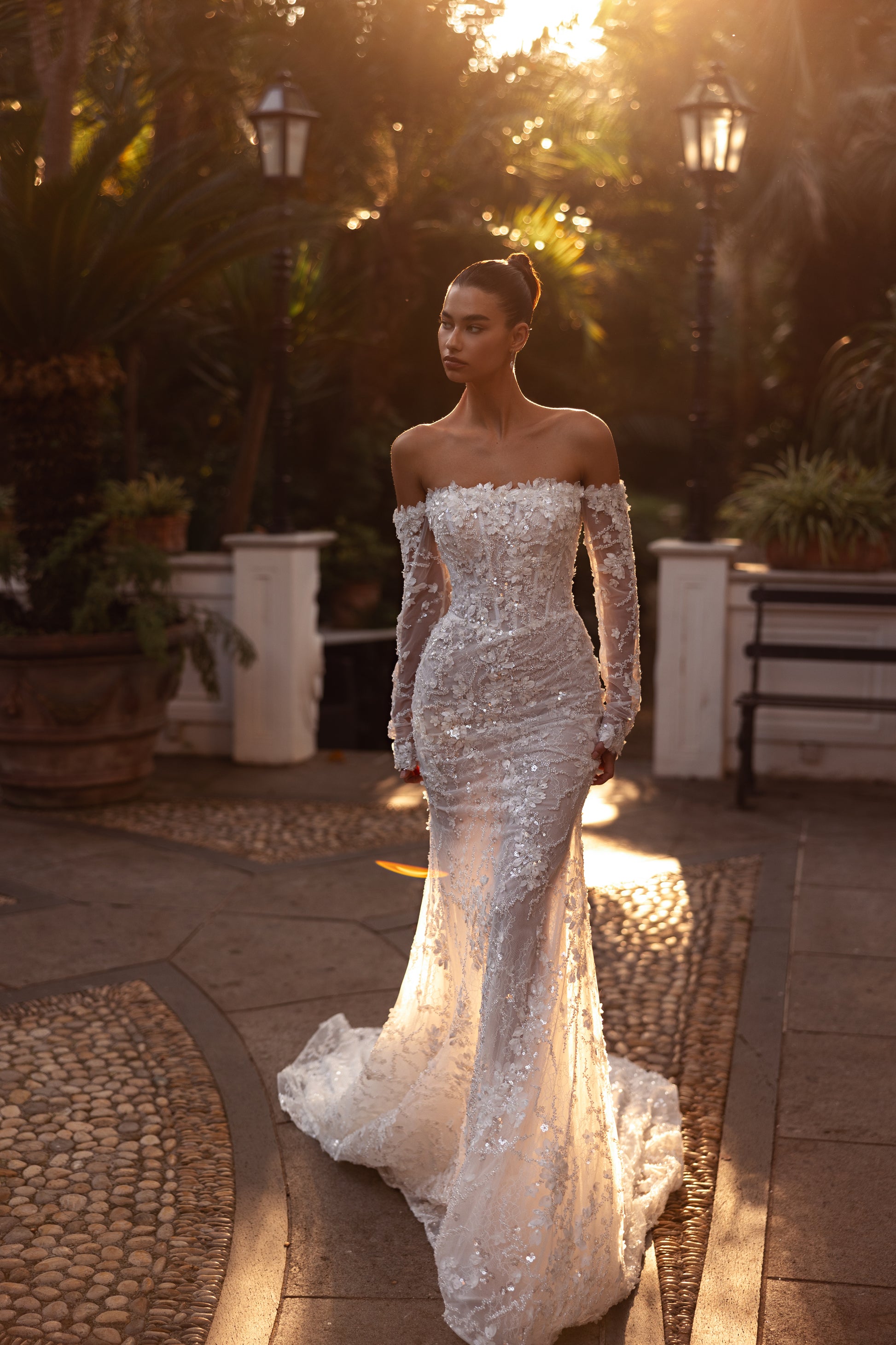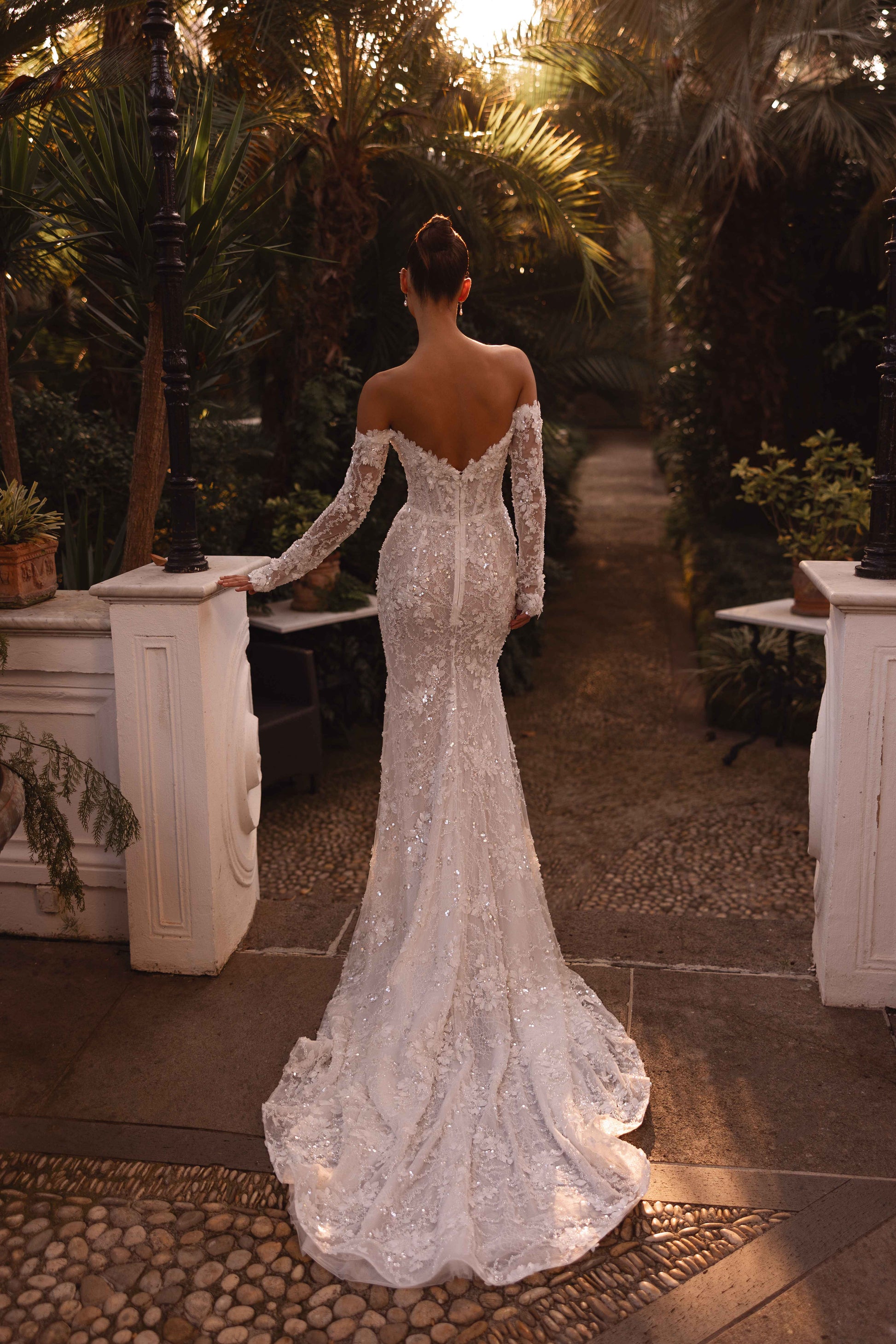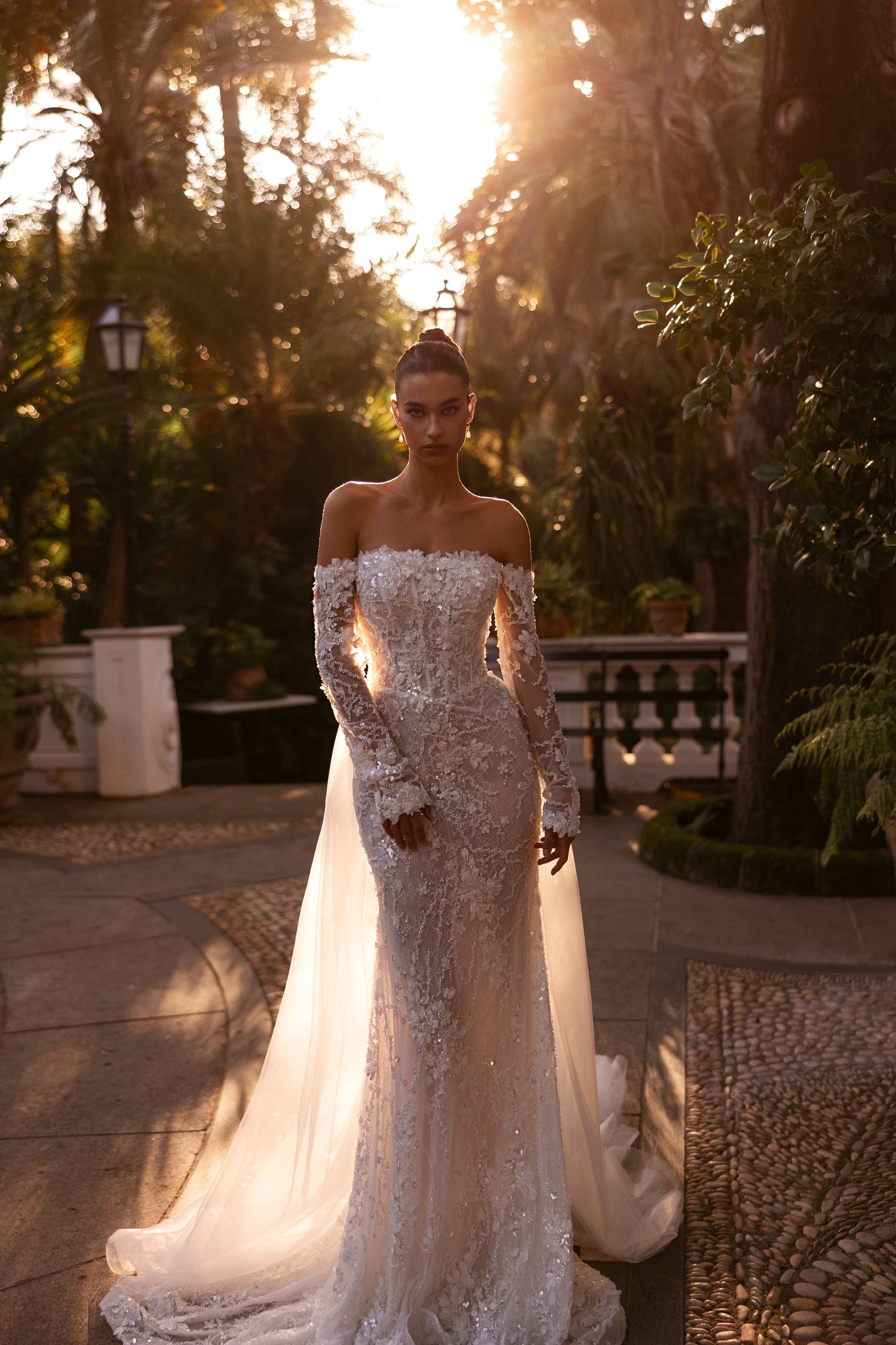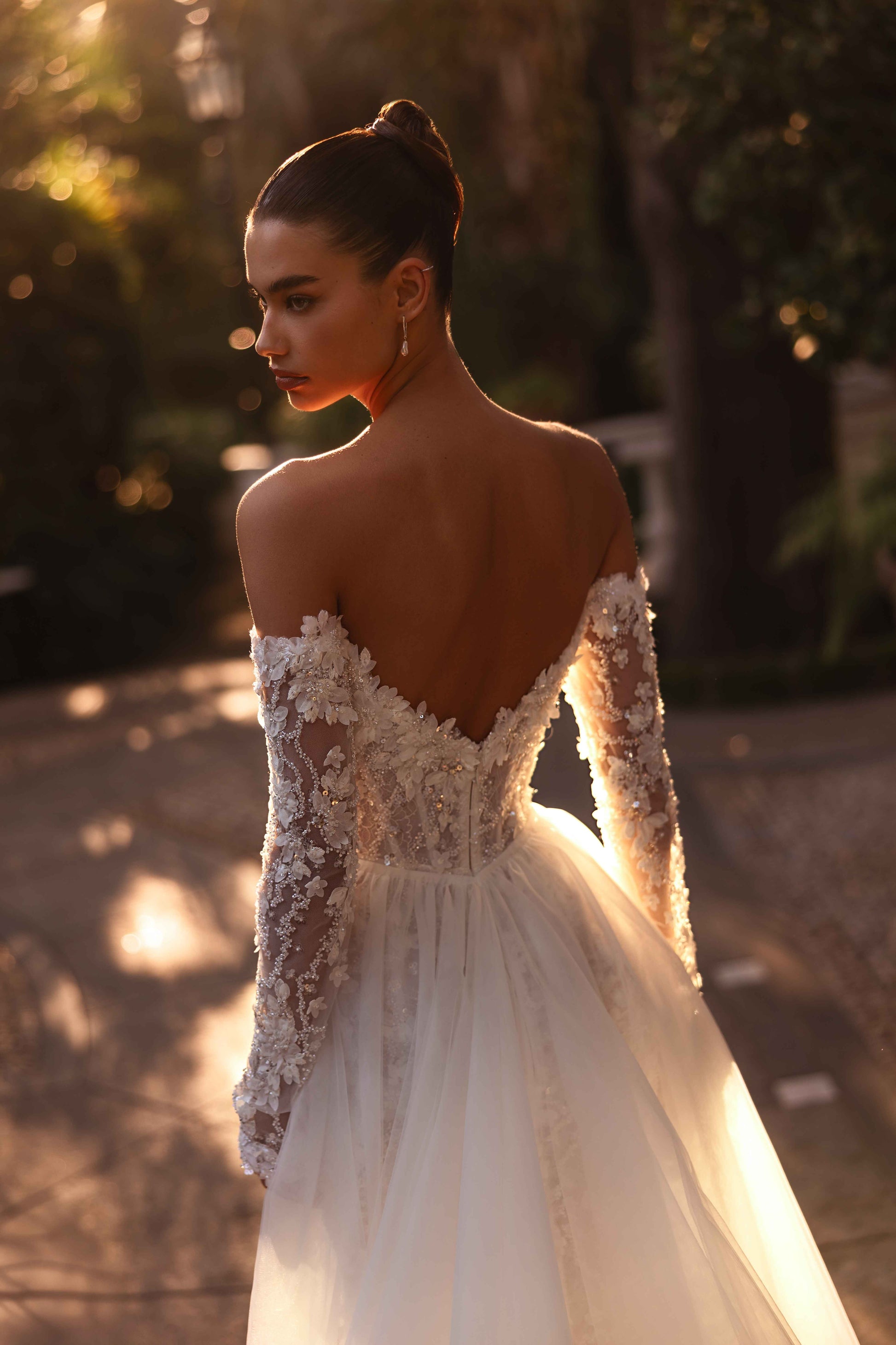 Glittering with 3D beaded lace, guipure, and sequins, this off-shoulder ivory gown dazzles with divine charm. The hand-made decoration on the décolletage and sleeves adds a bespoke touch, while the open back highlights your silhouette, radiating confident elegance. The detachable tulle skirt offers versatility, making Arabelle the couture masterpiece for the bride who loves regal sparkle with a personal twist.
