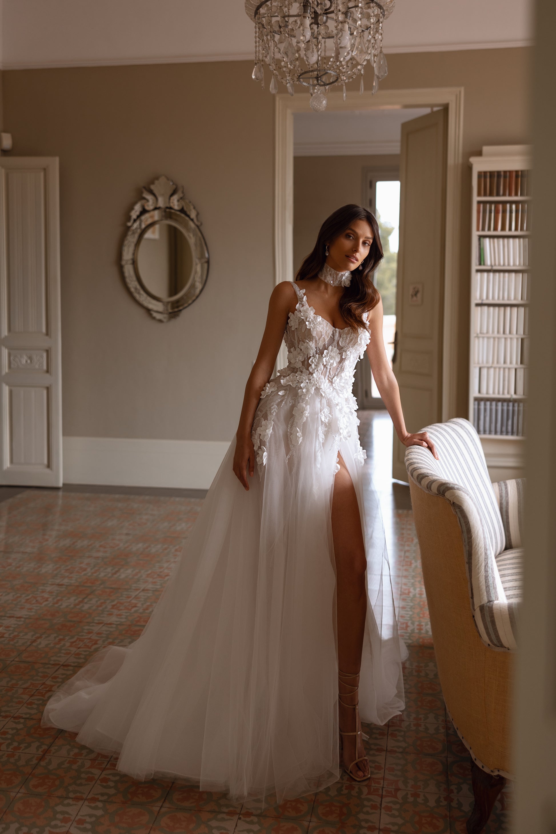 This ivory tulle gown is a dream come true for the romantic bride. Delicate lace with beading and 3D flowers embellish the bodice, while the flowing train is adorned with more blooms for a soft, ethereal touch. A slit and open back enhance its allure, completed with a chic matching choker for an elegant finish.