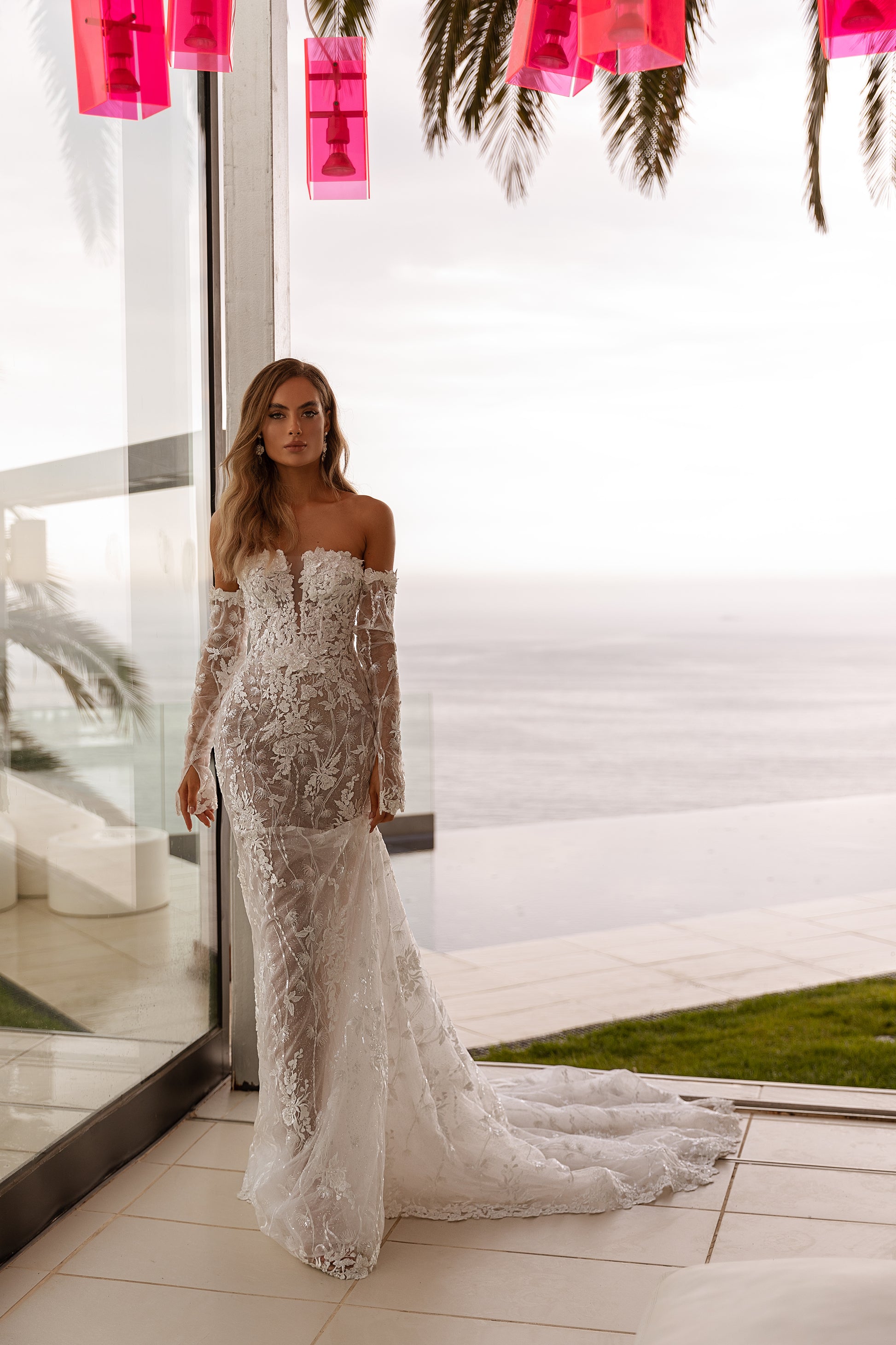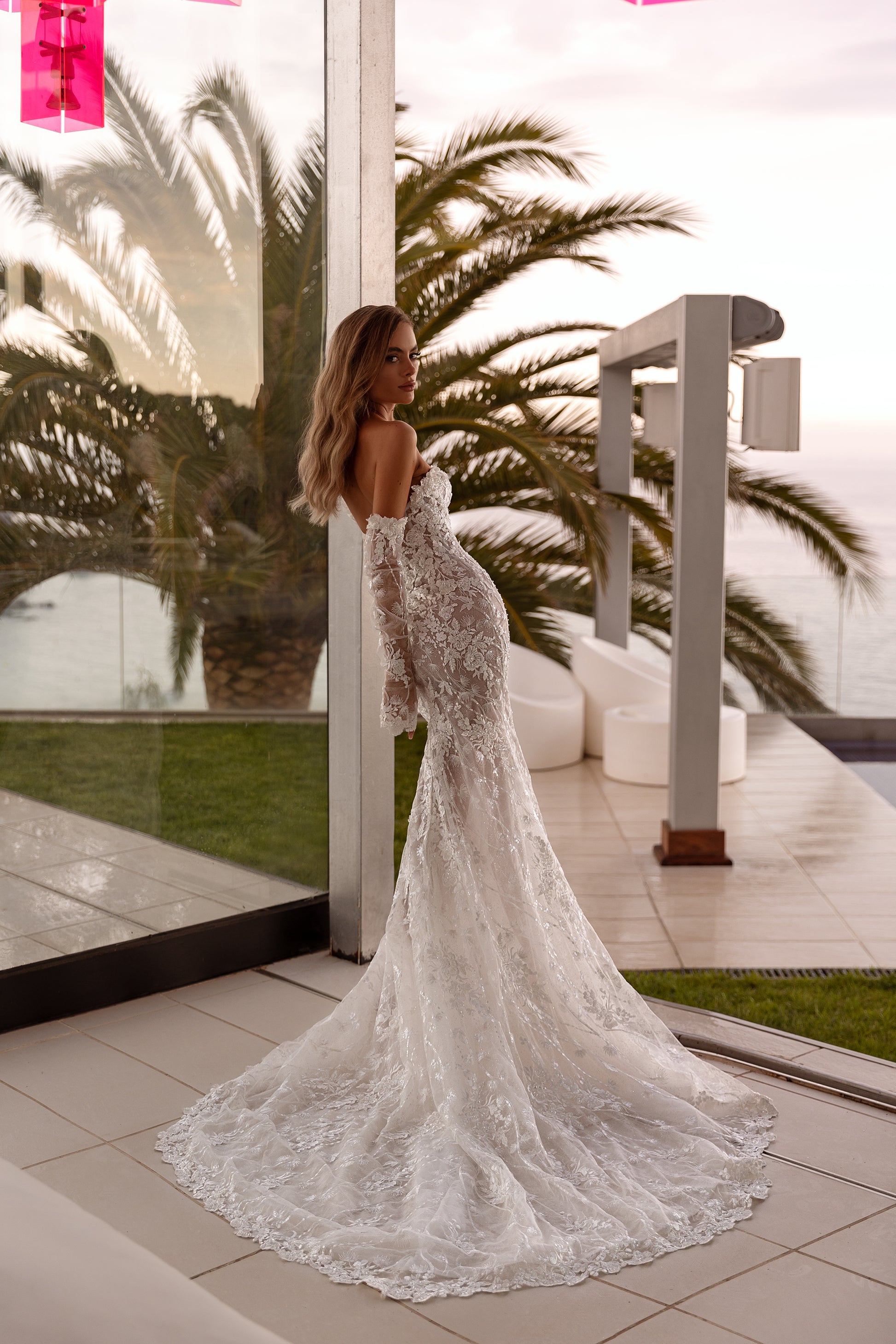 A gown that commands attention, Ayla is an embodiment of romance and luxury. The ivory guipure, kissed with pearls and beads, dances with light, radiating an air of timeless elegance. Its mermaid silhouette is made for a bride who exudes ethereal grace, while the detachable sleeves bring a touch of magic.
