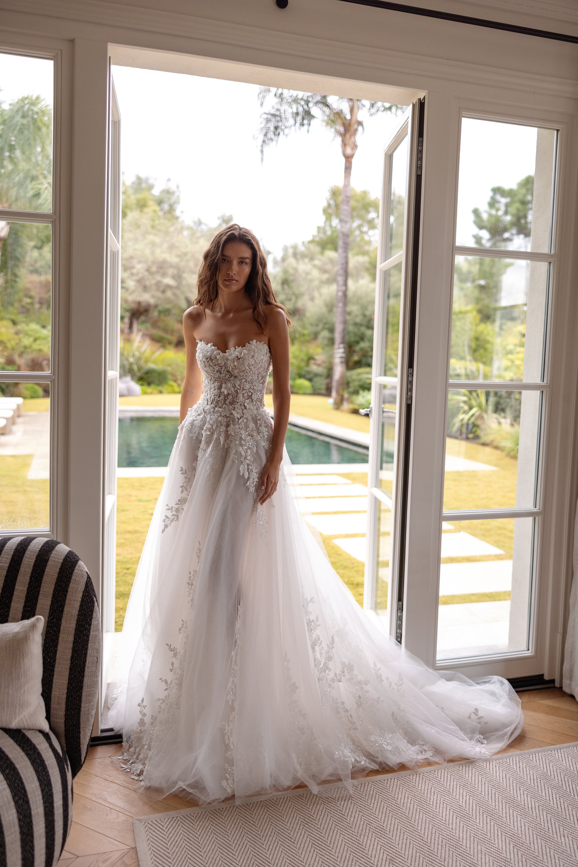 An airy A-line gown with a softly sculpted sweetheart corset, designed to fit like a second skin and highlight the waist with precision. 3D lace, delicate beading, and subtle sequins create an elegant glow, while layers of tulle and organza add light volume and effortless movement.