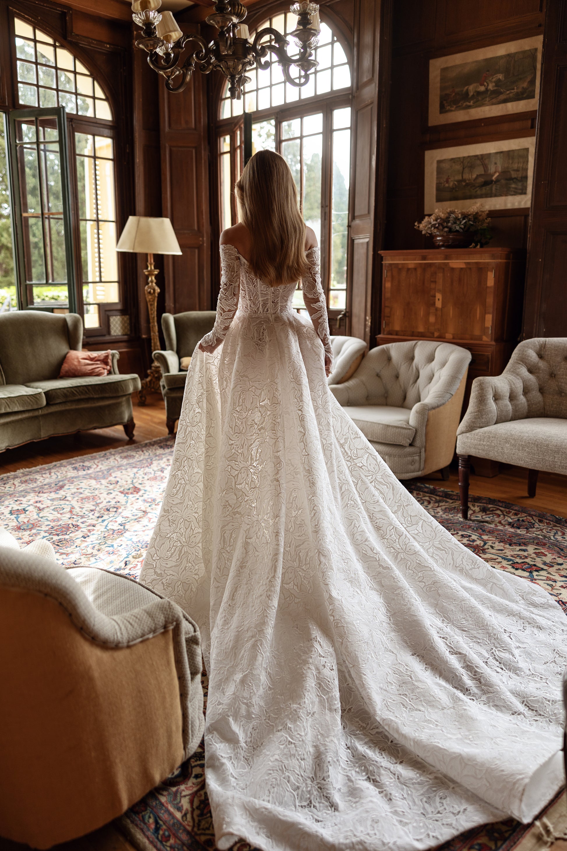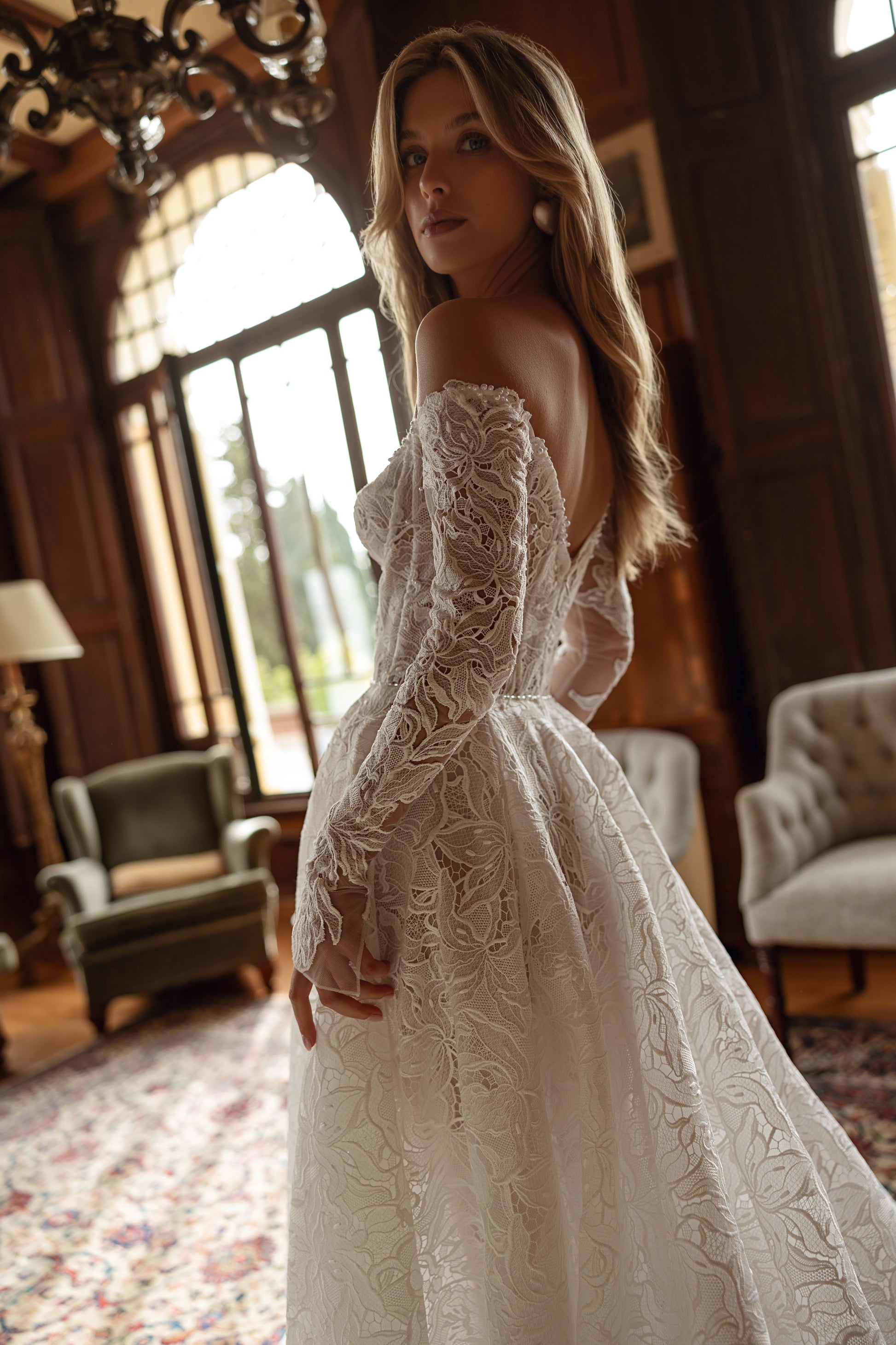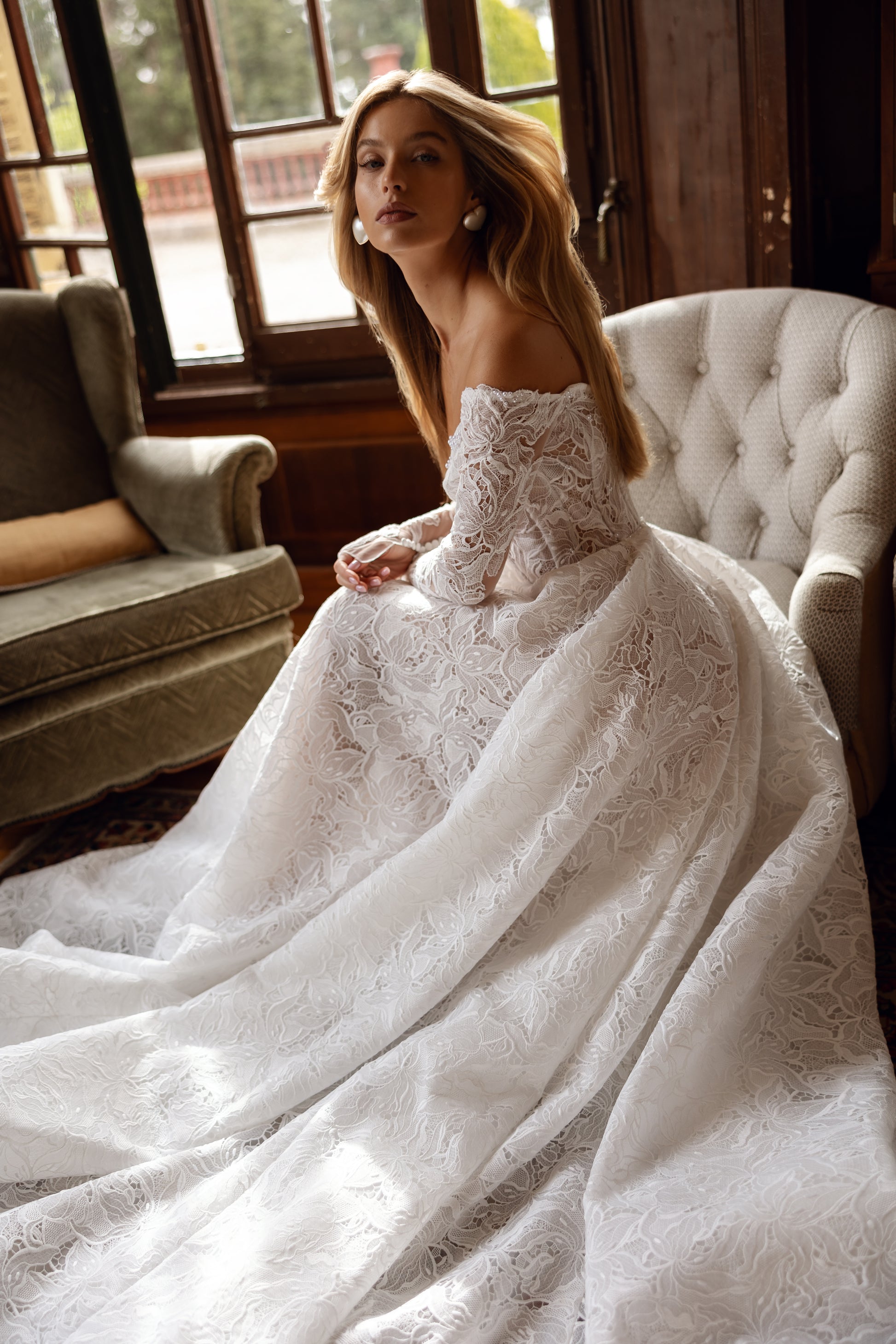 A perfect blend of romance and boldness, this hand-made tulle gown features a sweetheart neckline, off-the-shoulder design, and long, form-fitting sleeves. Intricate lace, beads, and pearls add an exquisite touch, while the train completes the look of a bride who knows exactly what she wants, yet embraces her soft side.
