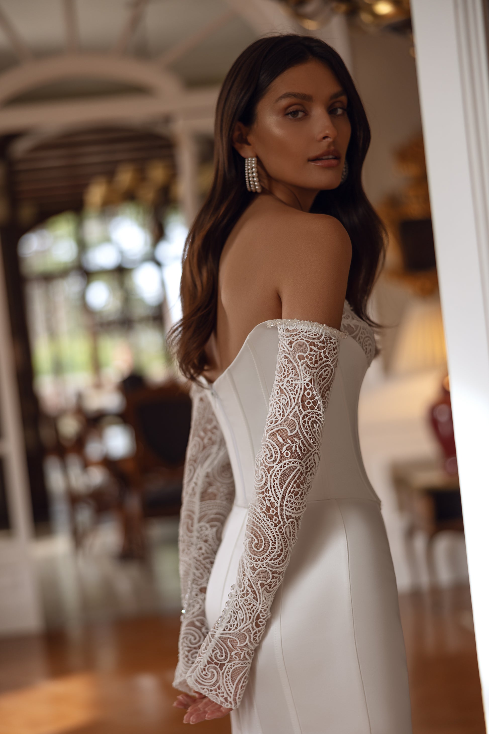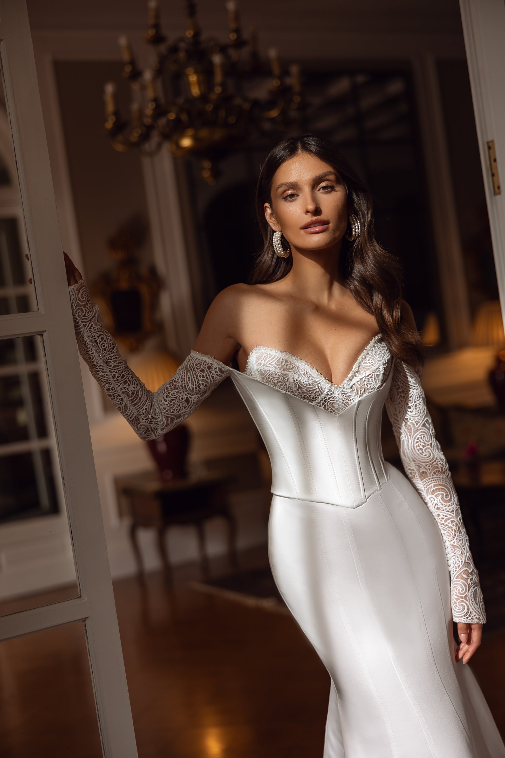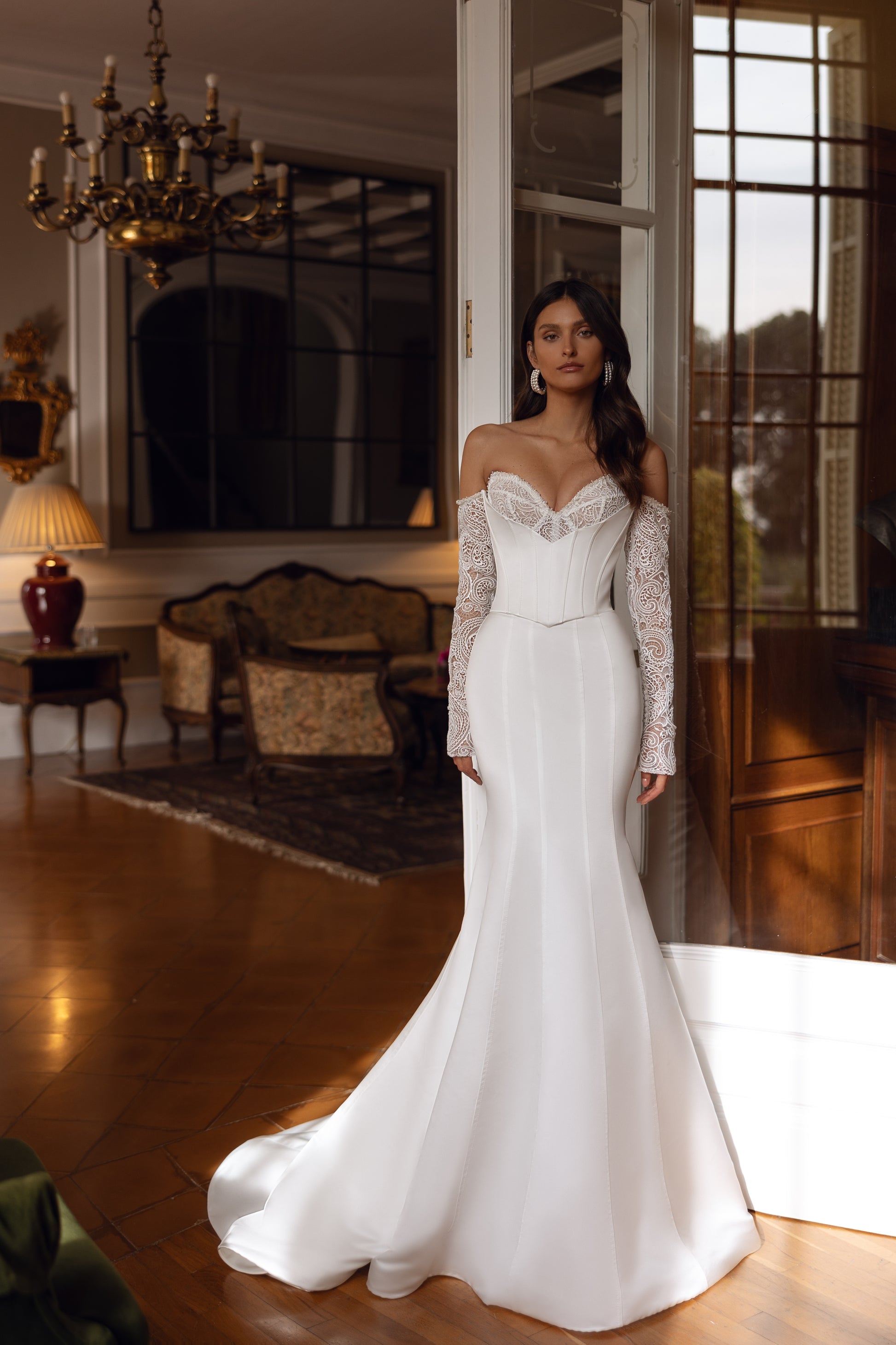 Featuring a satin skirt and lace bodice with removable satin detailing and delicate lace sleeves, this mermaid gown creates a strikingly elegant and seductive look. Bold yet graceful, itʼs a powerful choice for the bride who demands attention and sophistication on her wedding day.