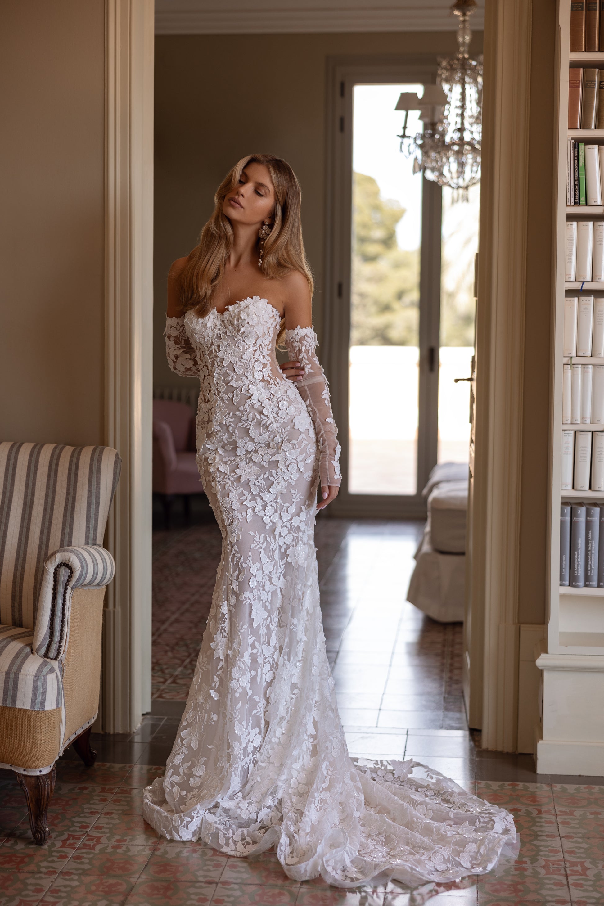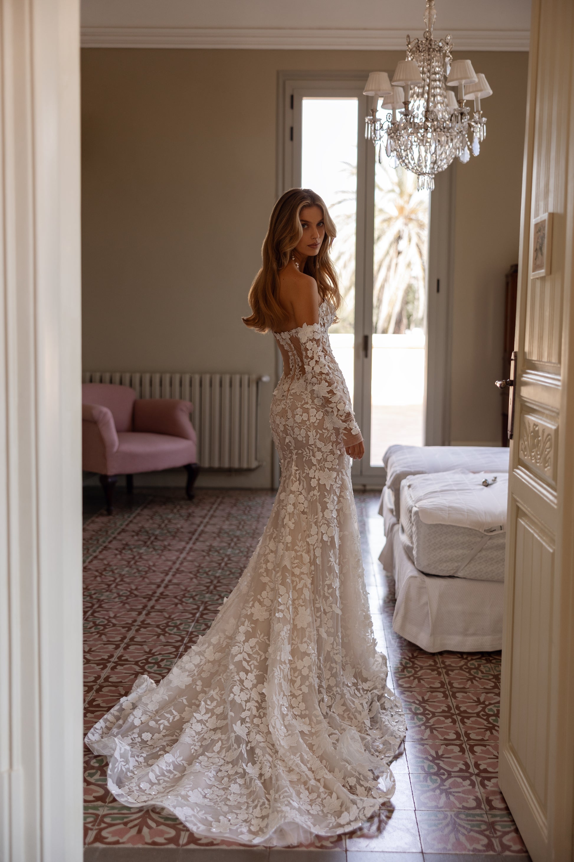 This cappuccino mermaid gown exudes romance with its sweetheart neckline, magnificent floral train, and detachable, delicate sleeves. The intricately placed flowers create an enchanting effect, appearing to float like butterflies around the bride. A perfect blend of elegance and allure, itʼs a captivating choice for any romantic bride.
