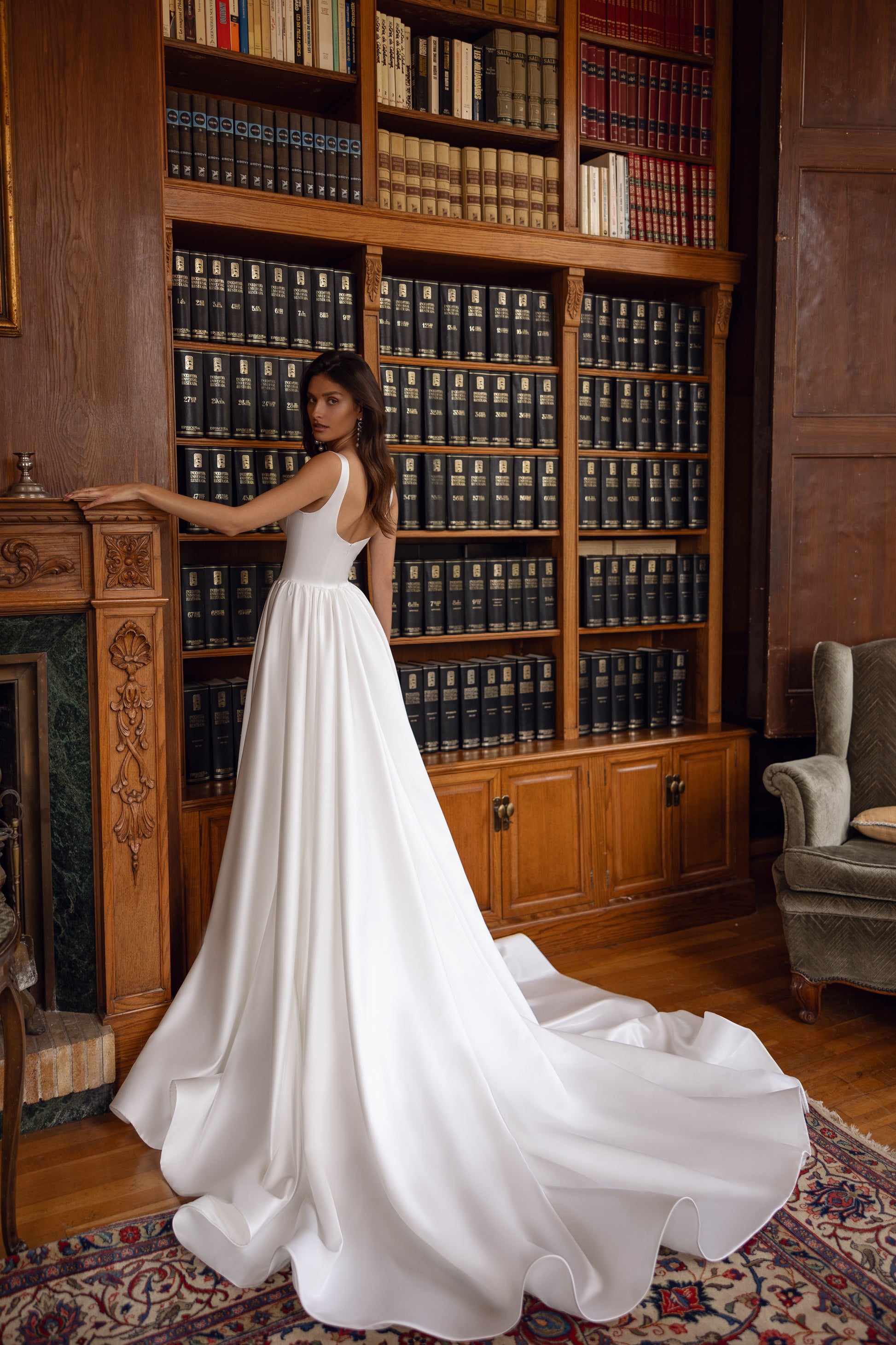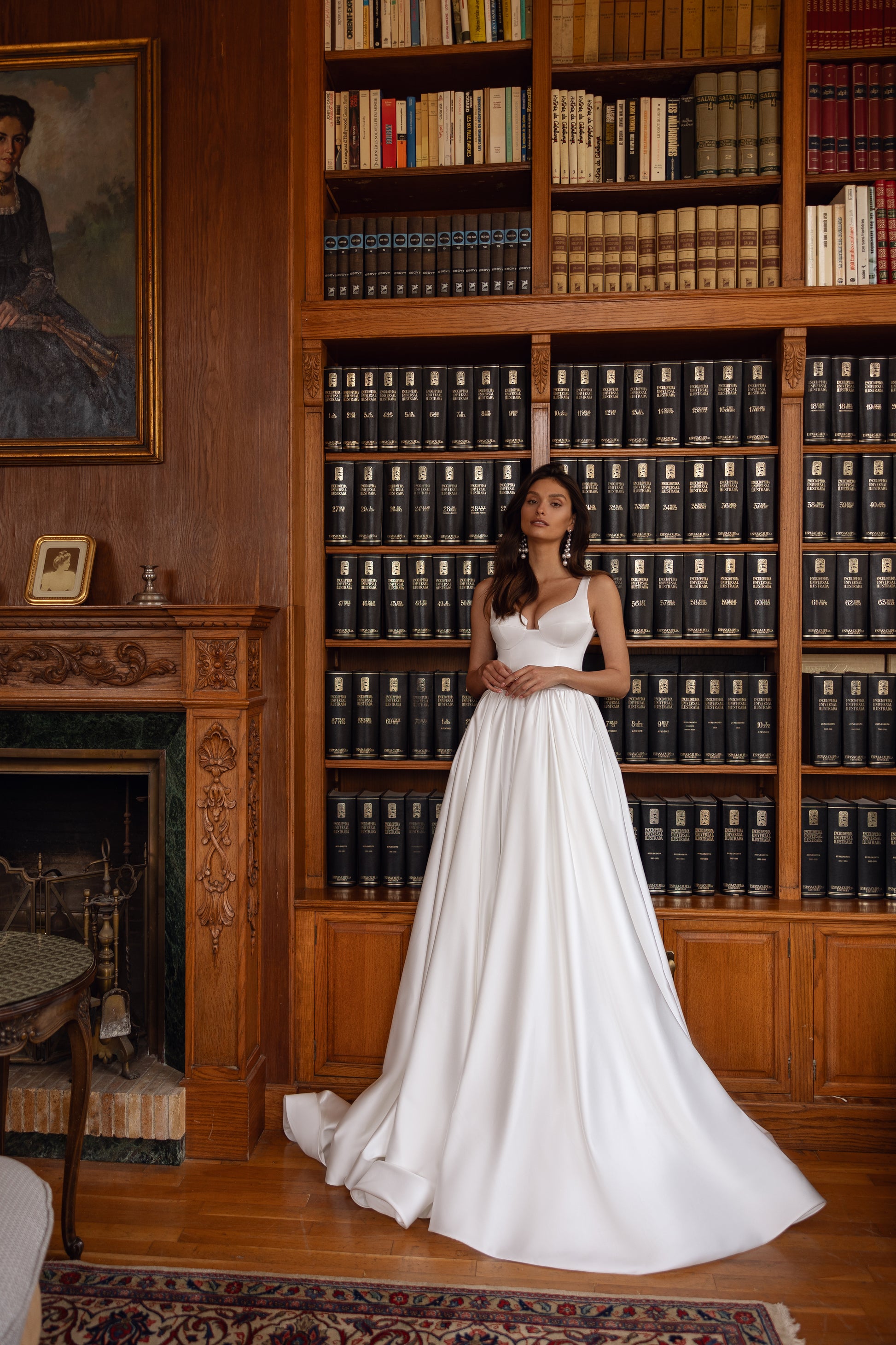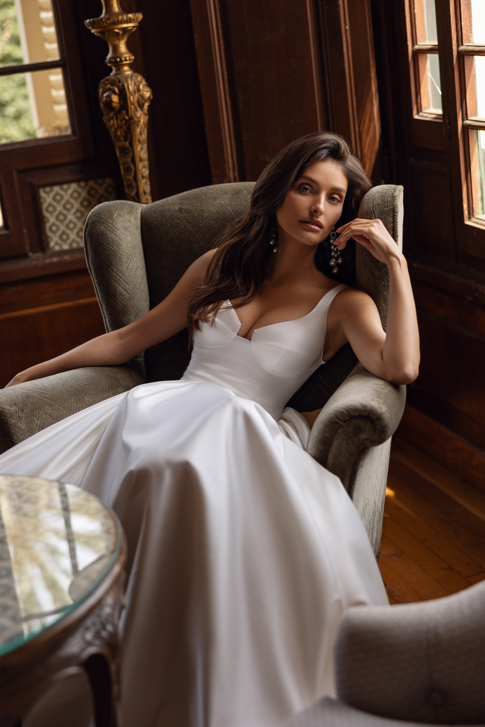This couture ivory satin gown makes a bold statement with its majestic presence. The intricate neckline adds sophistication, while the clean, simple lines highlight its refined elegance. A perfect balance of royal beauty and modern allure, this dress is designed for the bride who exudes confidence and grace.