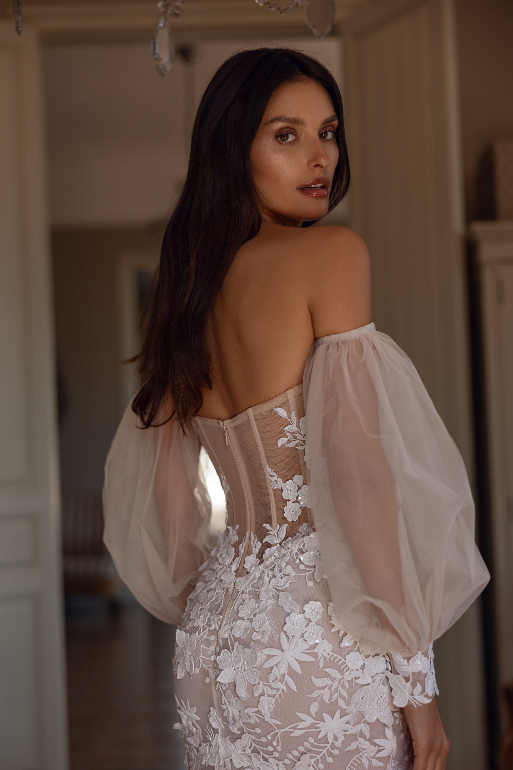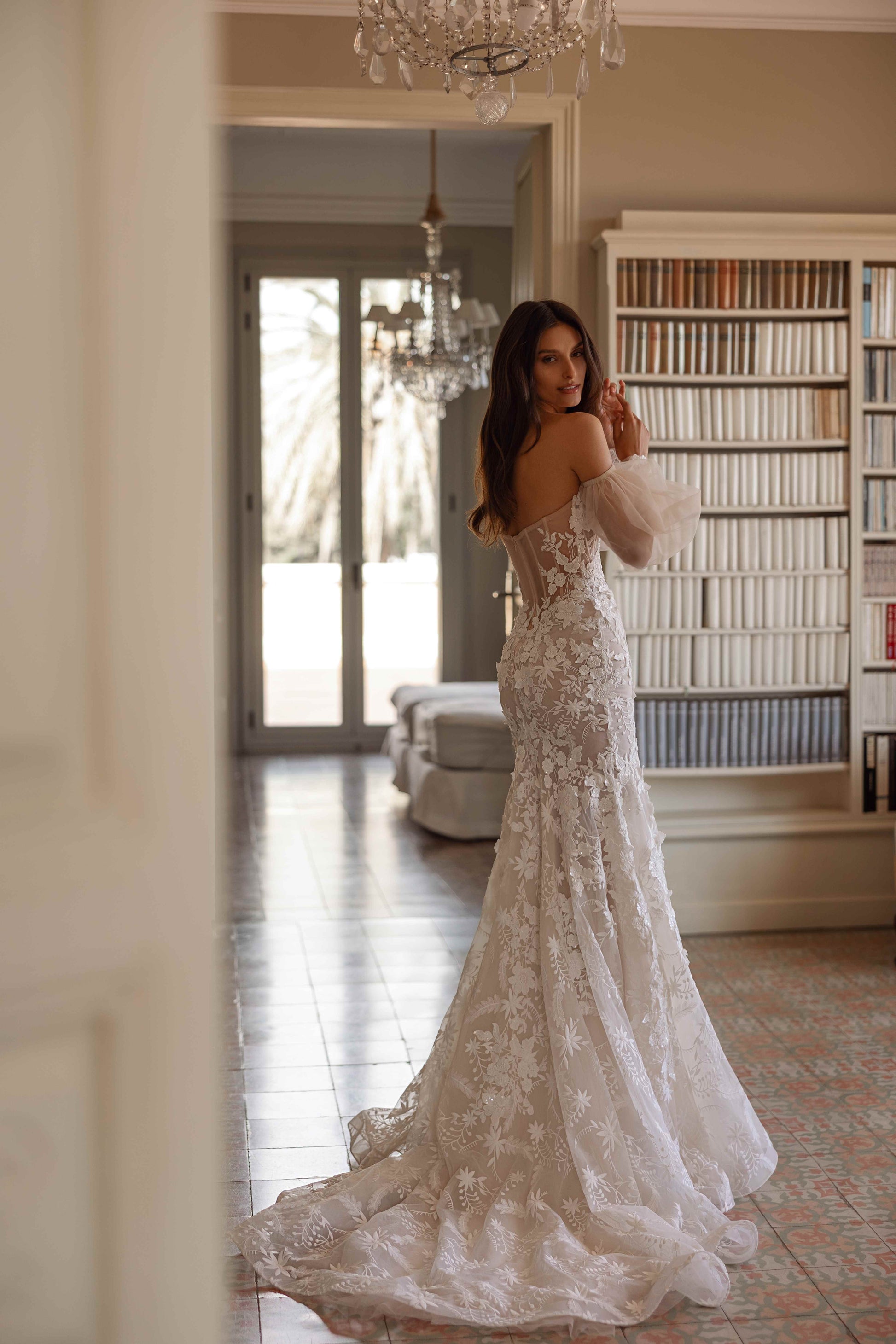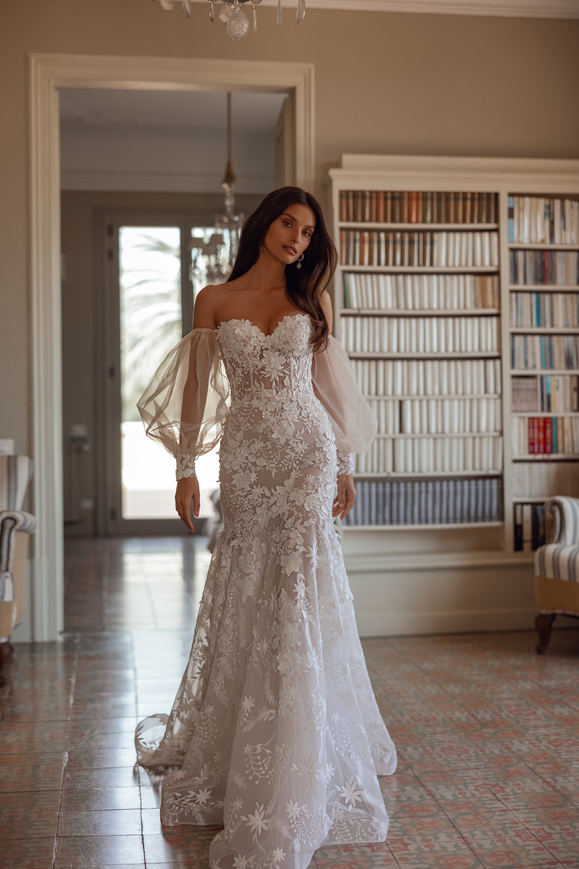 This cappuccino lace mermaid gown is adorned with intricate 3D flowers and a flattering sweetheart neckline. Airy cuffs add an ethereal touch, creating a soft, romantic look. The silhouette beautifully hugs the body, combining grace and elegance for a bride who desires a captivating, dreamlike appearance.