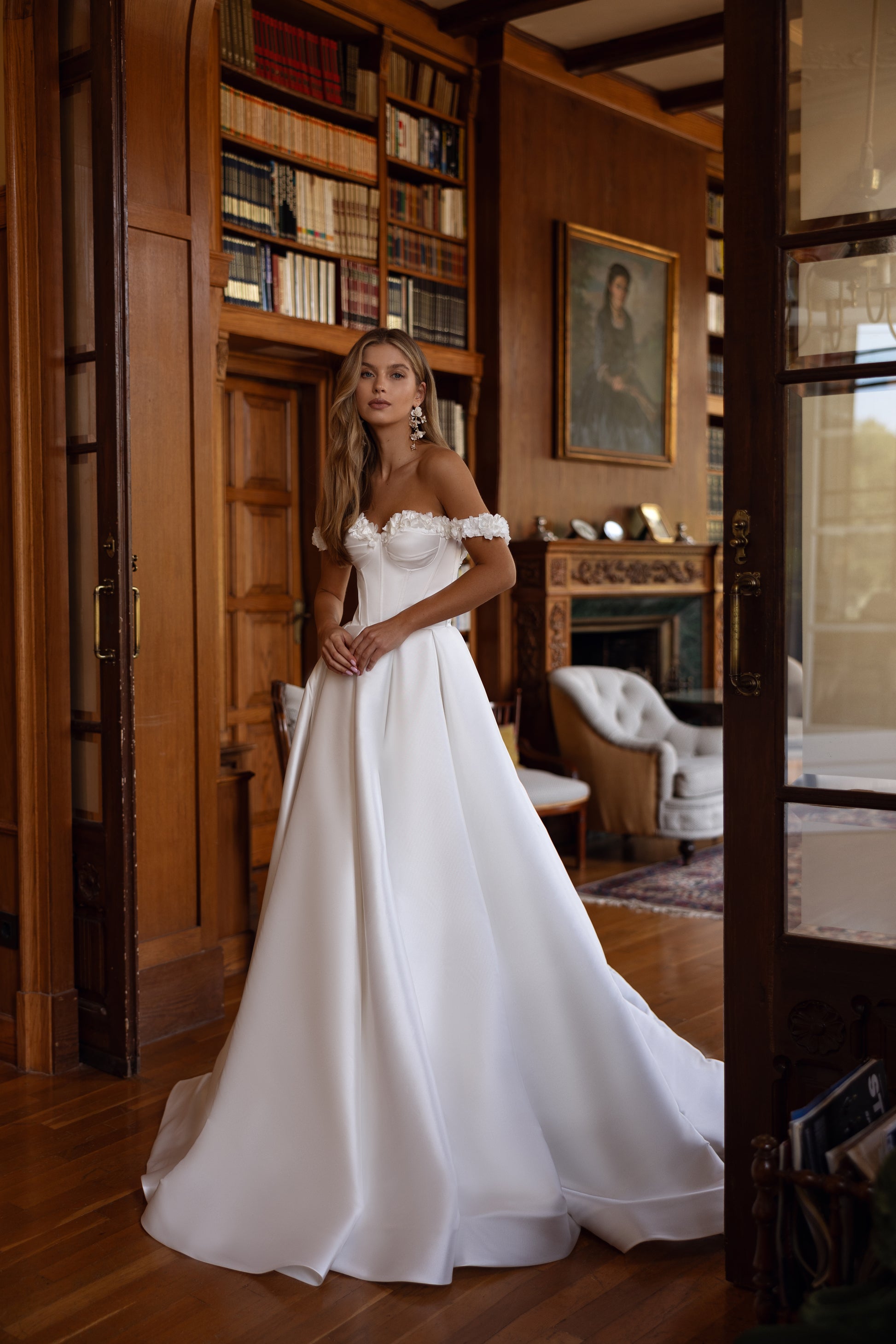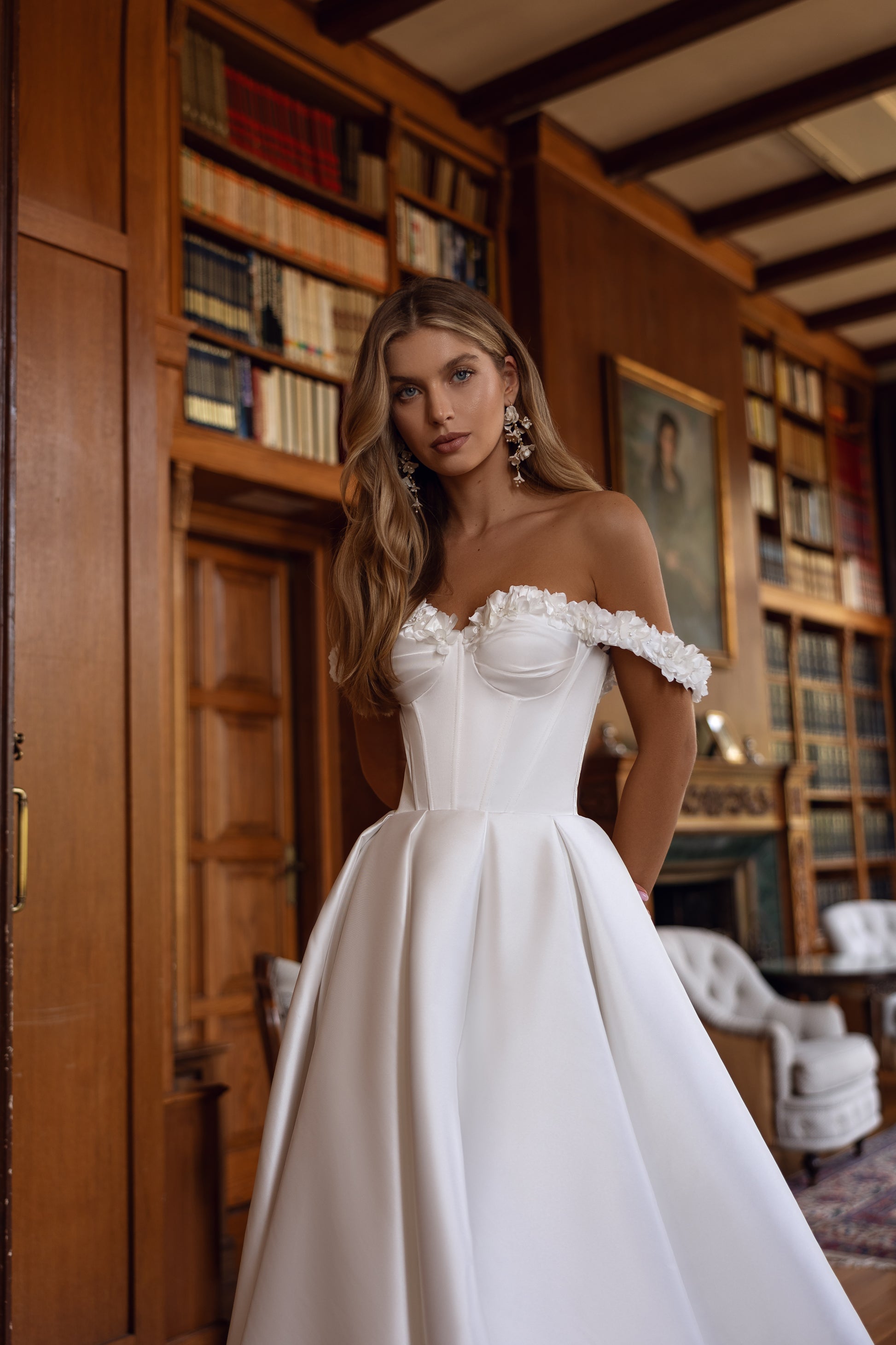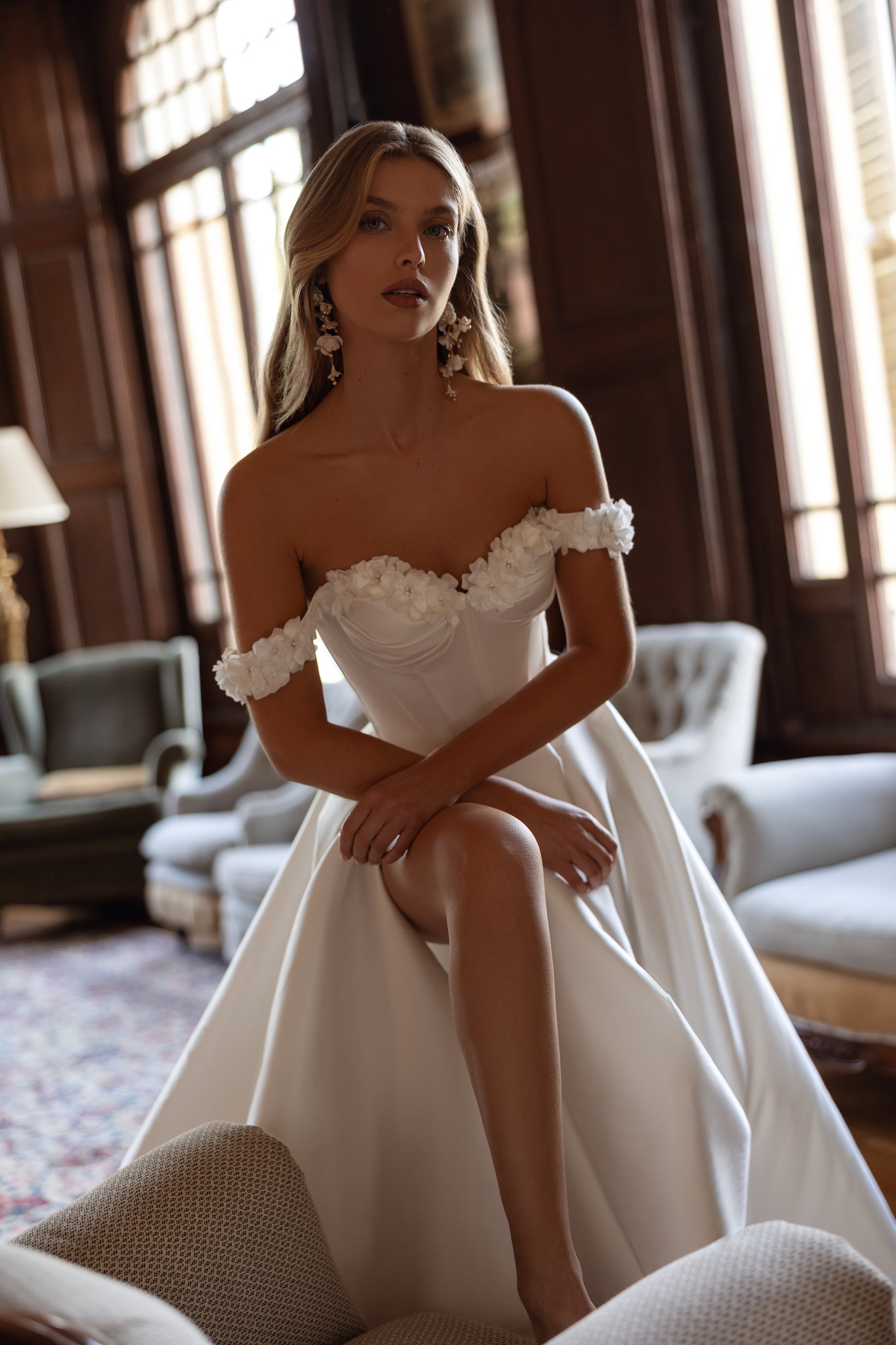 Exquisite ivory mikado gown featuring a sweetheart neckline and off-the-shoulder design adorned with delicate 3D flowers. Exuding extreme romance and refinement, its pure silhouette is elevated by the majestic beauty of the intricate floral details, making it a perfect choice for a sophisticated and dreamy bride.