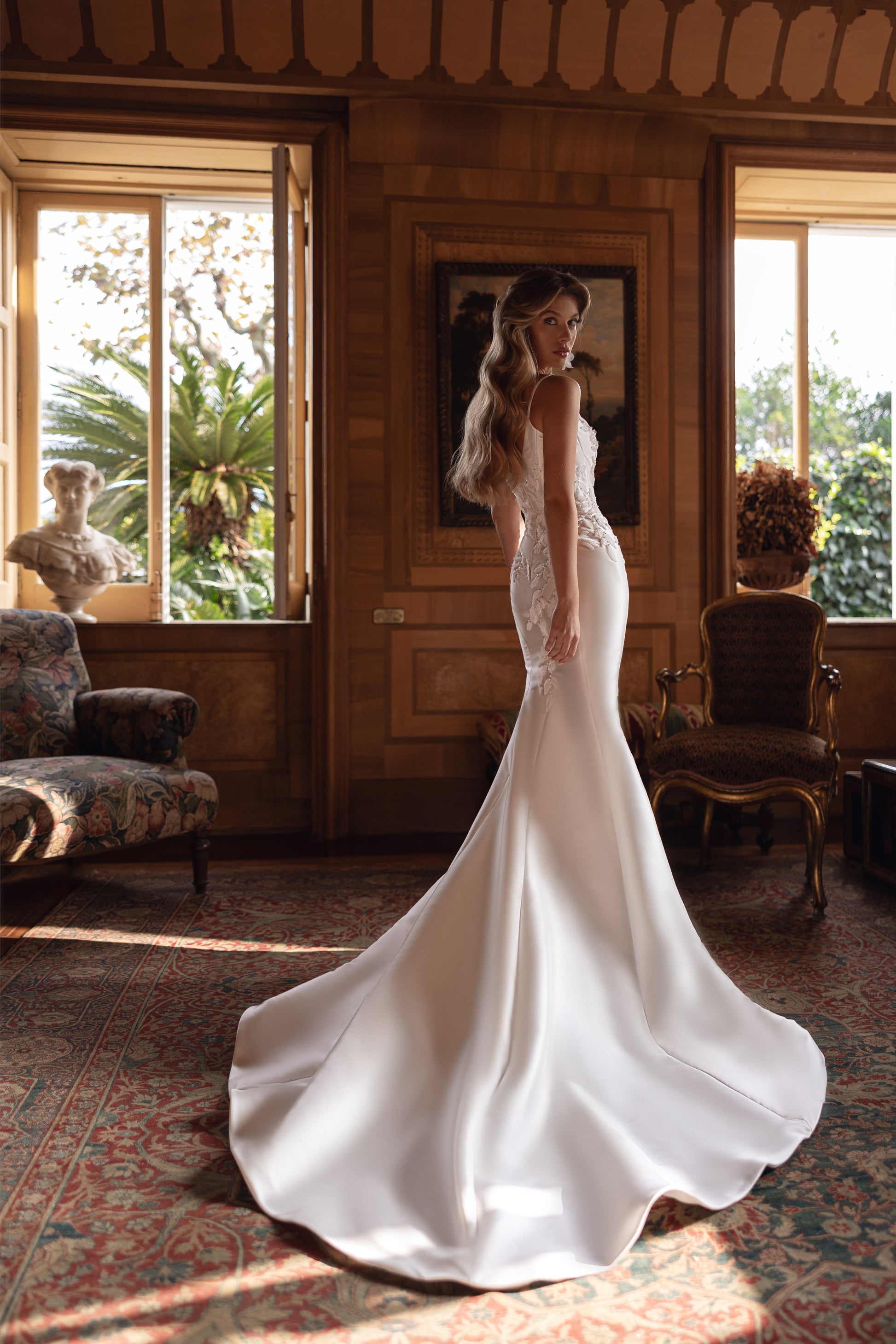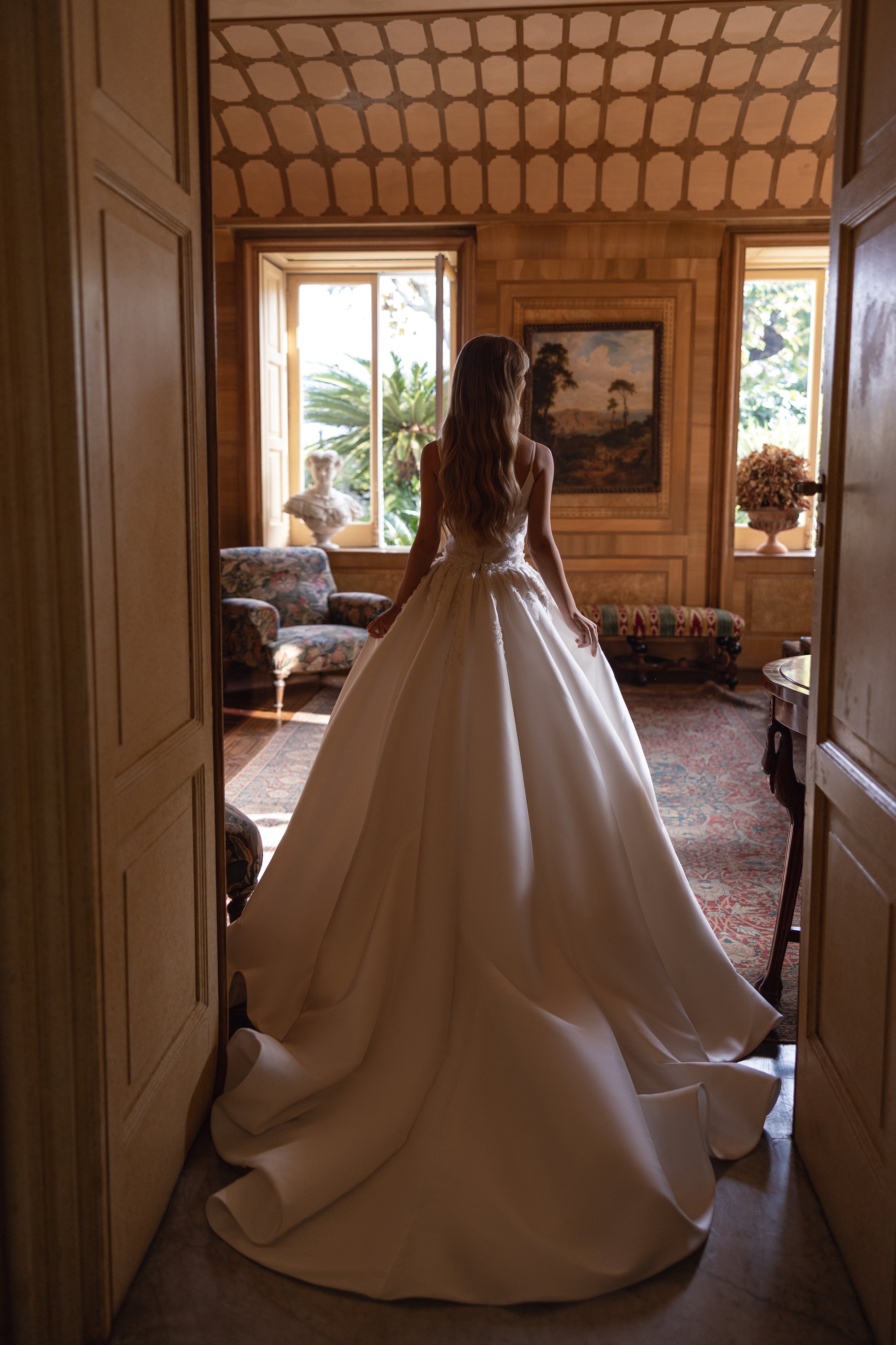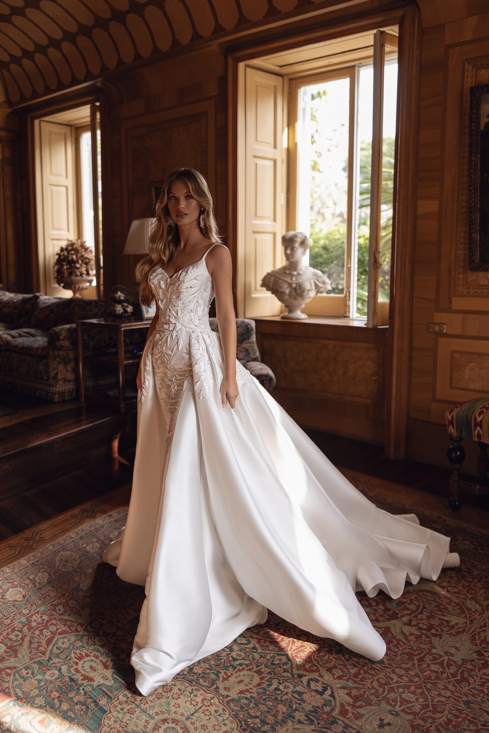 This ivory mikado gown is a lesson in delicate grandeur, with handcrafted patterns adorning its flowing silhouette. Guipure lace, beads, and 3D flowers create subtle embellishments, while the detachable princess-style skirt adds regal drama. Celine’s calm beauty is couture perfection for every bridal dream.