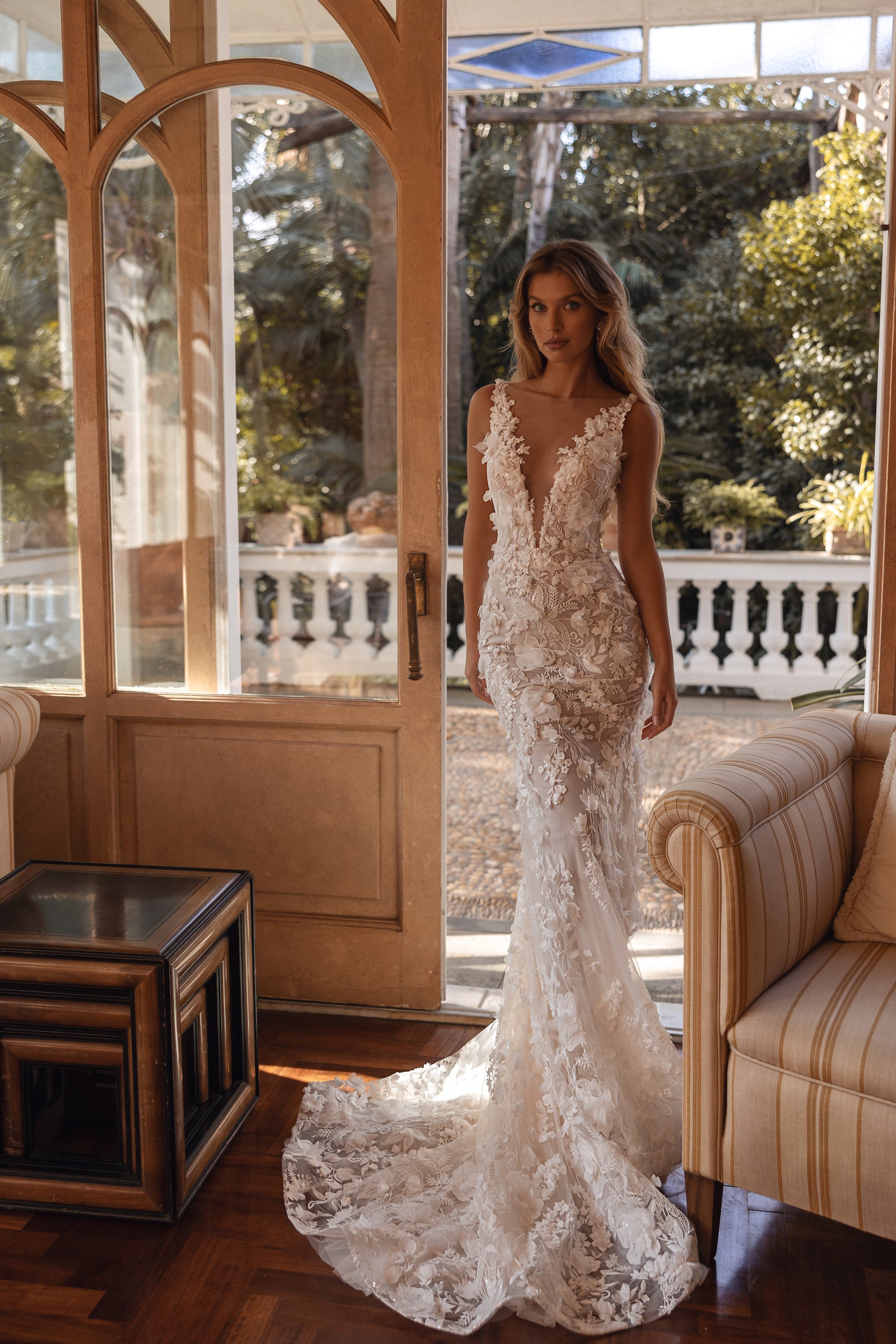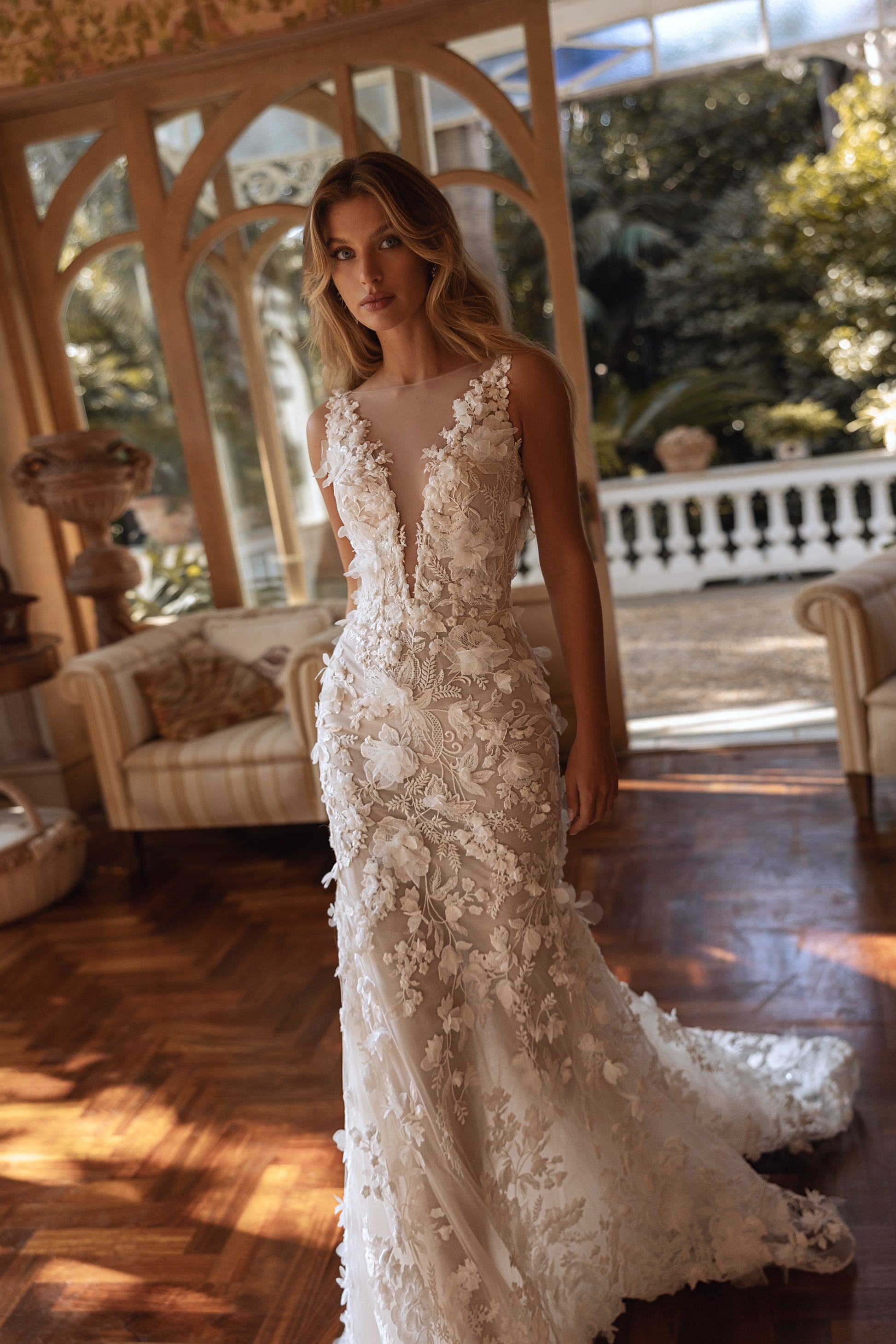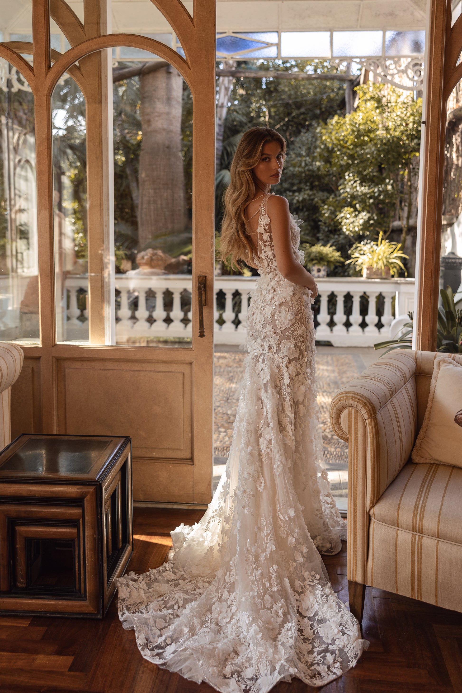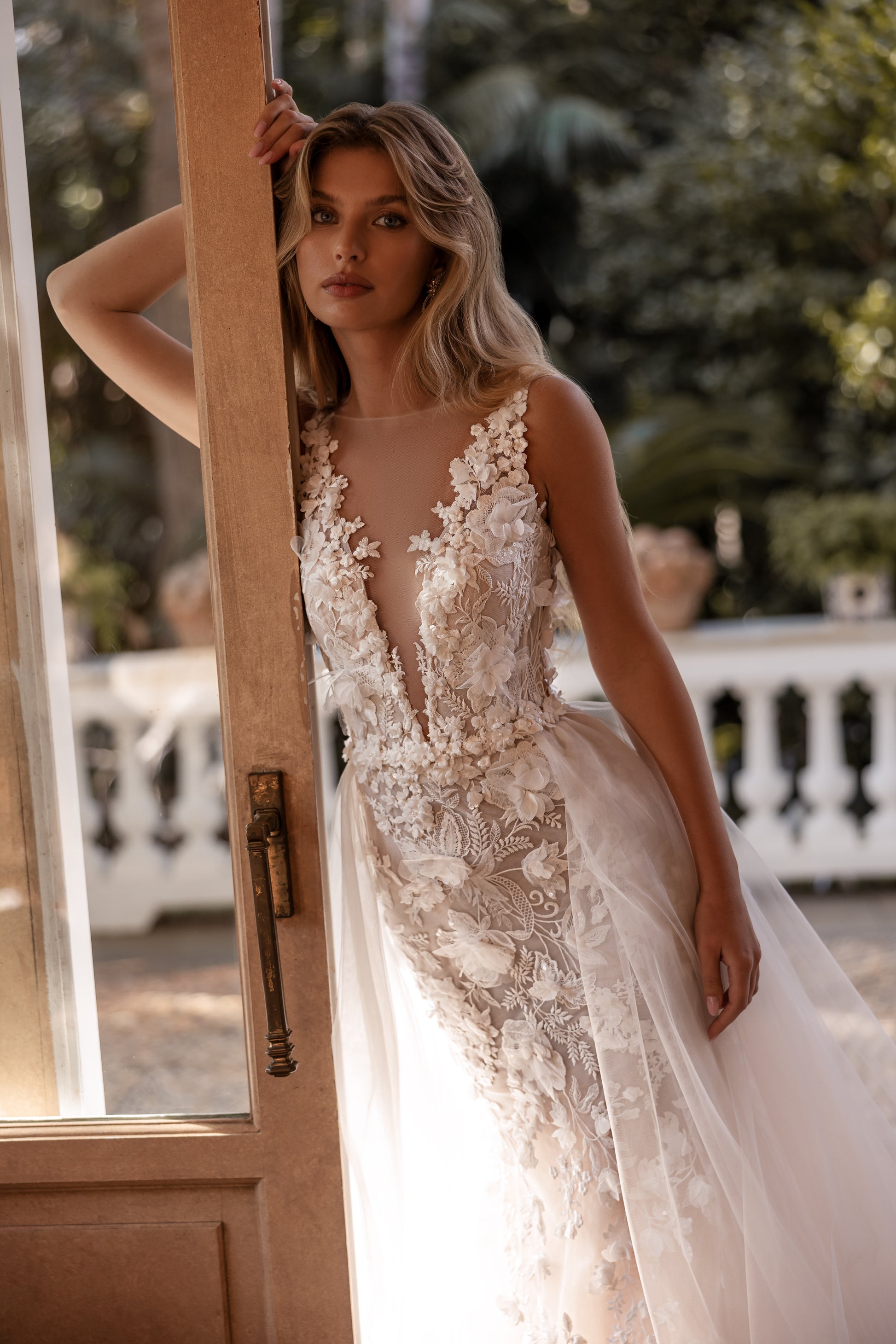 This cappuccino masterpiece feels like a floral goddess’ dream. Guipure lace, pearls, and 3D blooms form enchanting layers, while the hand-decorated corset with beaded straps on the back adds sophistication. A detachable tulle skirt with a hand-decorated belt enhances its ethereal charm, blending romantic elegance with mysterious allure.