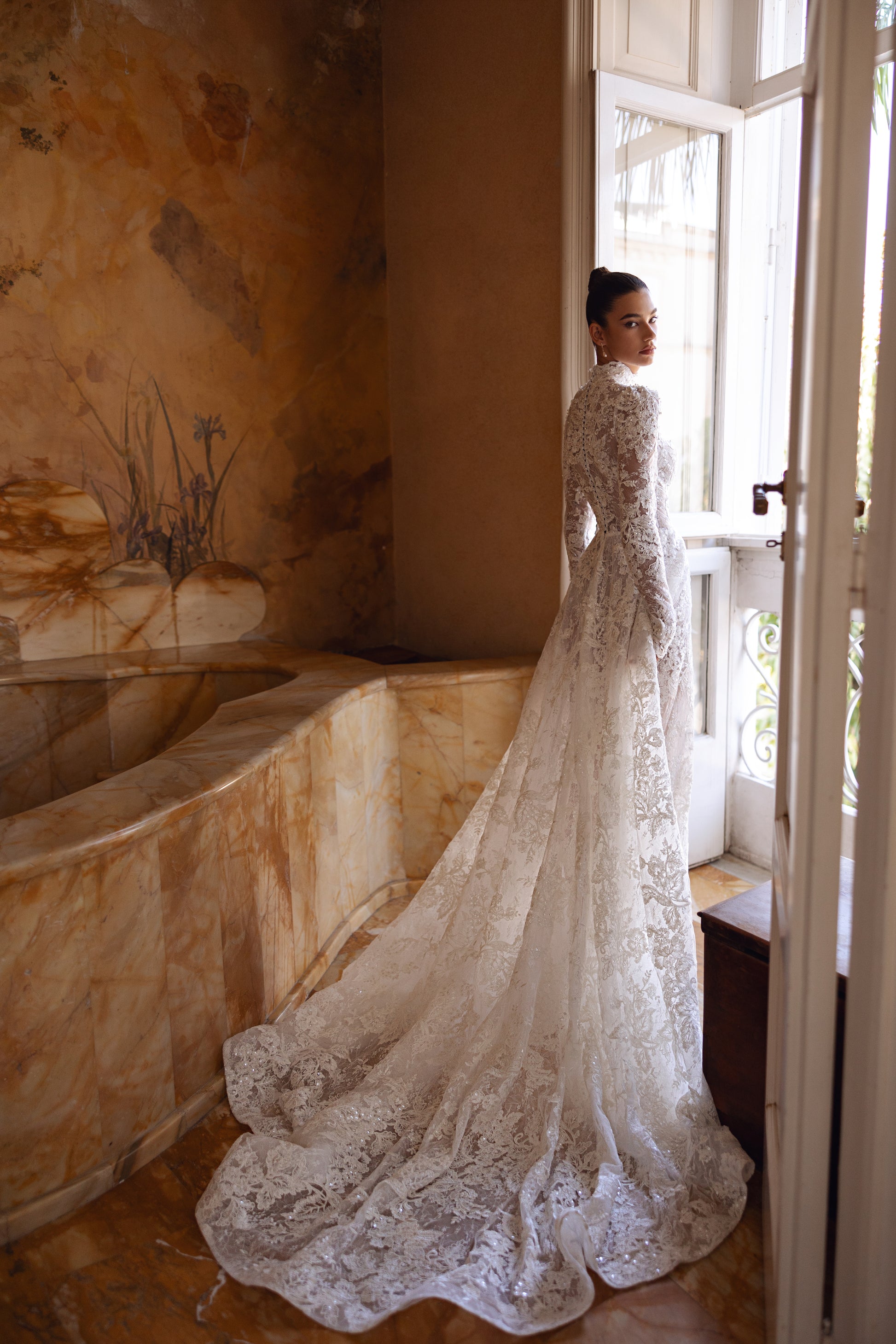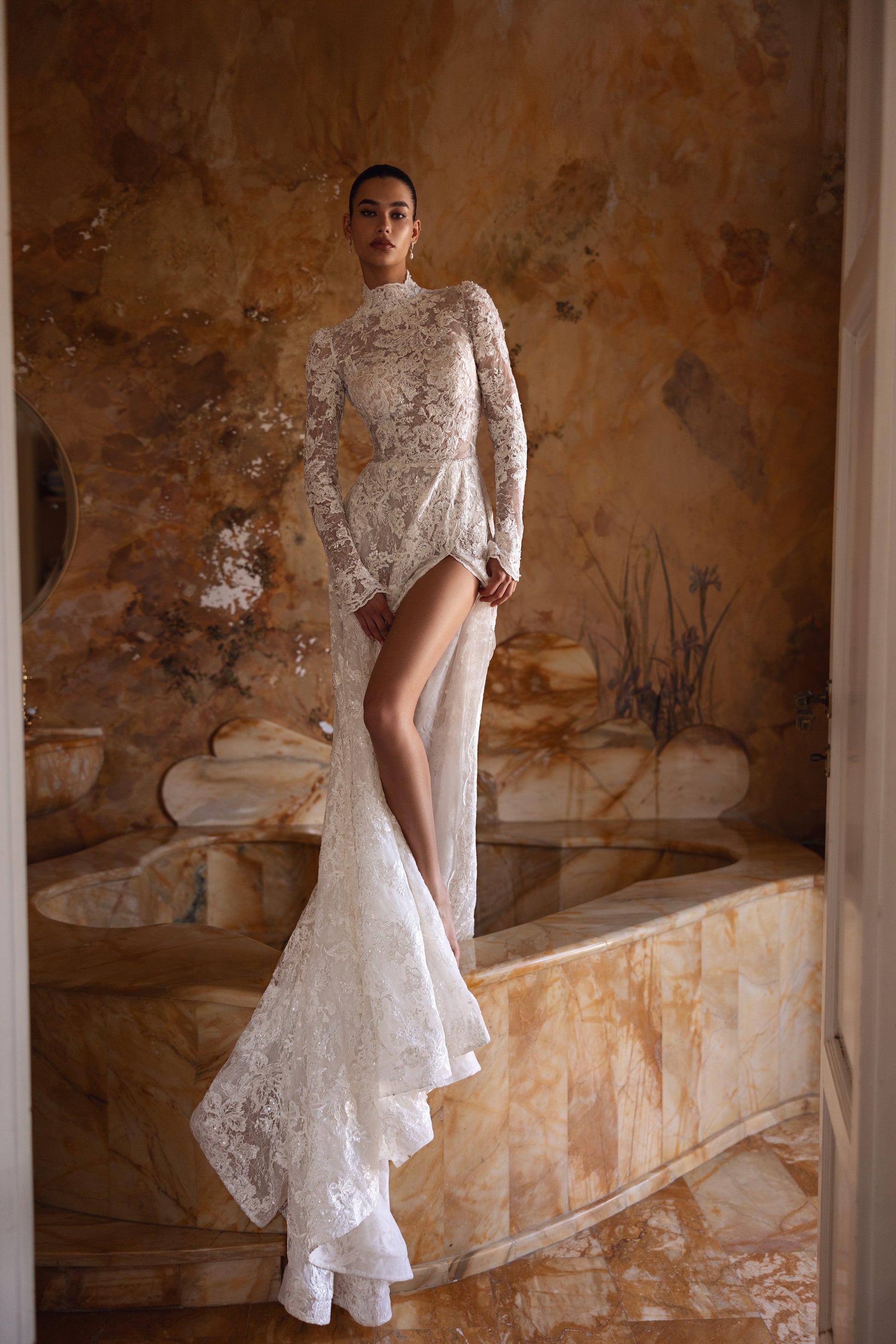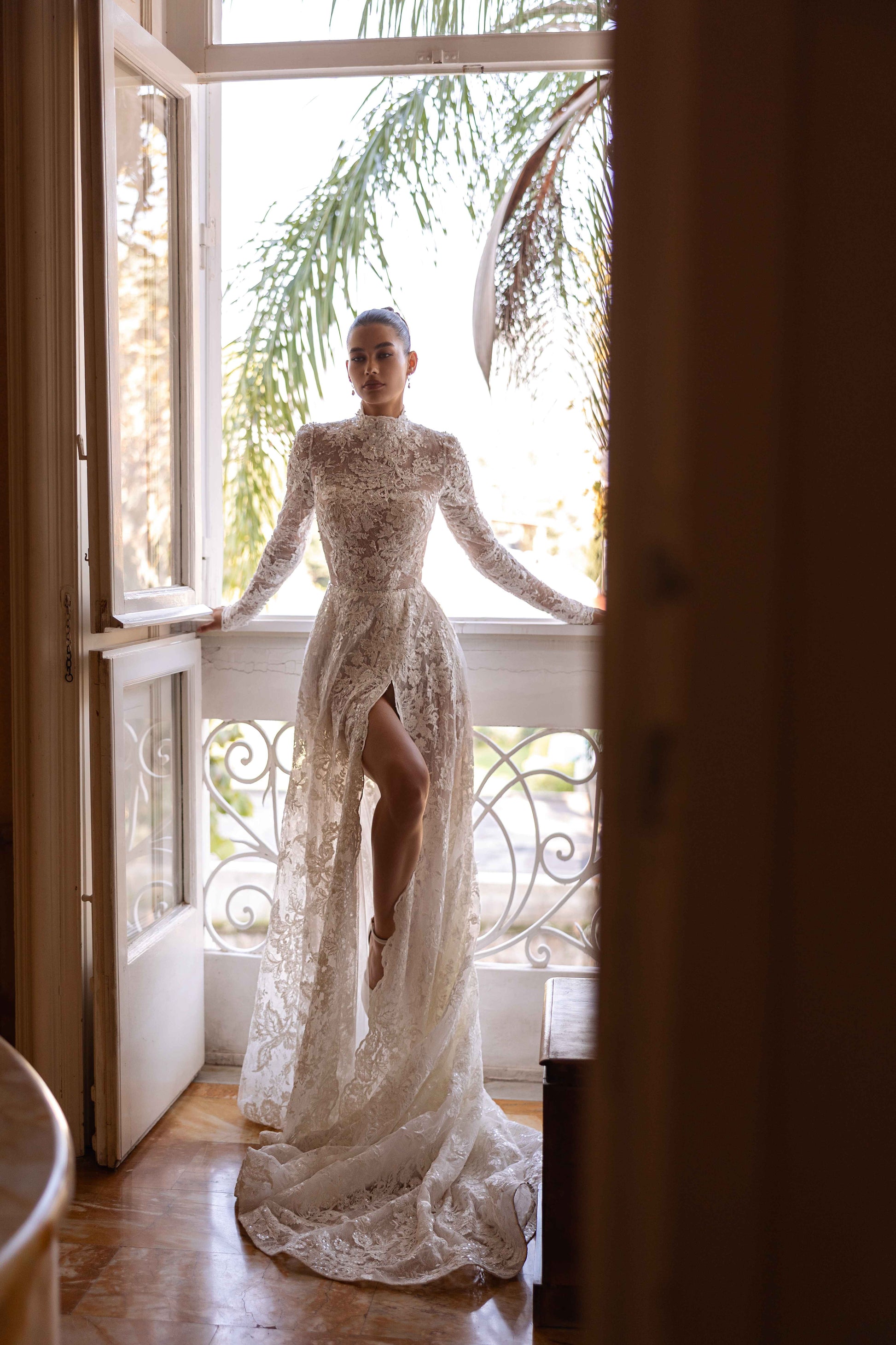 Cosette redefines noble allure with a dramatic slit and a row of buttons gracing its back. Guipure lace and sequins glisten on this ivory gown, blending bold sensitivity with a regal, handmade touch. A true masterpiece of couture grace.