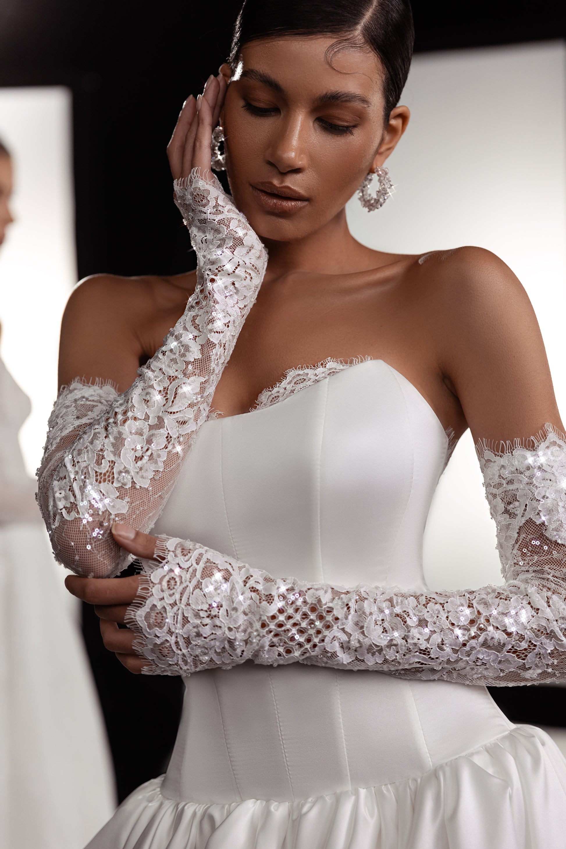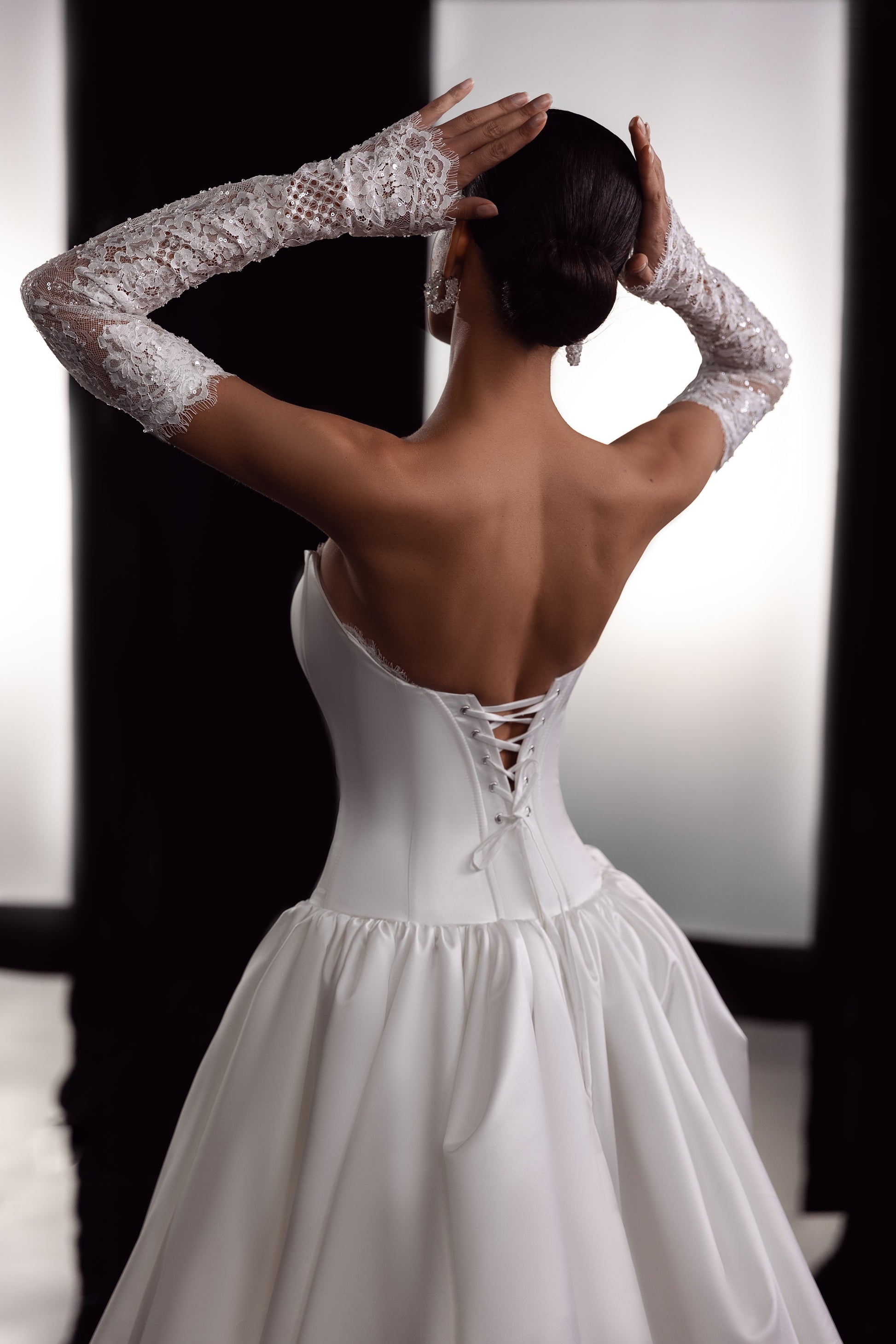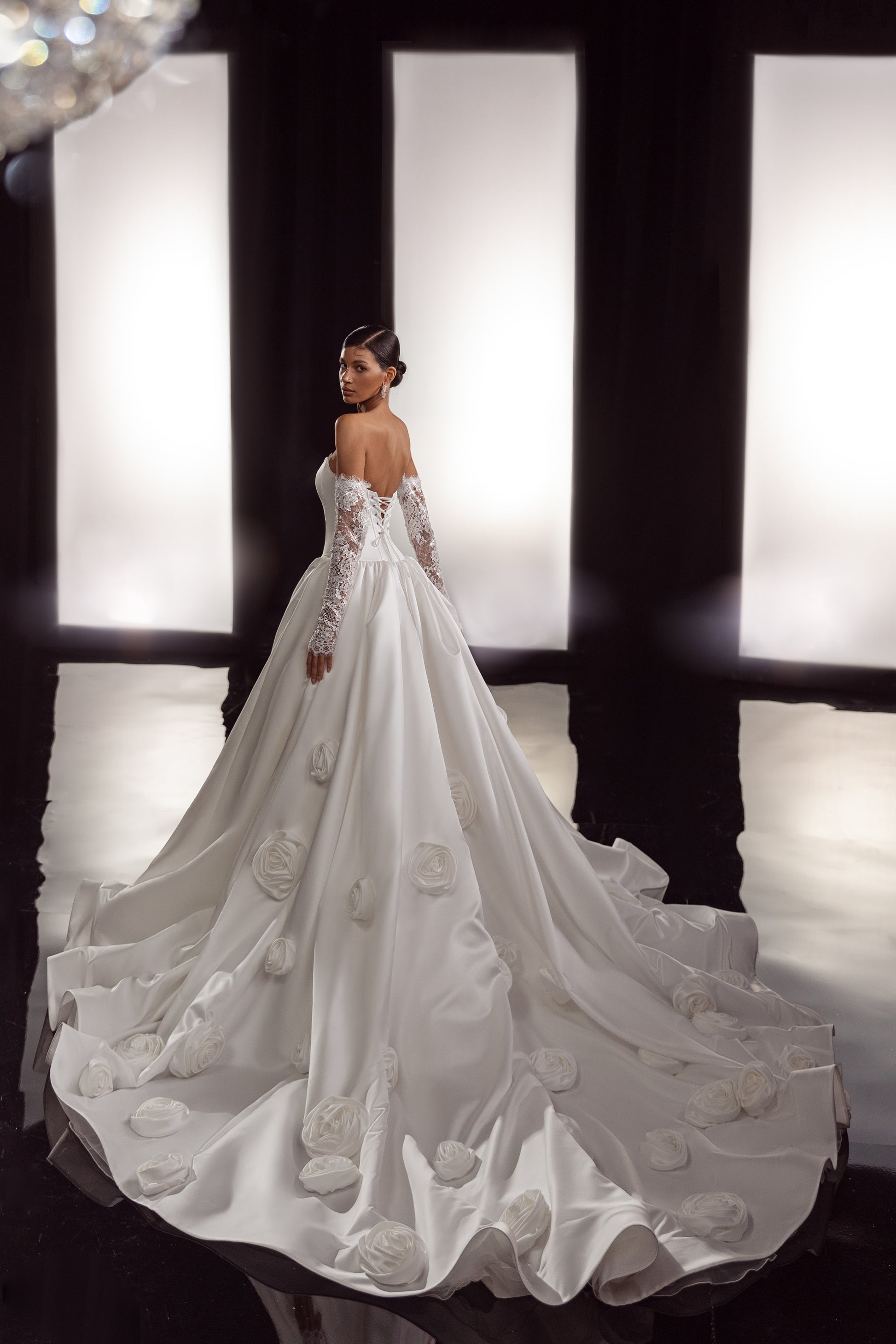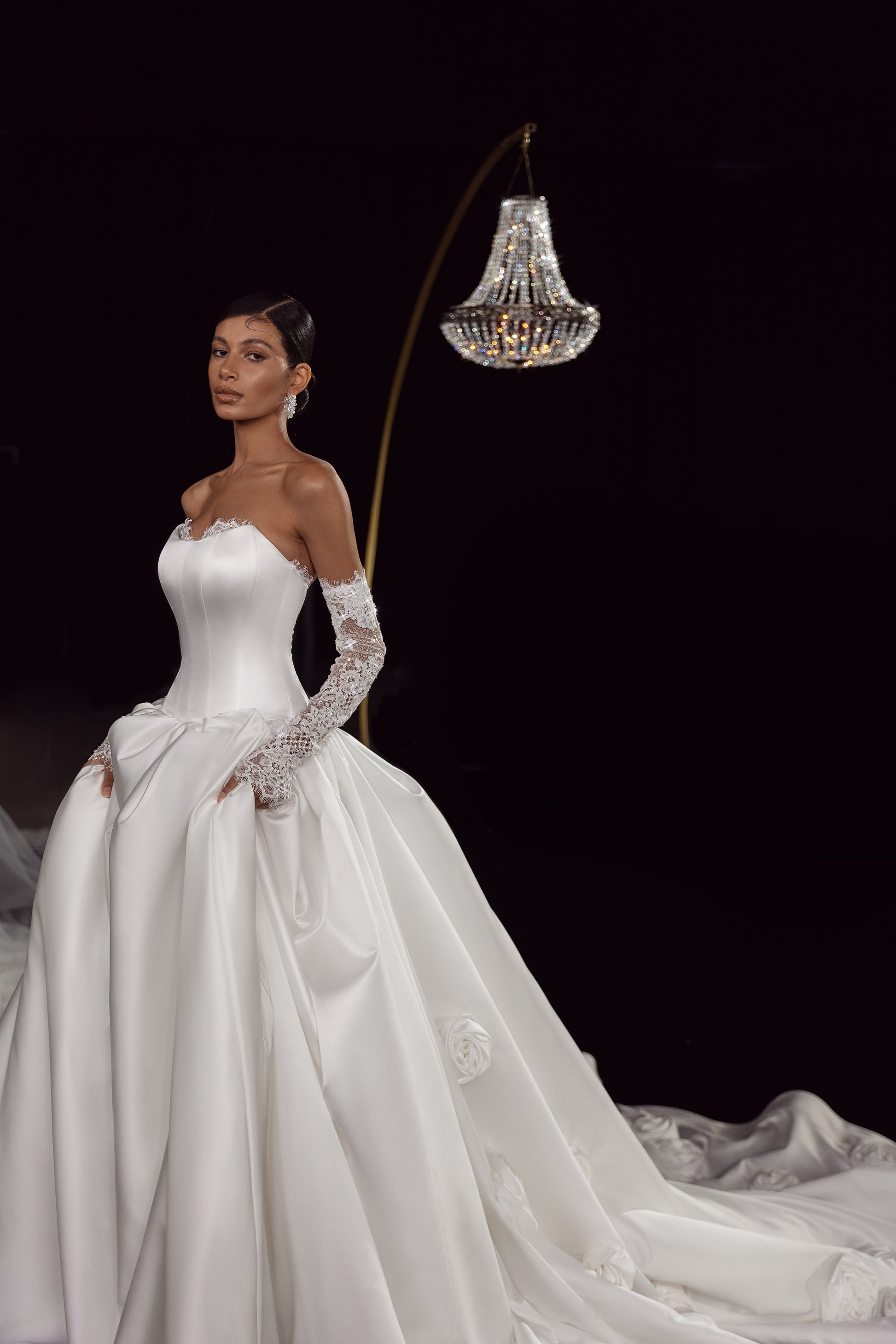 This majestic ivory satin gown blends lush elegance with composed grandeur, featuring a well-structured, low-waist corset adorned with hand-beaded Chantilly lace cups. Scalloped lace and handcrafted satin roses accent the deeply gathered princess skirt, while detachable, beaded Chantilly lace sleeves with lash detailing—along the décolleté, sleeves, and laced back—add versatile, timeless charm.