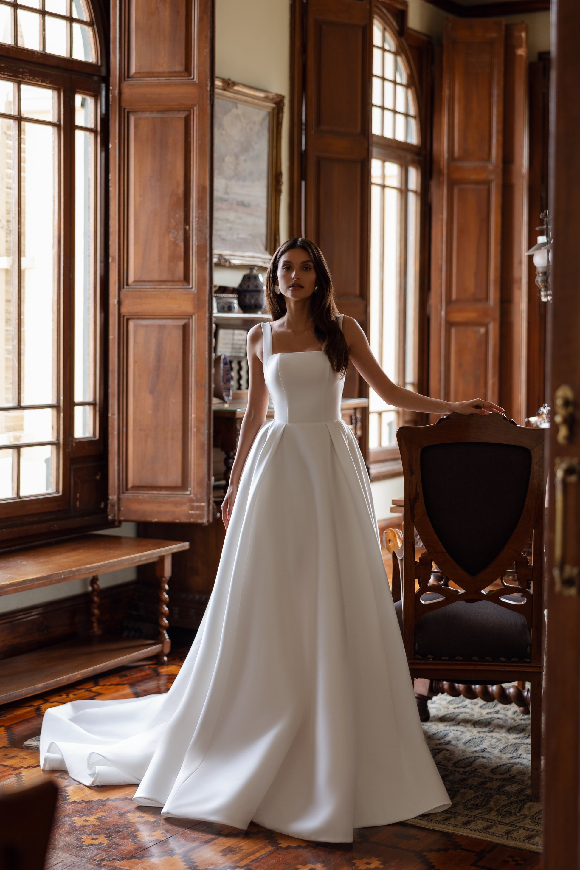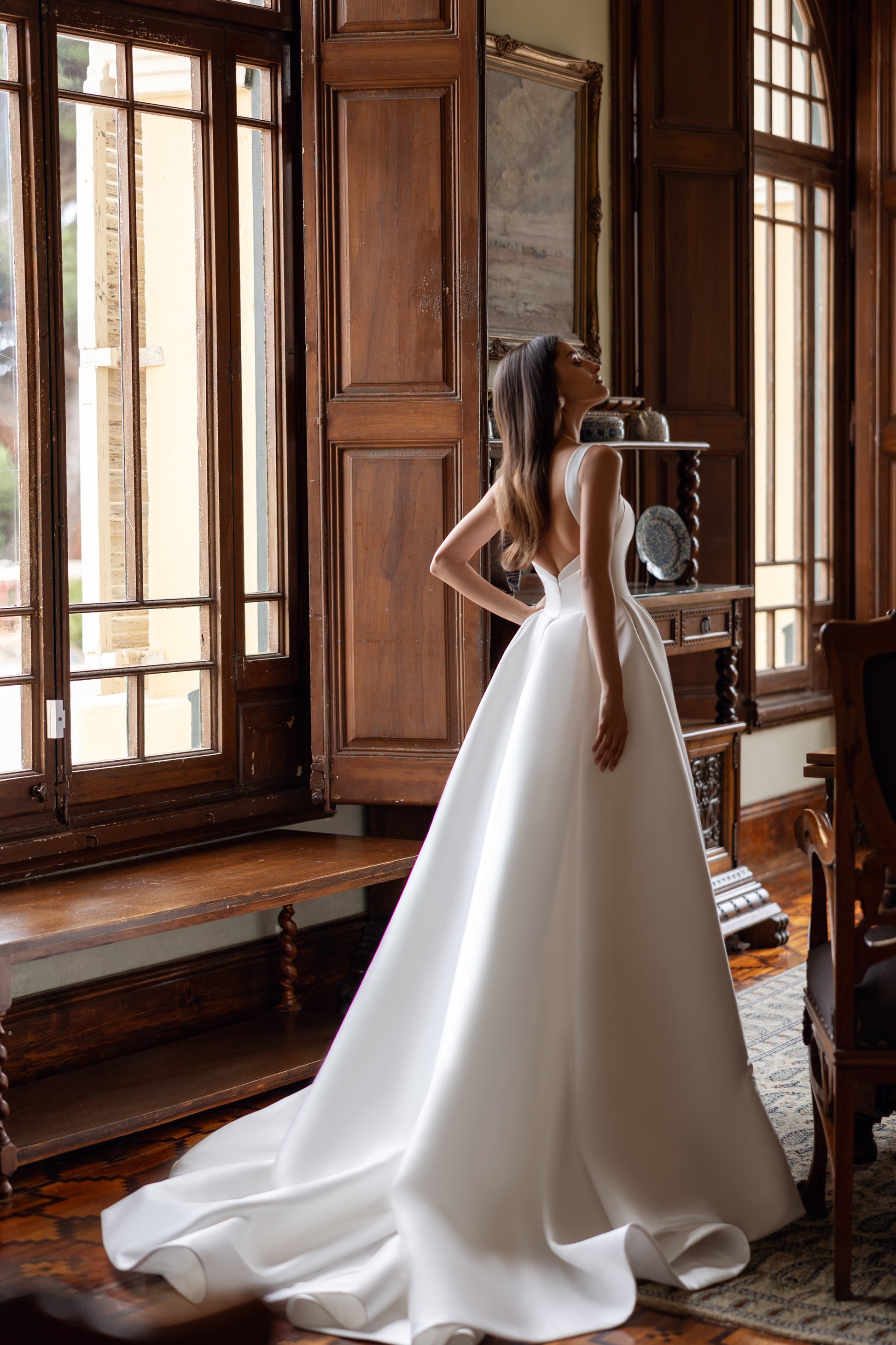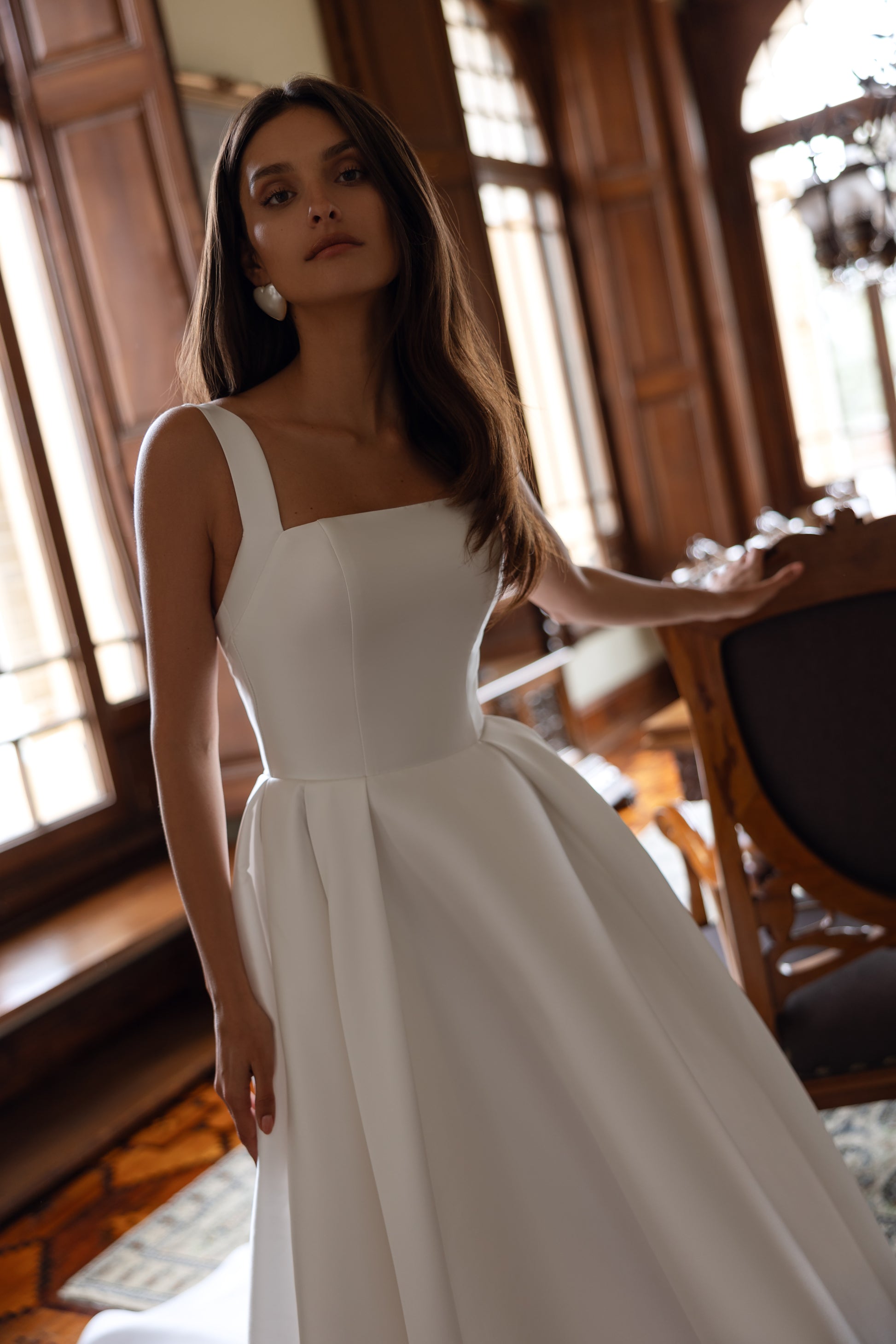 This ivory mikado dress boasts a square neckline and A-line silhouette, combining royal elegance with modern simplicity. Its structured form and graceful flow radiate confidence, offering a refined yet effortlessly appealing look. A perfect choice for the bride who desires a blend of sophistication and irresistible magnetism.