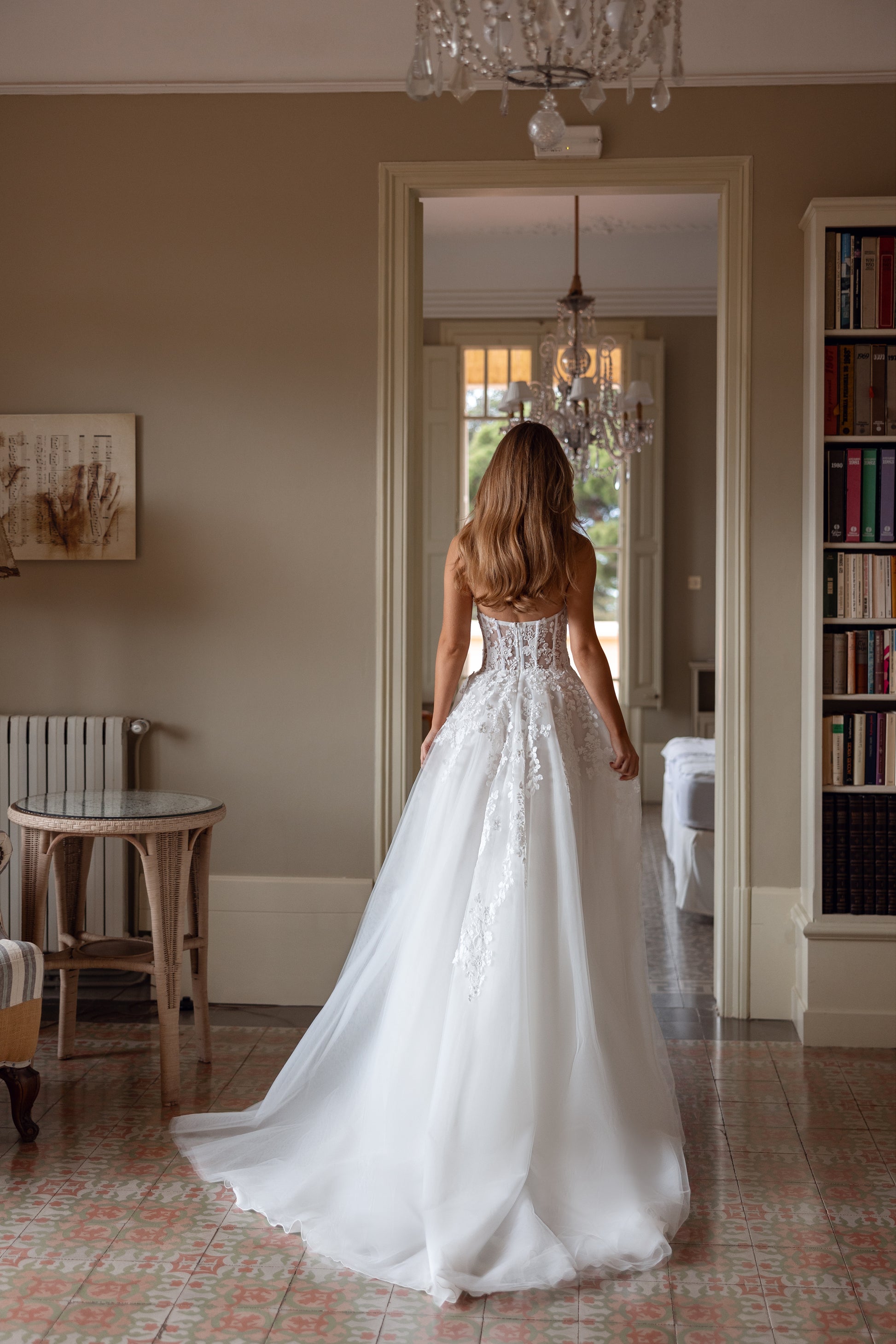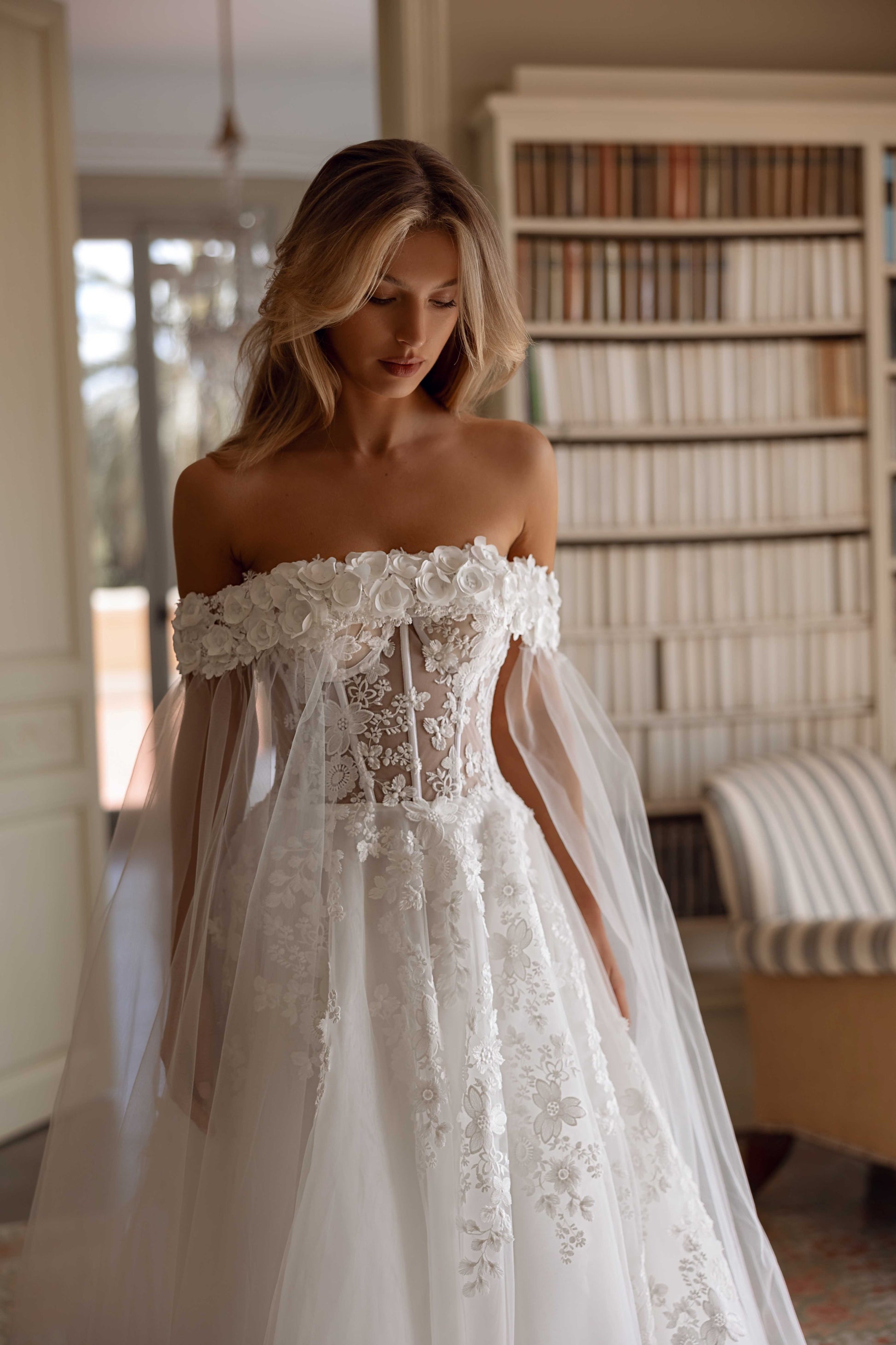 An ivory tulle gown with a sweetheart neckline and A-line silhouette, featuring intricate lace details. The 3D floral strip gracefully wraps around the shoulders and back, cascading to the floor, adding a touch of romance and vintage-inspired charm. Handcrafted with delicate sophistication.