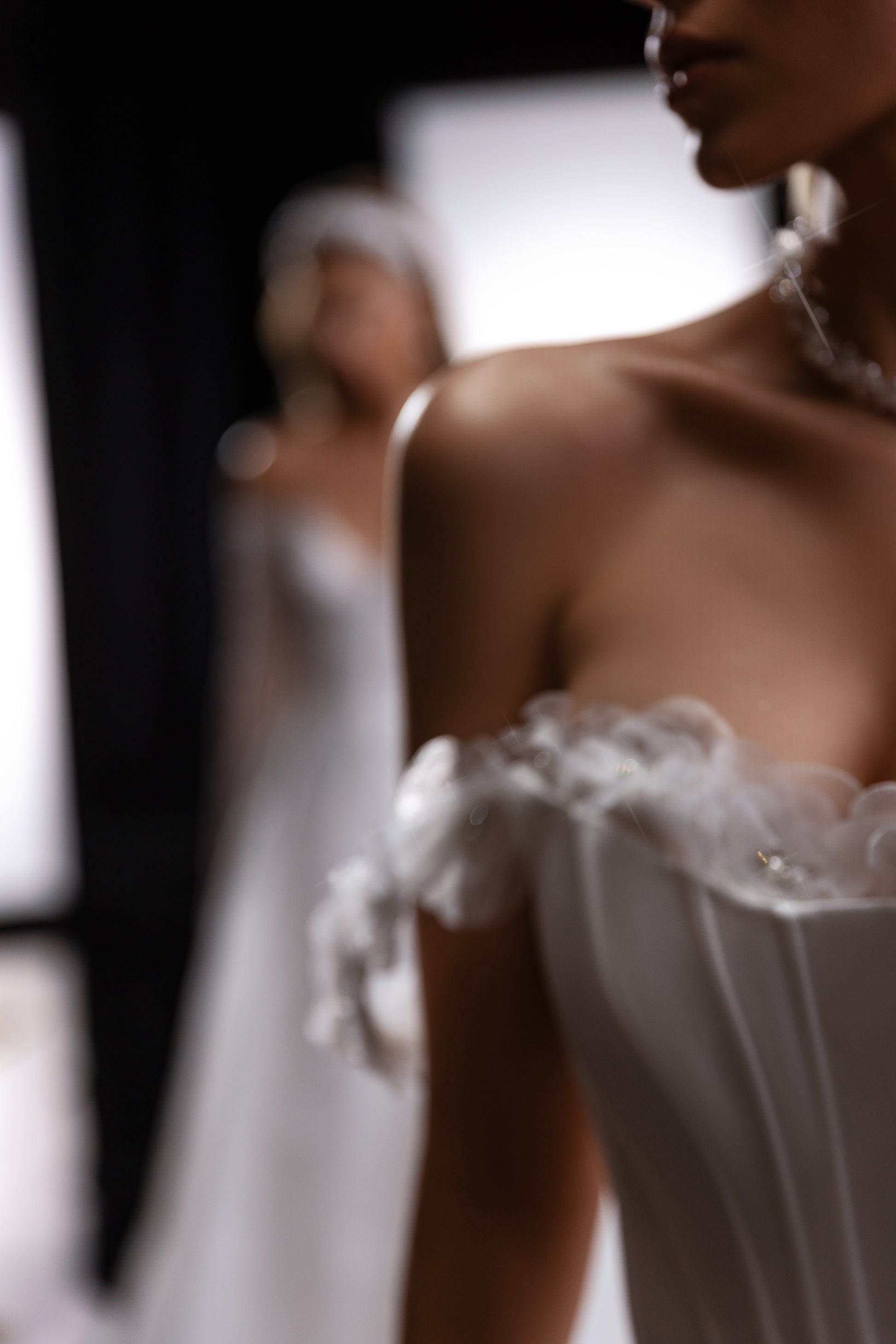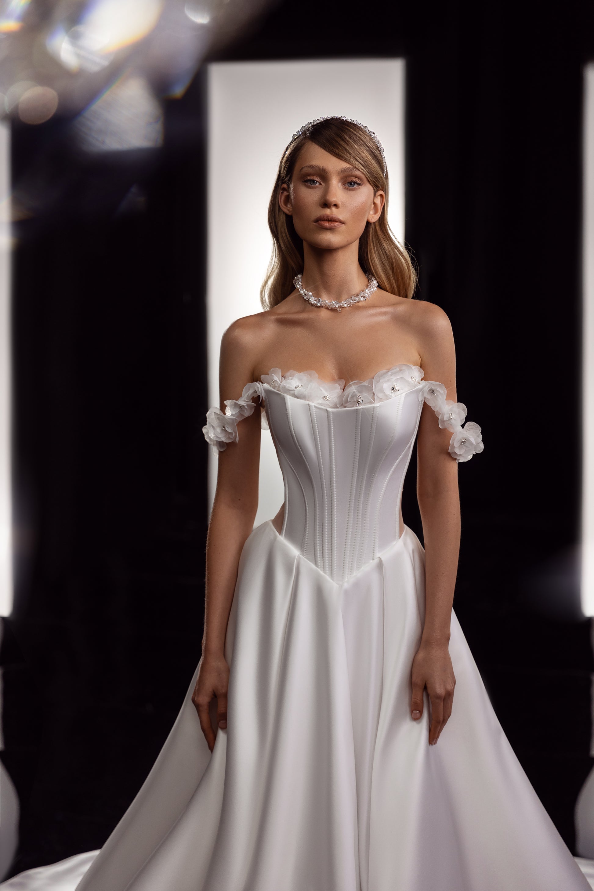 This fresh ivory satin gown blooms with youthful promise, adorned with 3D florals and Swarovski-studded handmade flowers along the crescent décolleté and falling small sleeves of its structured basque-waist corset. A transparent nude back with lacing complements the deep-folded skirt and long princess trail, effortlessly balancing innocence and elegance in a poetic nod to femininity.