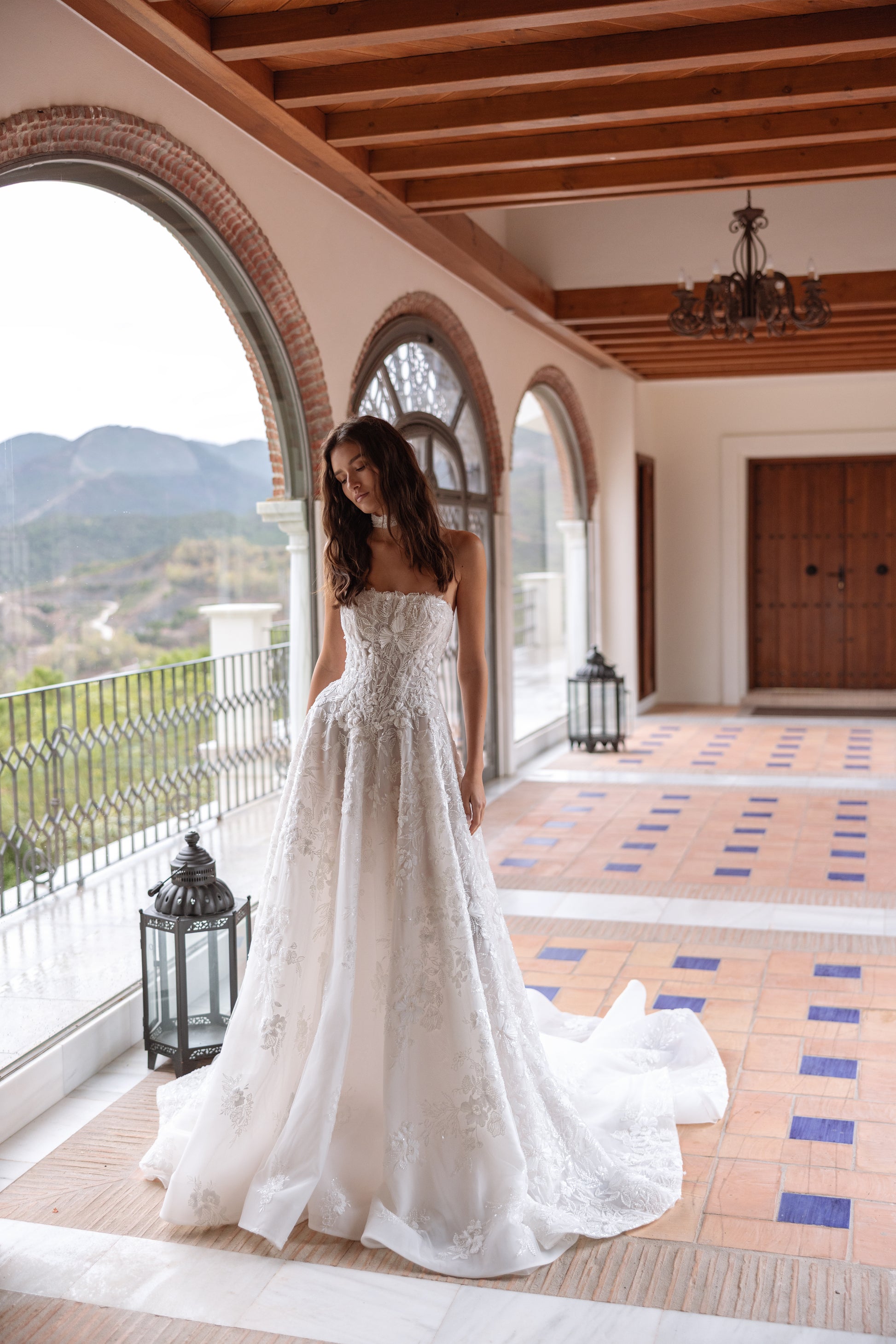A-line gown that blends romance with a subtle glow. The corset-style bodice features a clean straight neckline for a refined, elegant look, while beaded lace with sequins adds soft shimmering texture without feeling overdone. The skirt opens gently into a light, airy silhouette. A standout detail is the choker, bringing a fashion-forward edge and a polished, modern finish.
