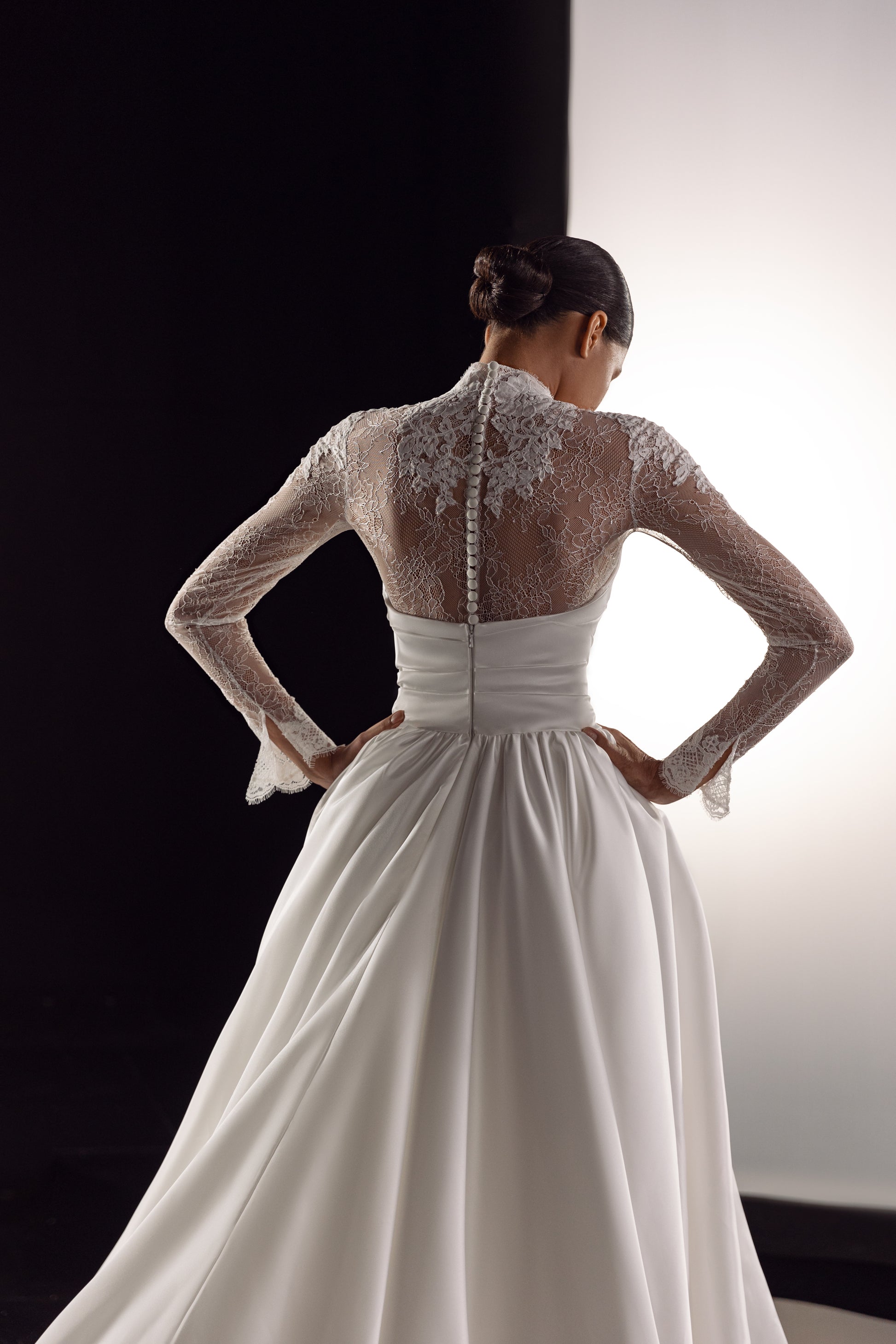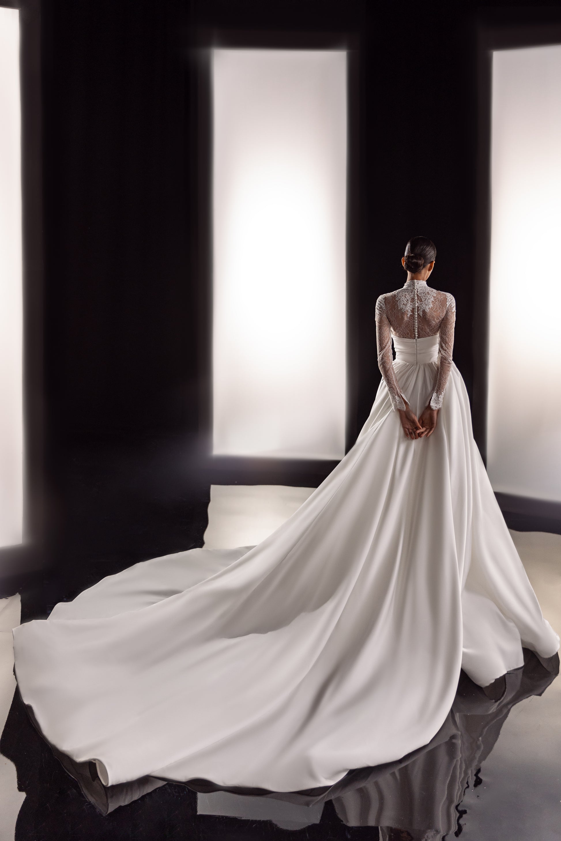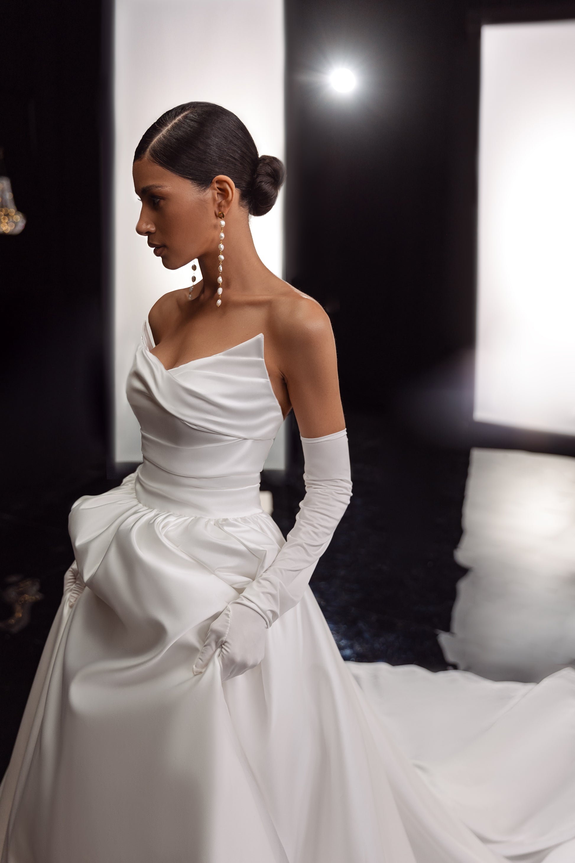 This ivory satin masterpiece captivates with a deeply draped corset and crescent décolleté, flowing into a well-gathered princess skirt with a lush, long trail. Detachable stretch satin gloves and a bolero with long sleeves, hand-decorated with Chantilly lace appliqués, enhance its dramatic edges—transforming every step into a regal statement of intricate sophistication.
