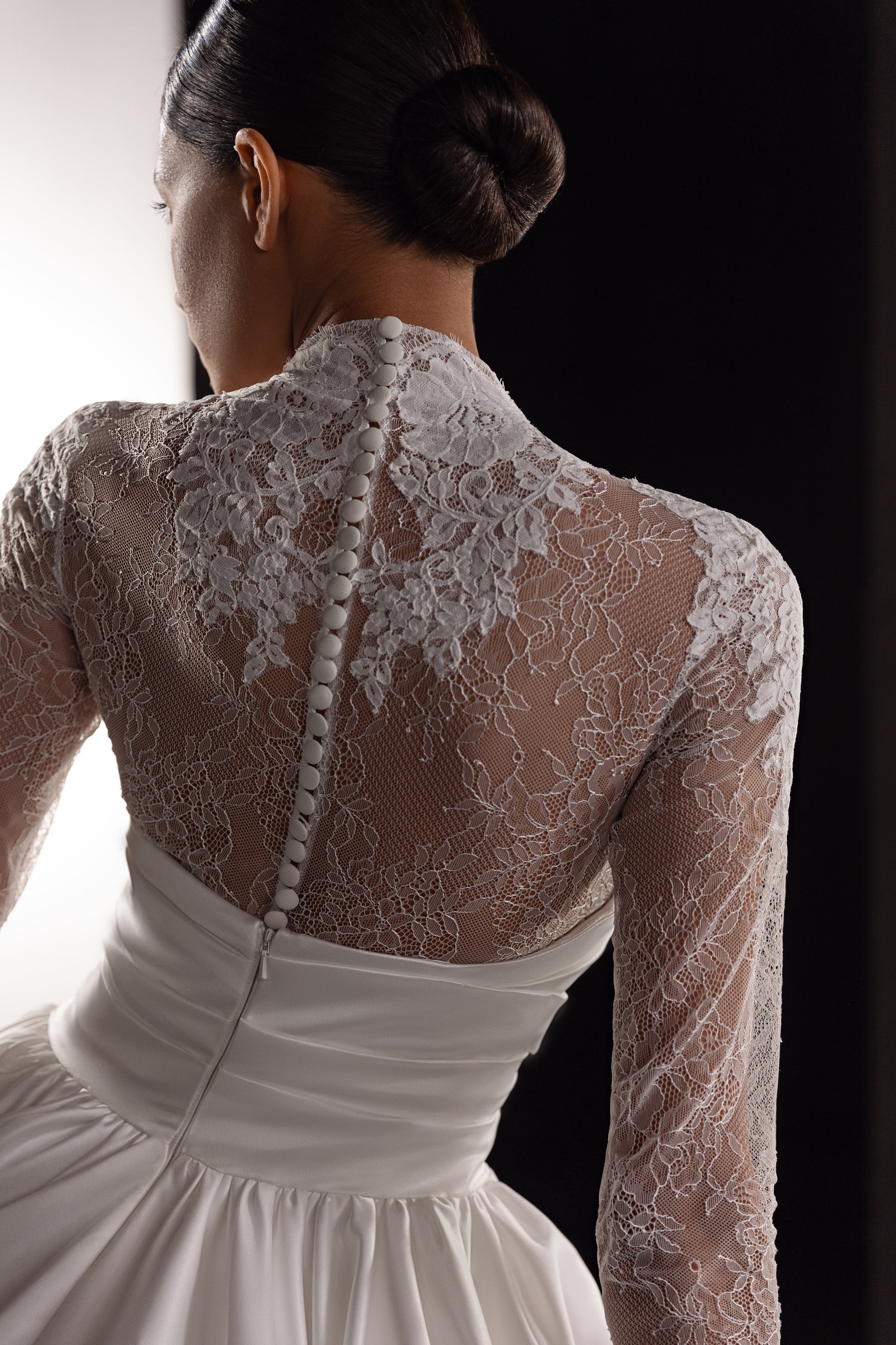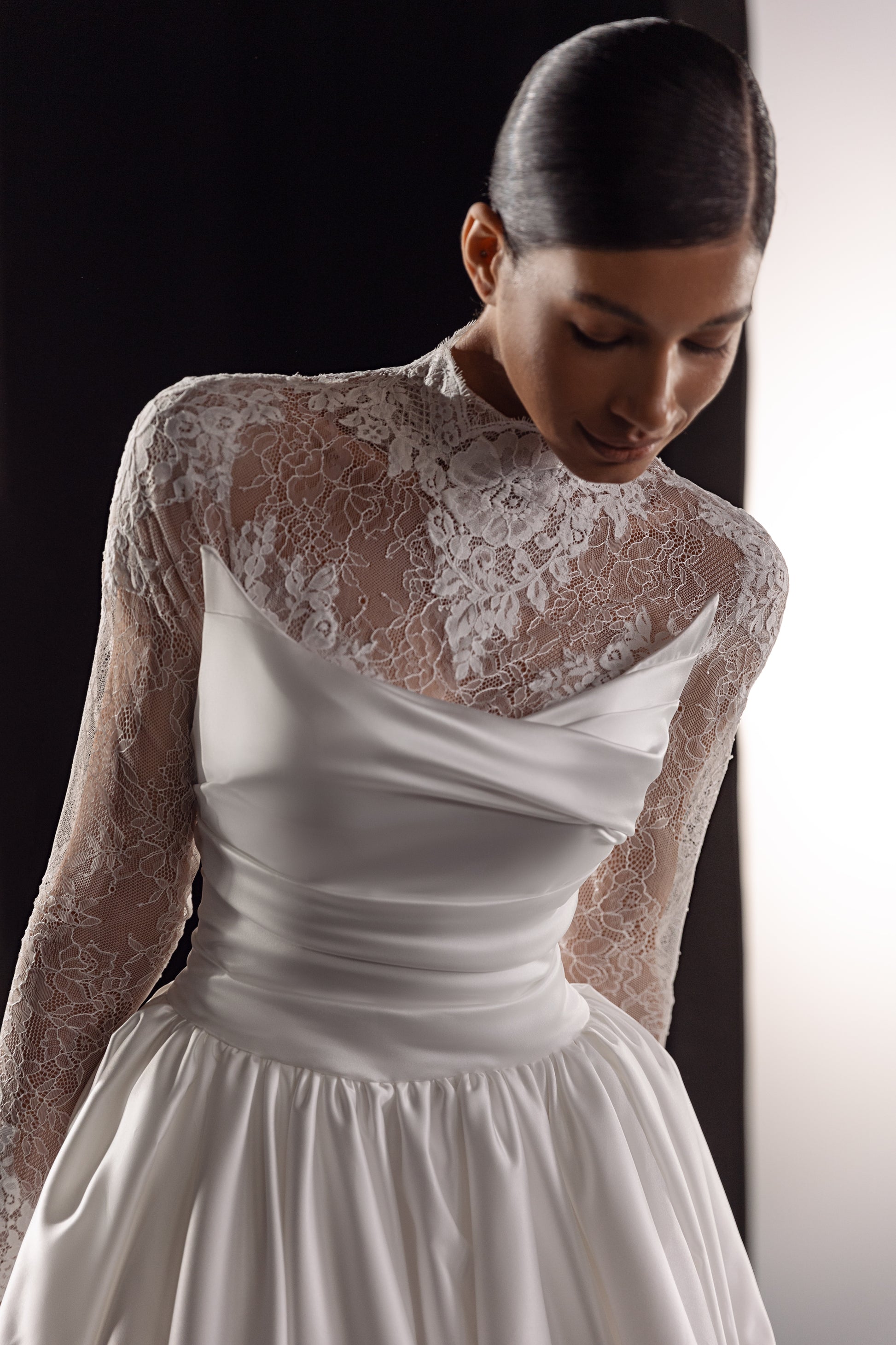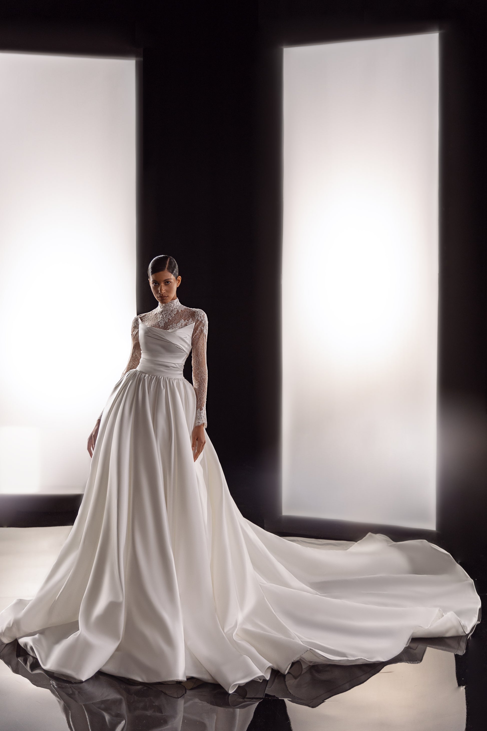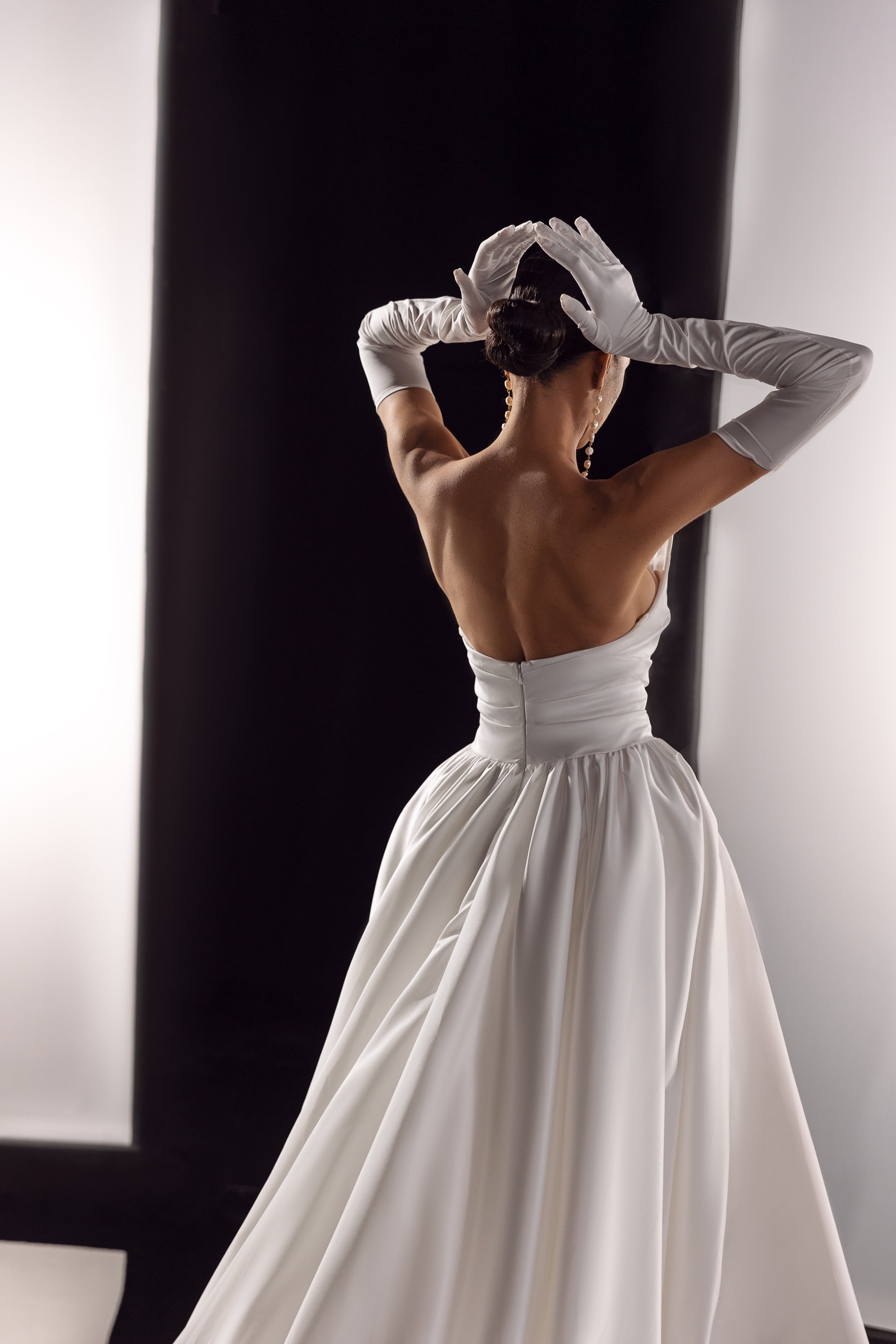 This ivory satin masterpiece captivates with a deeply draped corset and crescent décolleté, flowing into a well-gathered princess skirt with a lush, long trail. Detachable stretch satin gloves and a bolero with long sleeves, hand-decorated with Chantilly lace appliqués, enhance its dramatic edges—transforming every step into a regal statement of intricate sophistication.