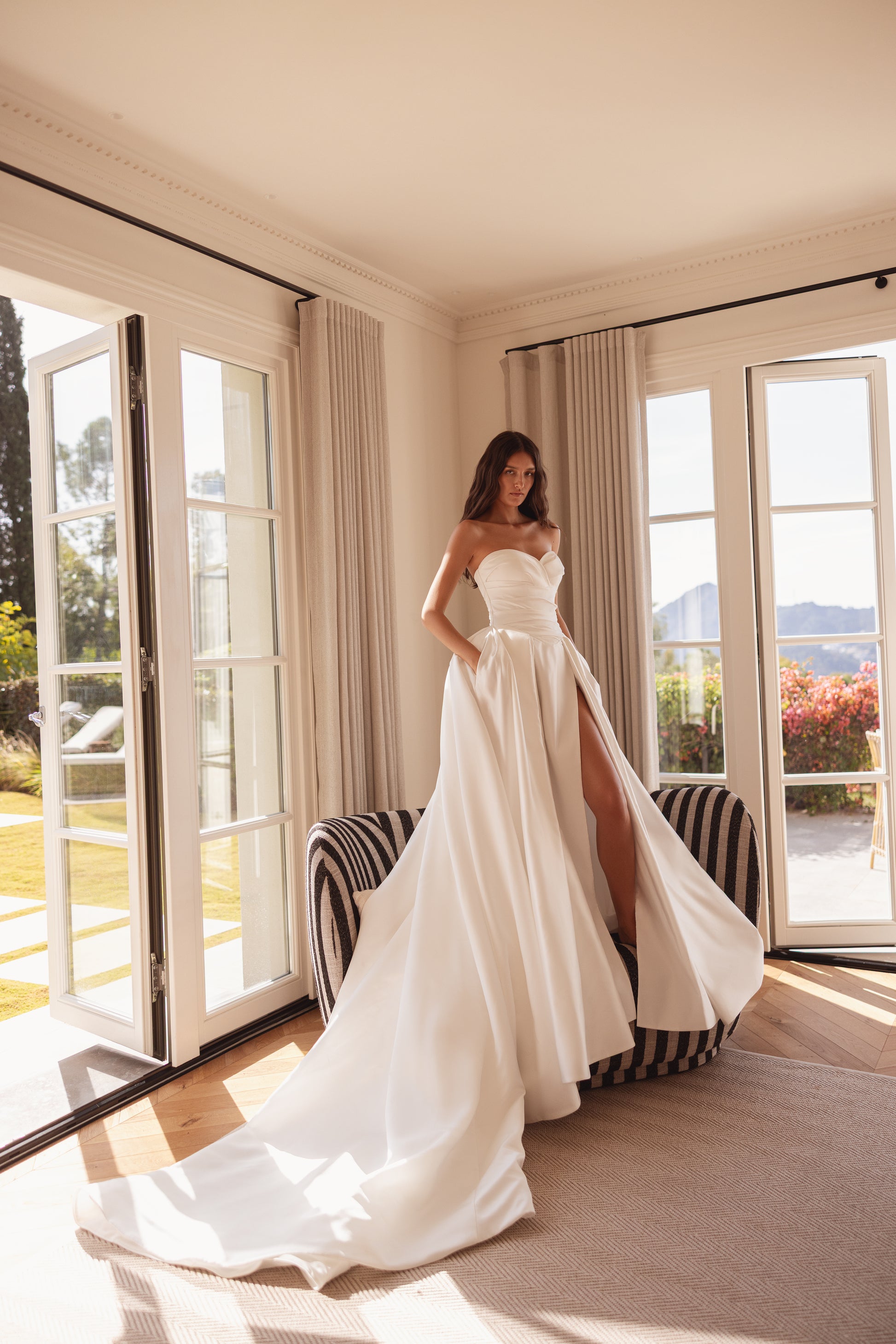 Minimal satin silk flows into a fluid skirt with a daring slit. Designed for the bride who finds power in simplicity and elegance in movement.