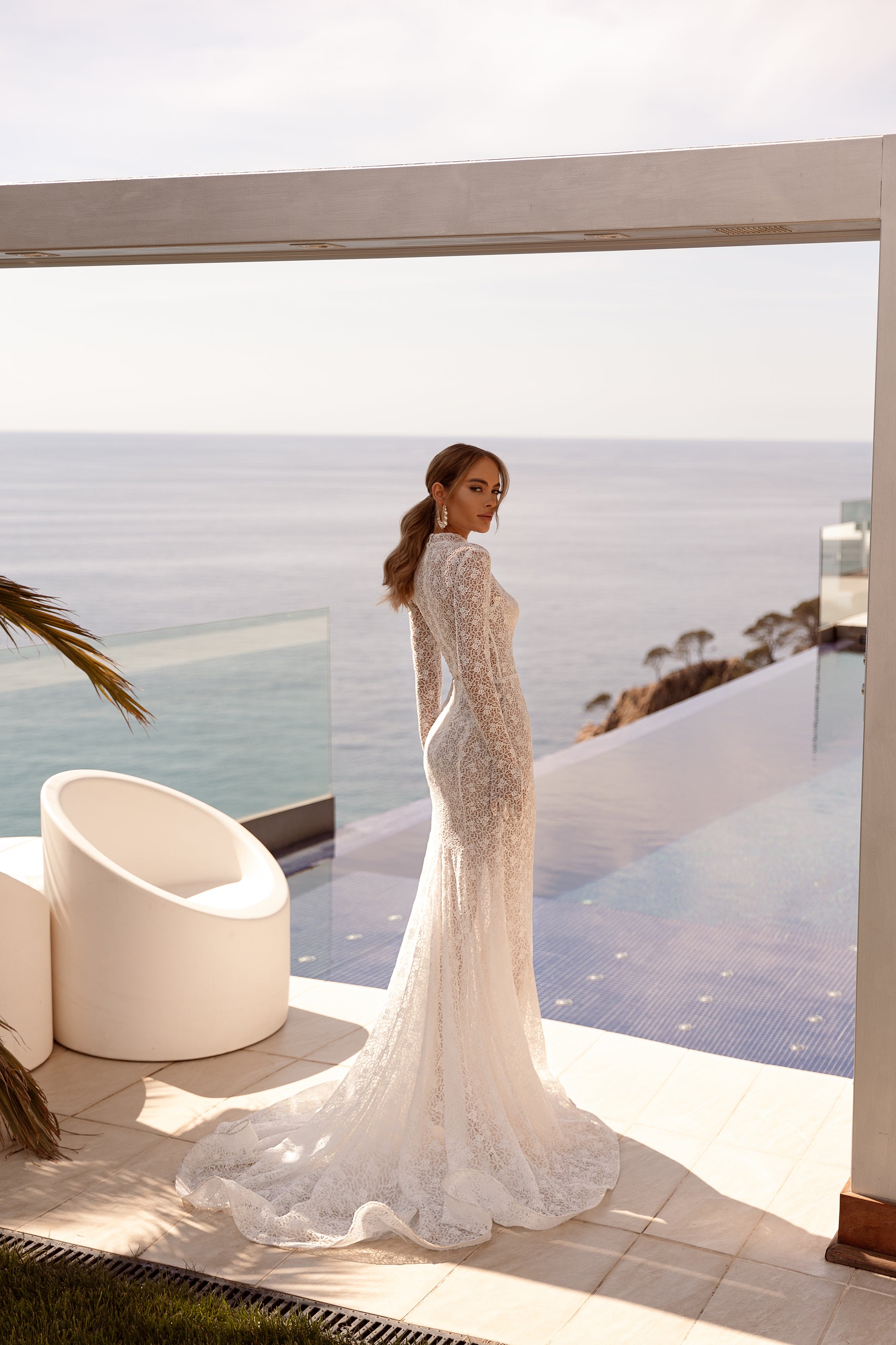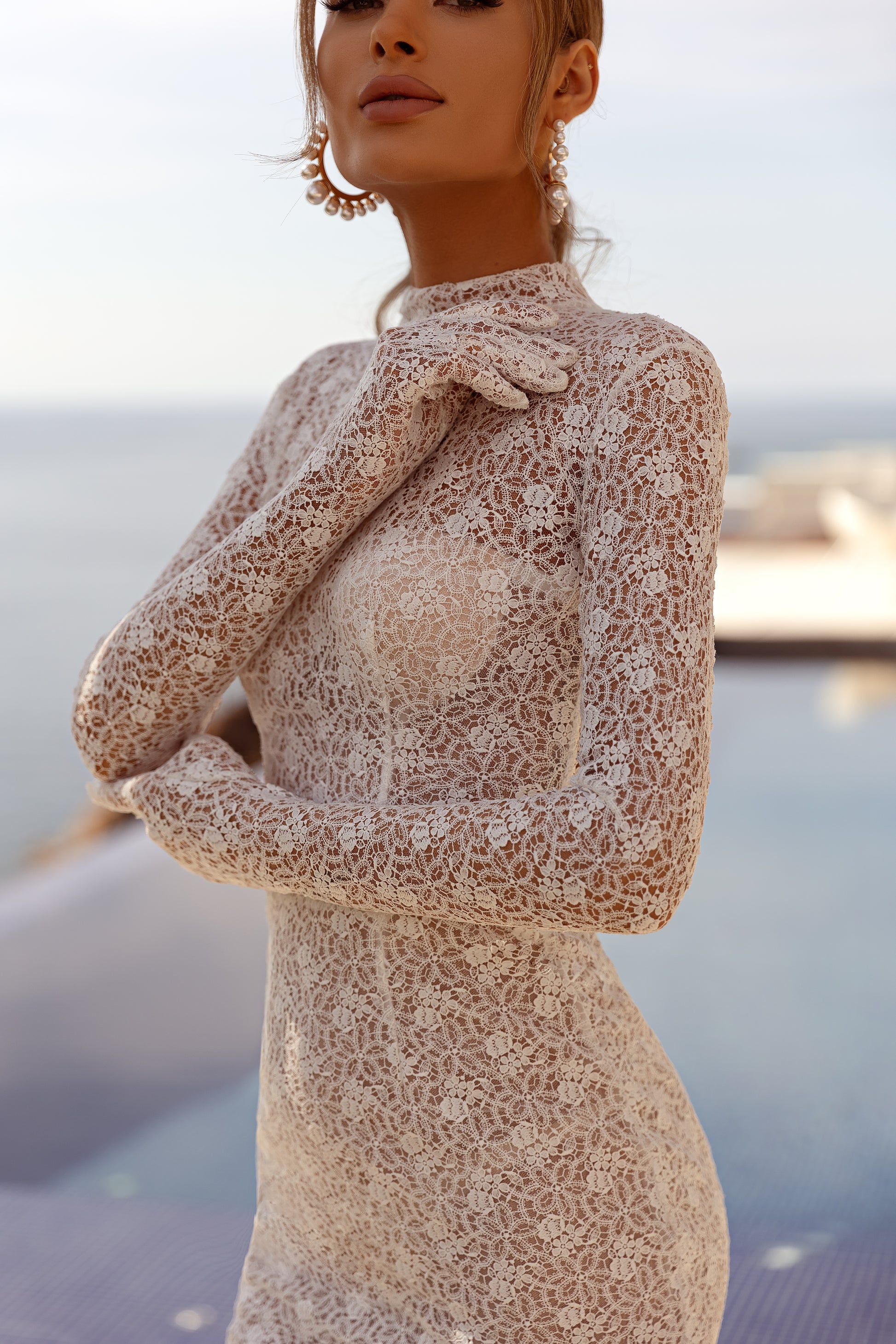 Ester is a masterpiece in pure ivory, where every stitch of guipure lace flows effortlessly, exuding quiet yet undeniable grace. With a high turtleneck and fingers draped in long sleeves, this gown whispers seduction through its sheer subtlety. It’s elegance in its purest form—bold yet restrained, confident yet delicate.