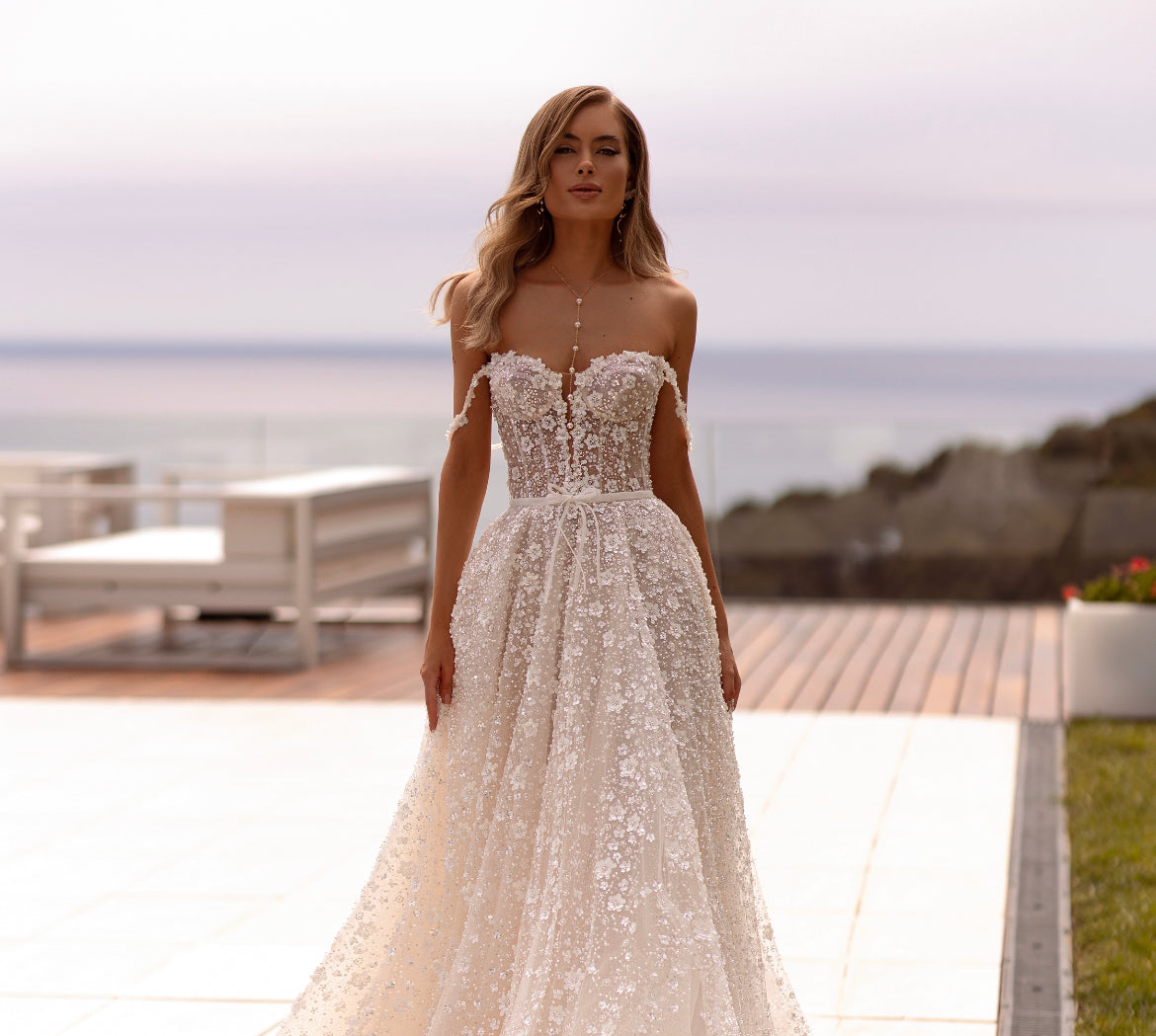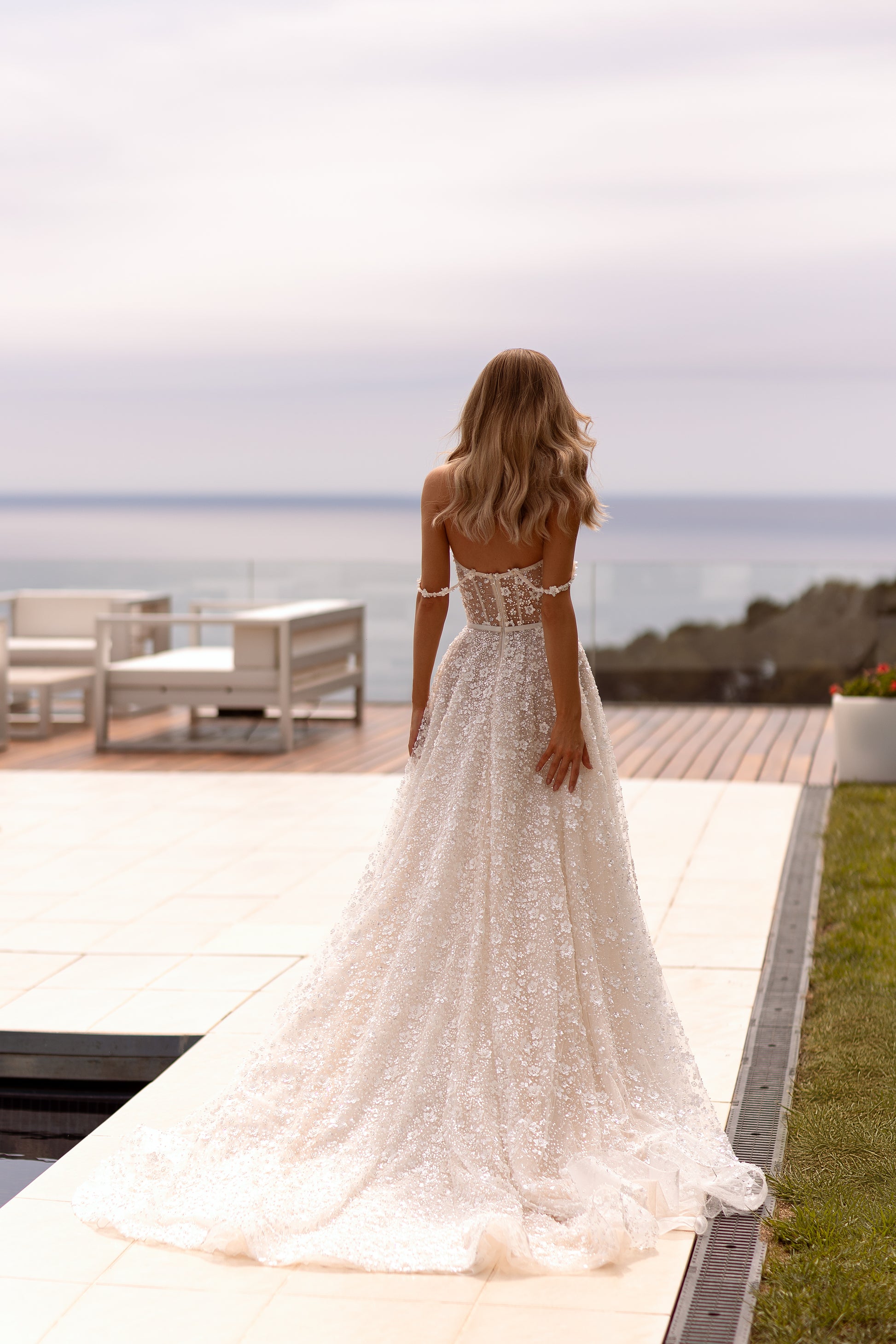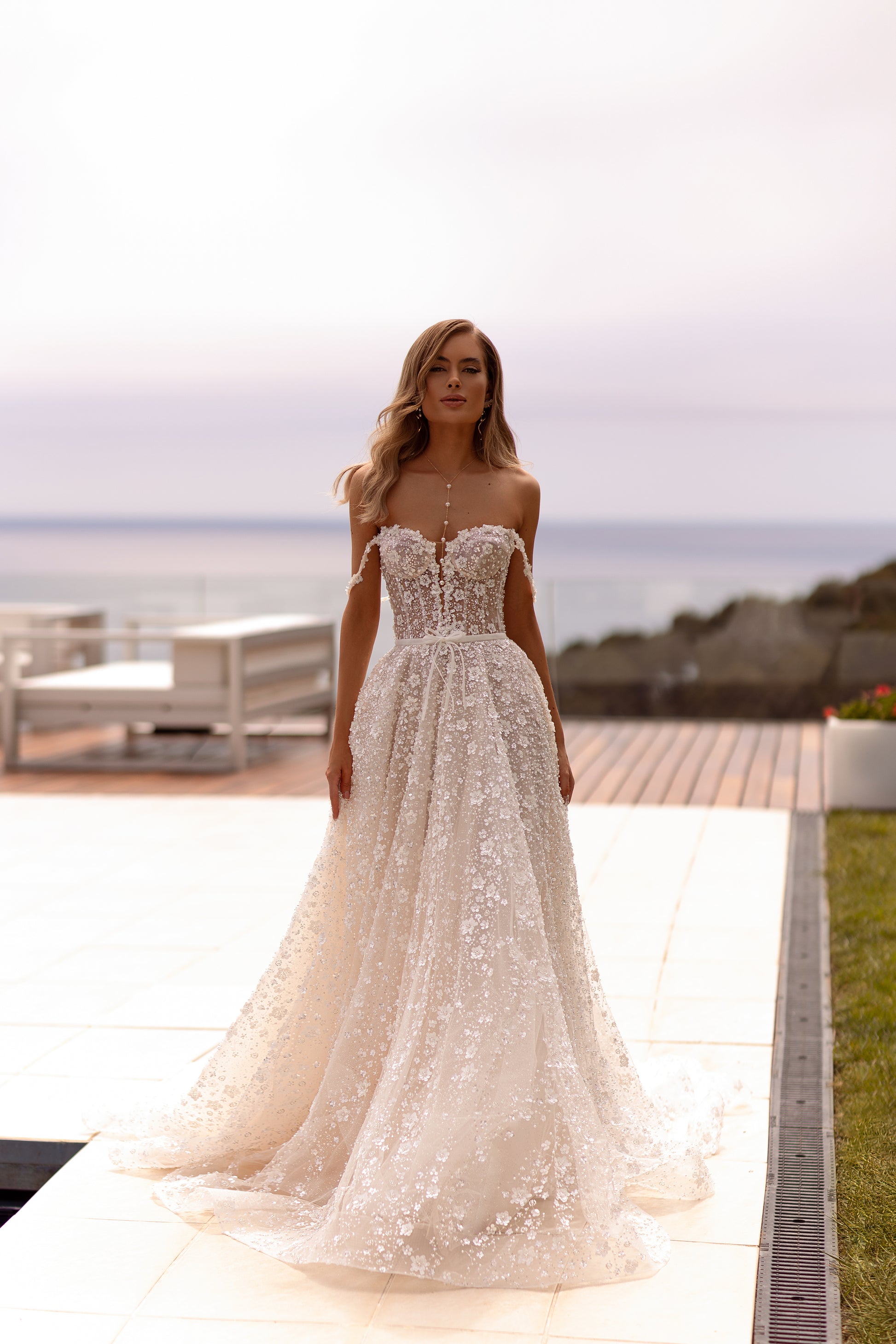 Fleur dazzles with cappuccino tones that come to life through beads, pearls, and sequins. The guipure foundation sets a sophisticated tone, while the intricate embellishments add just the right amount of whimsy. This gown doesn’t just sit pretty—it catches the light and dances with it, making every detail come alive.