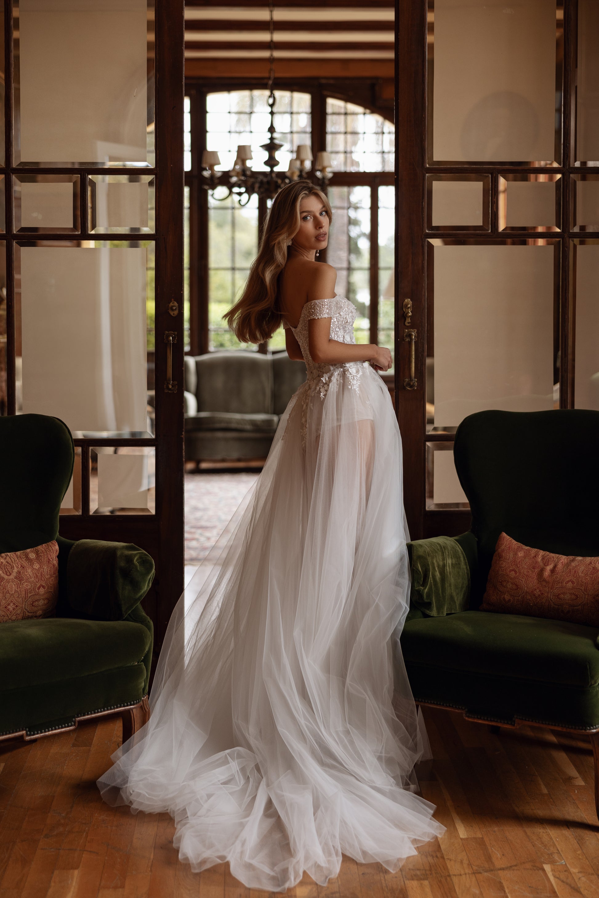 This exquisite tulle gown, adorned with lace, glossy beads, sequins, and 3D flowers, features an asymmetrical off-the-shoulder design. Its daring yet playful style highlights an alluring silhouette, while intriguing details like a leg-baring cut create a captivating contrast. A blend of romance, elegance, and vibrant femininity.