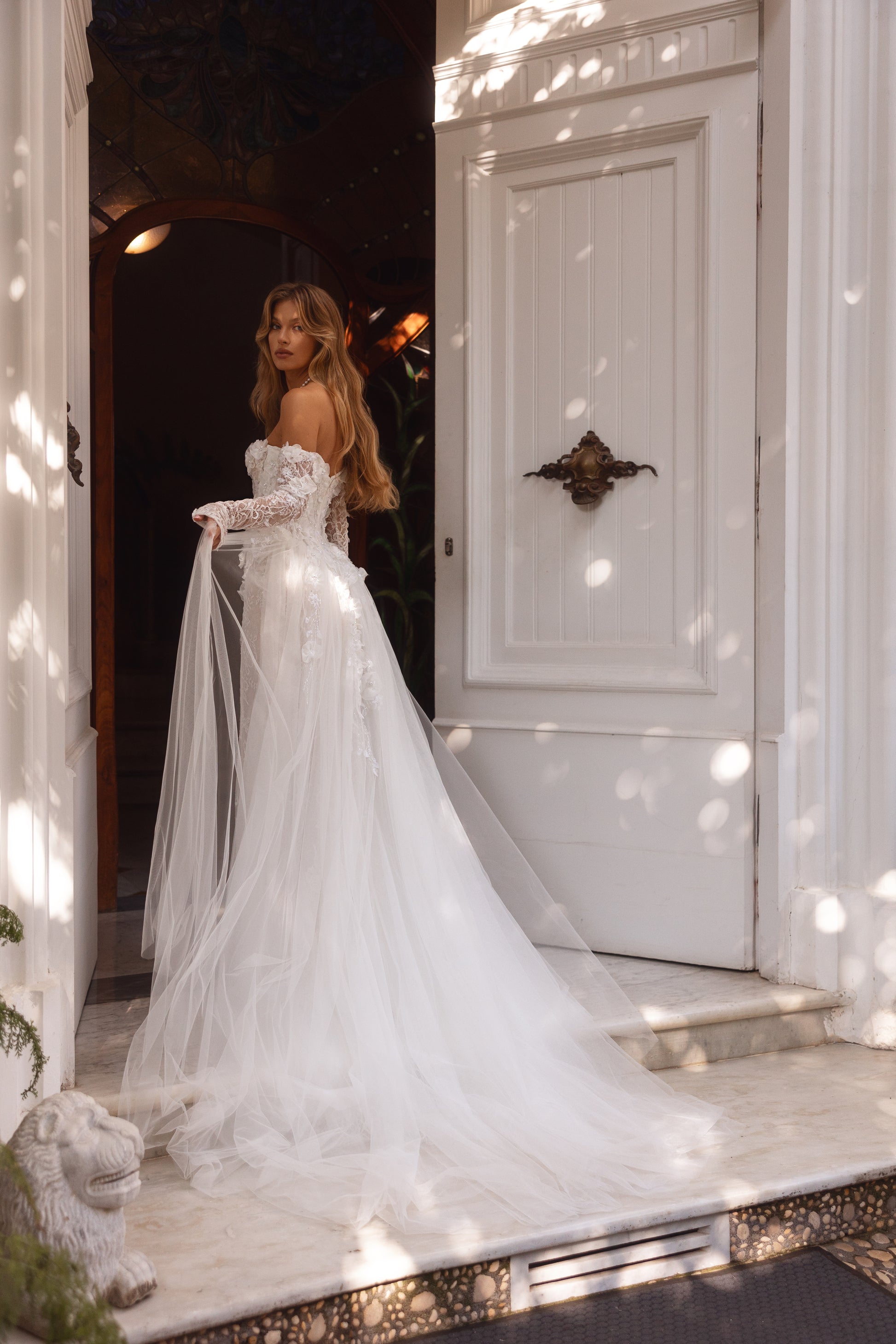 Crafted from Chantilly lace with guipure elements, this ivory masterpiece blends tenderness with allure. Beads, pearls, and 3D florals create an intricate story, while the removable airy skirt offers a playful touch. A gown of intrigue and irresistible charm.