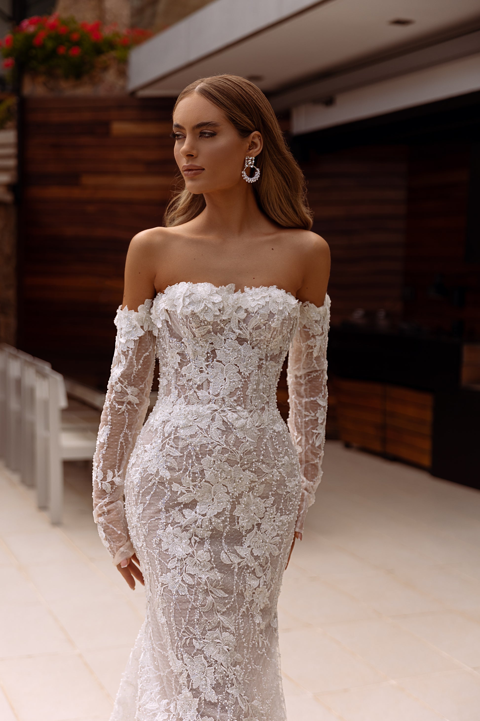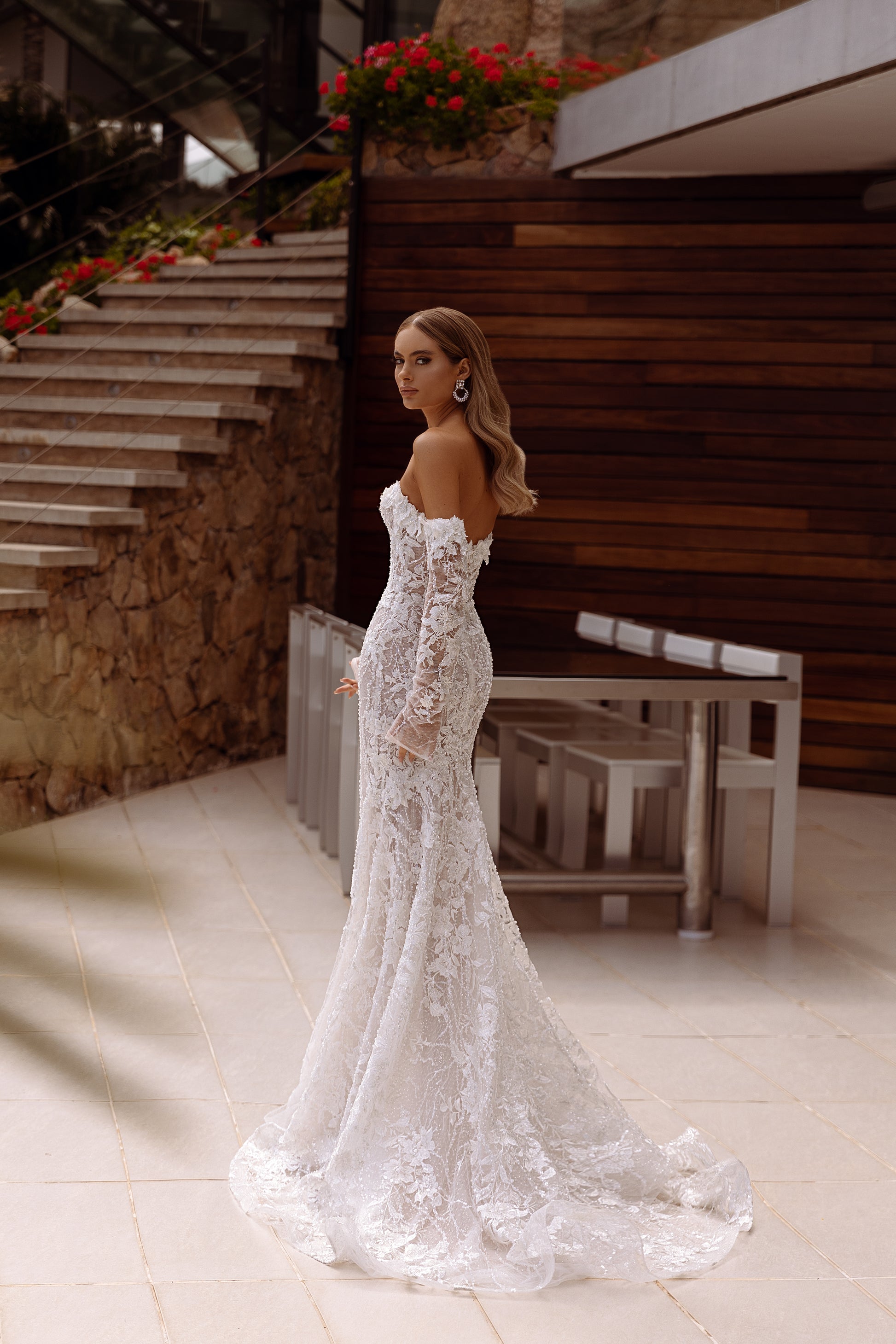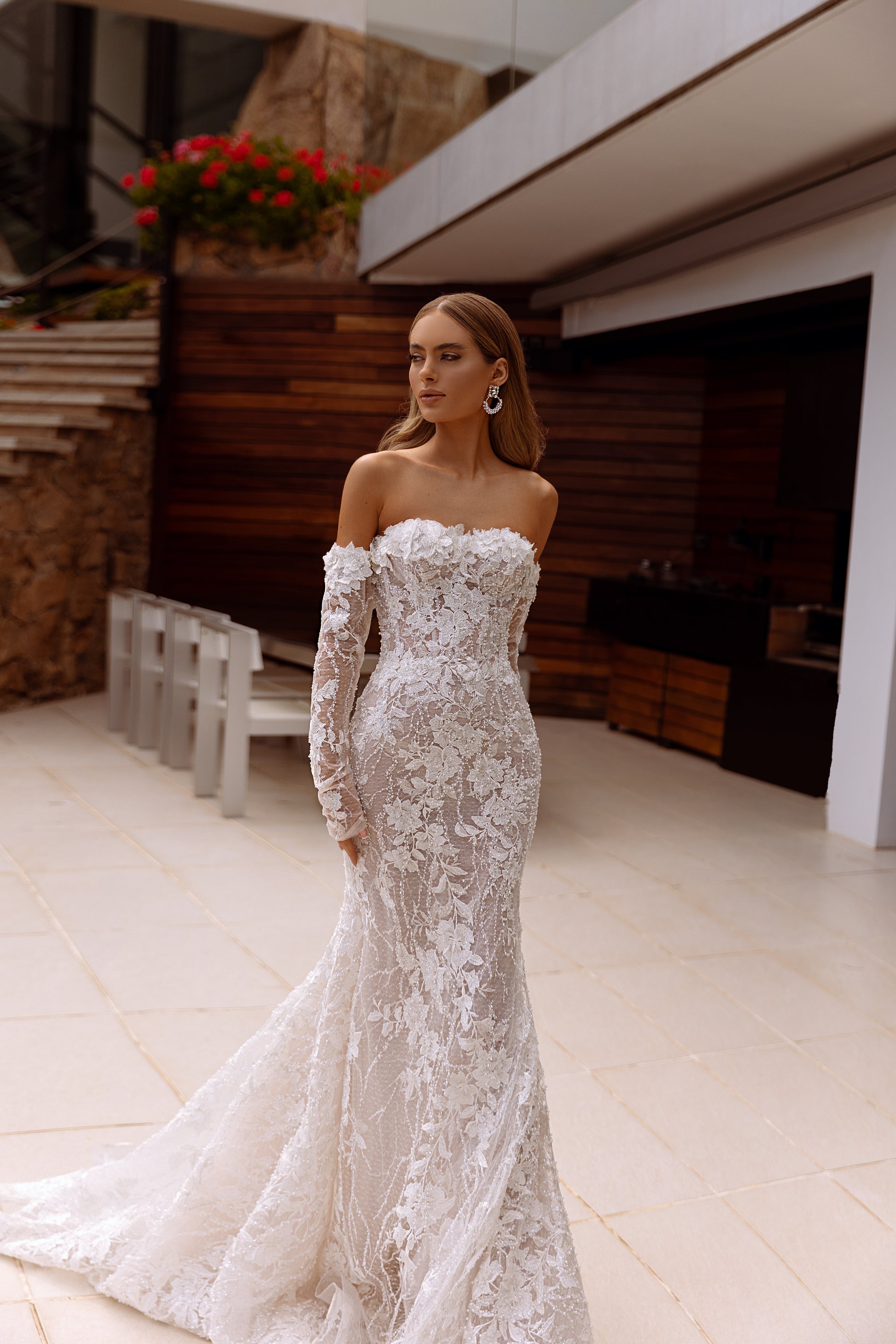 Guerra is an art form in motion. Handcrafted with cappuccino tones, dimensional flowers bloom amid pearls, beads, and sequins, creating an undeniable allure. The mermaid silhouette hugs every curve while detachable sleeves add dramatic flair, making each step an unforgettable performance of texture, light, and movement.