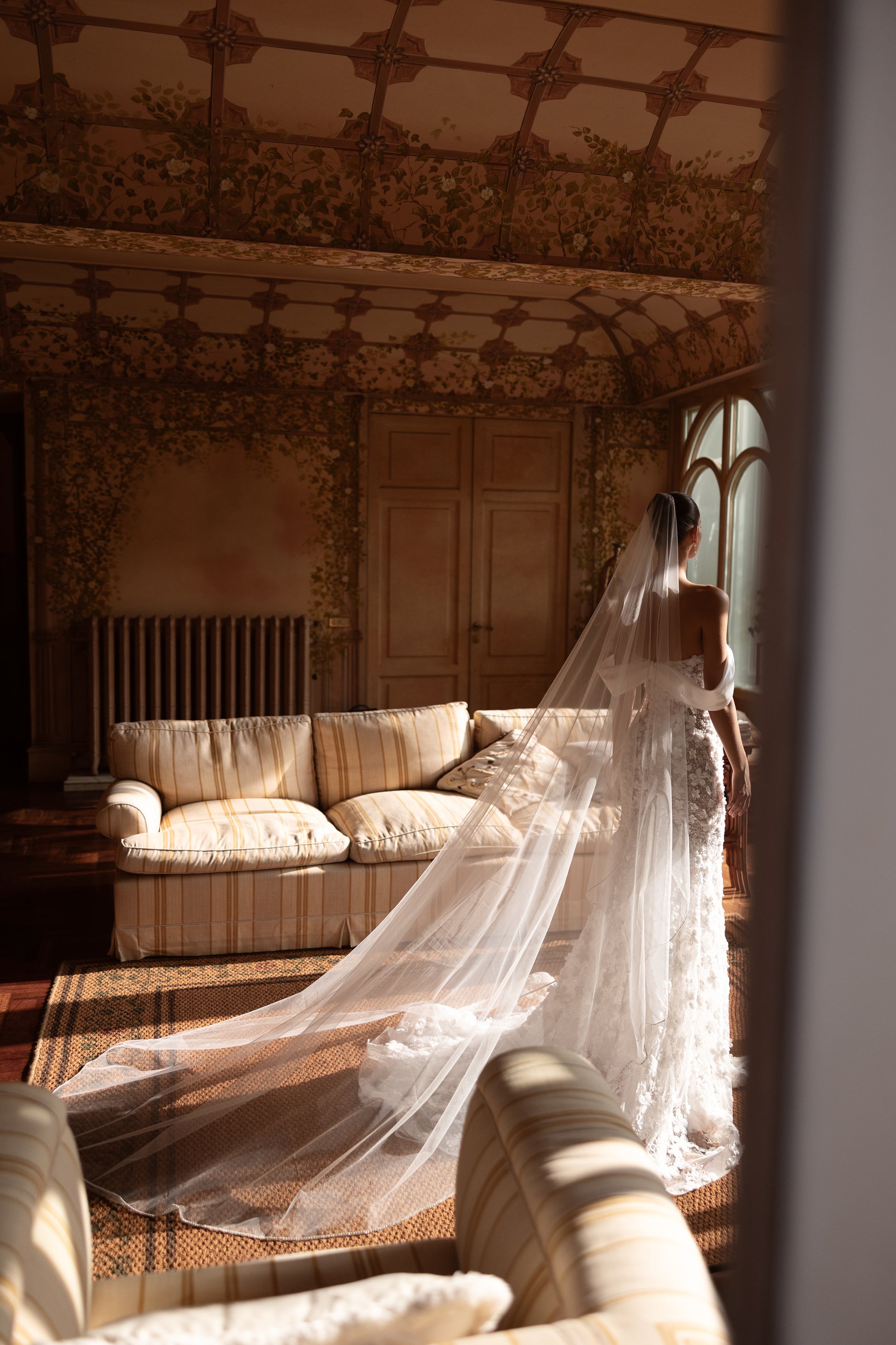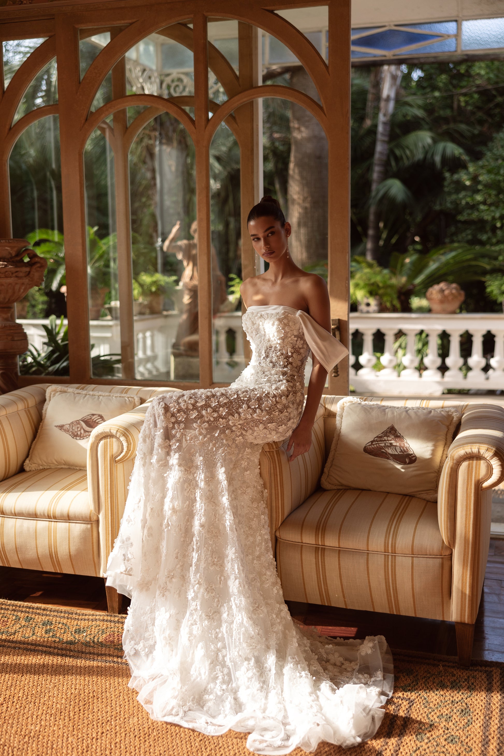 Ivory guipure and shimmering sequins blend in this exquisite gown that feels like spring in full bloom. Wide off-shoulder straps evoke the grace of a garden awakening to life. Feminine and fresh, it’s a poetic ode to renewal and beauty.