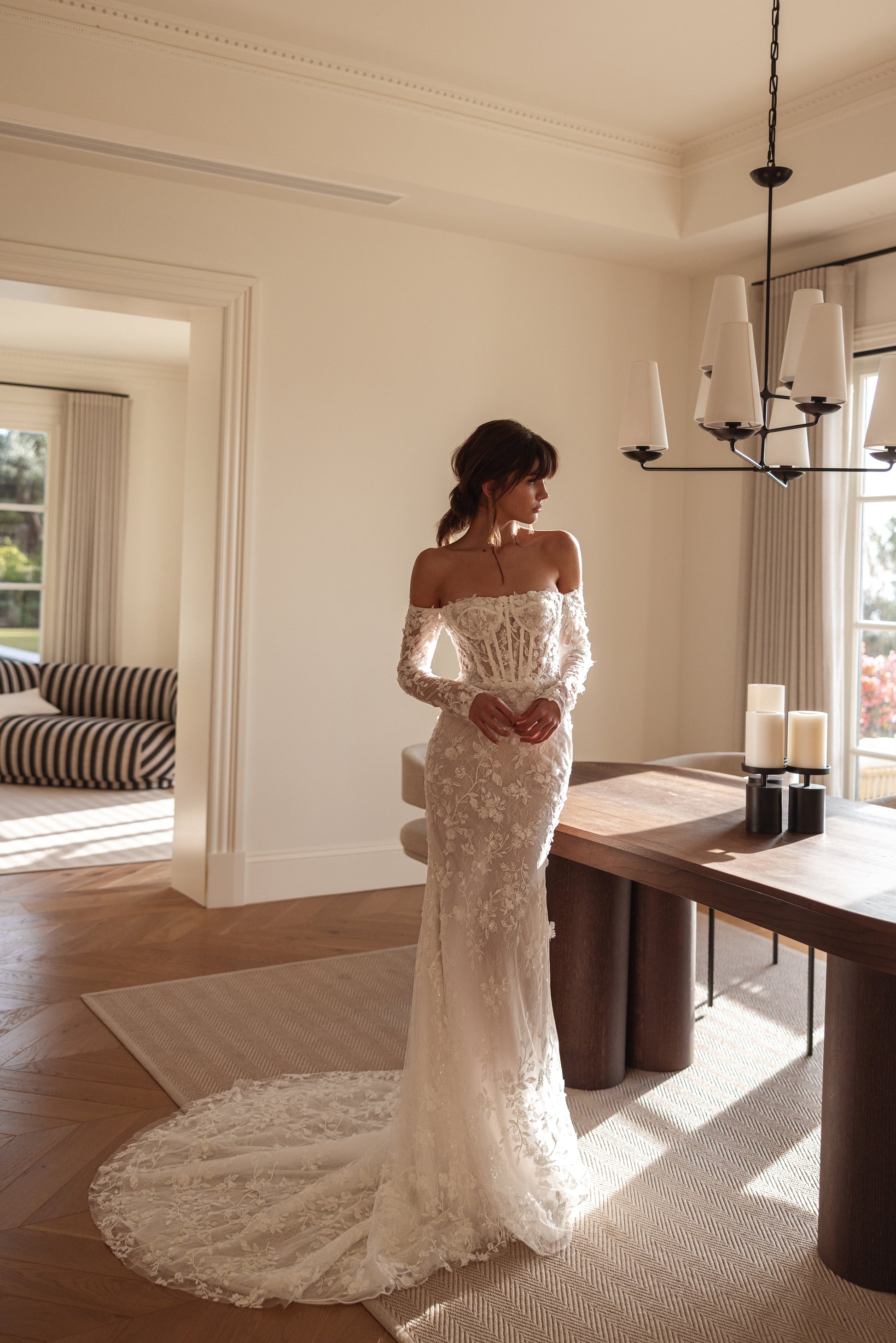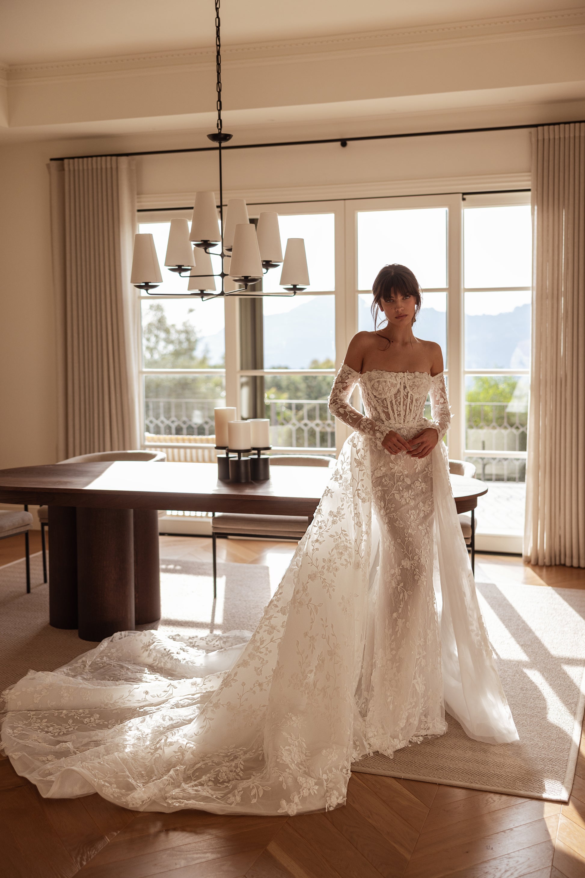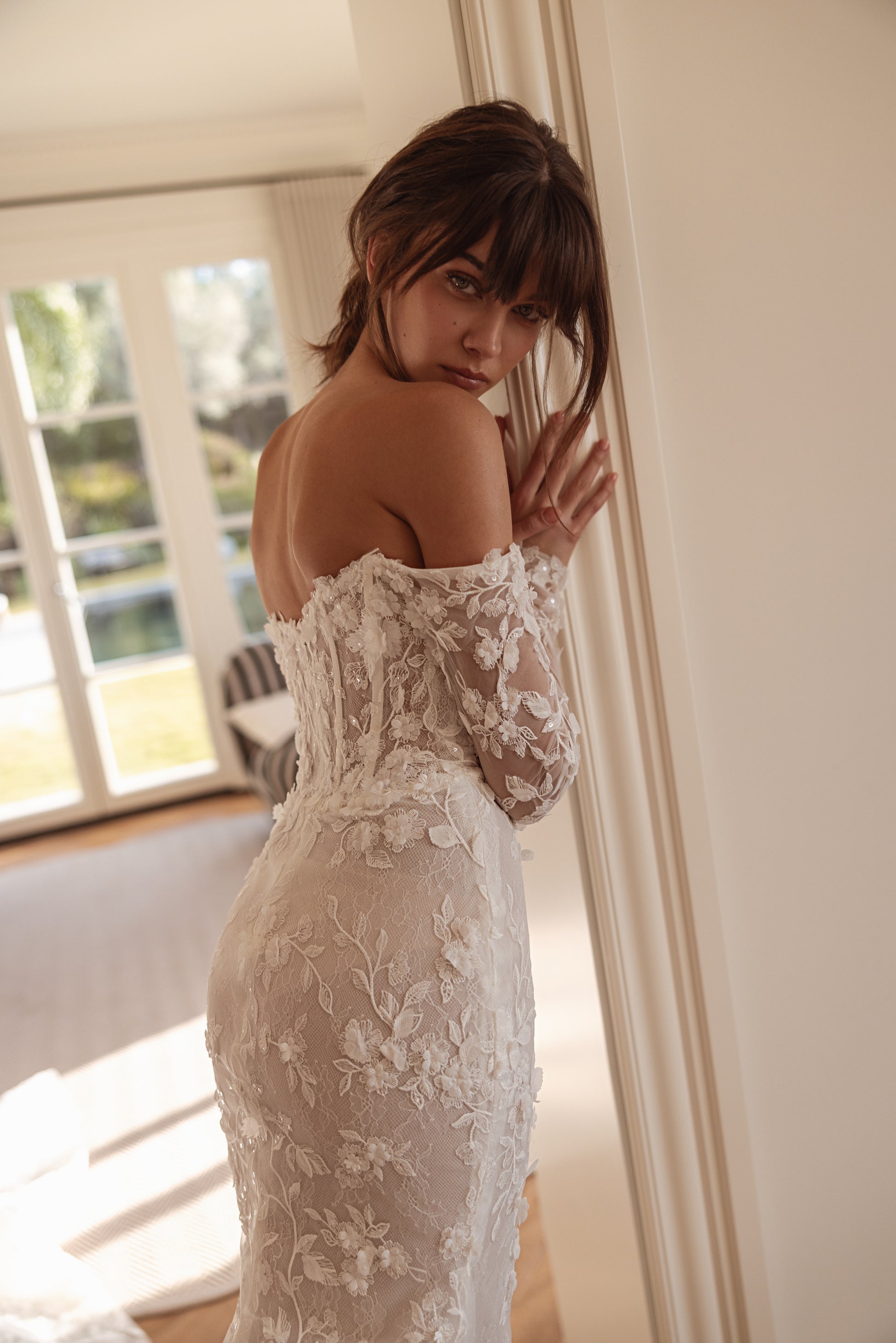 Katy is where couture-level detailing meets modern sensual elegance. The base is a sleek straight silhouette with a structured corset on a sheer foundation, creating a light, second-skin effect while shaping the figure beautifully. The gown is decorated with handmade 3D floral elements, giving it a true high-fashion texture, while Chantilly lace adds softness and depth. A key feature is the removable overskirt, allowing an instant transformation from a sleek straight look into a more dramatic bridal silhouette.