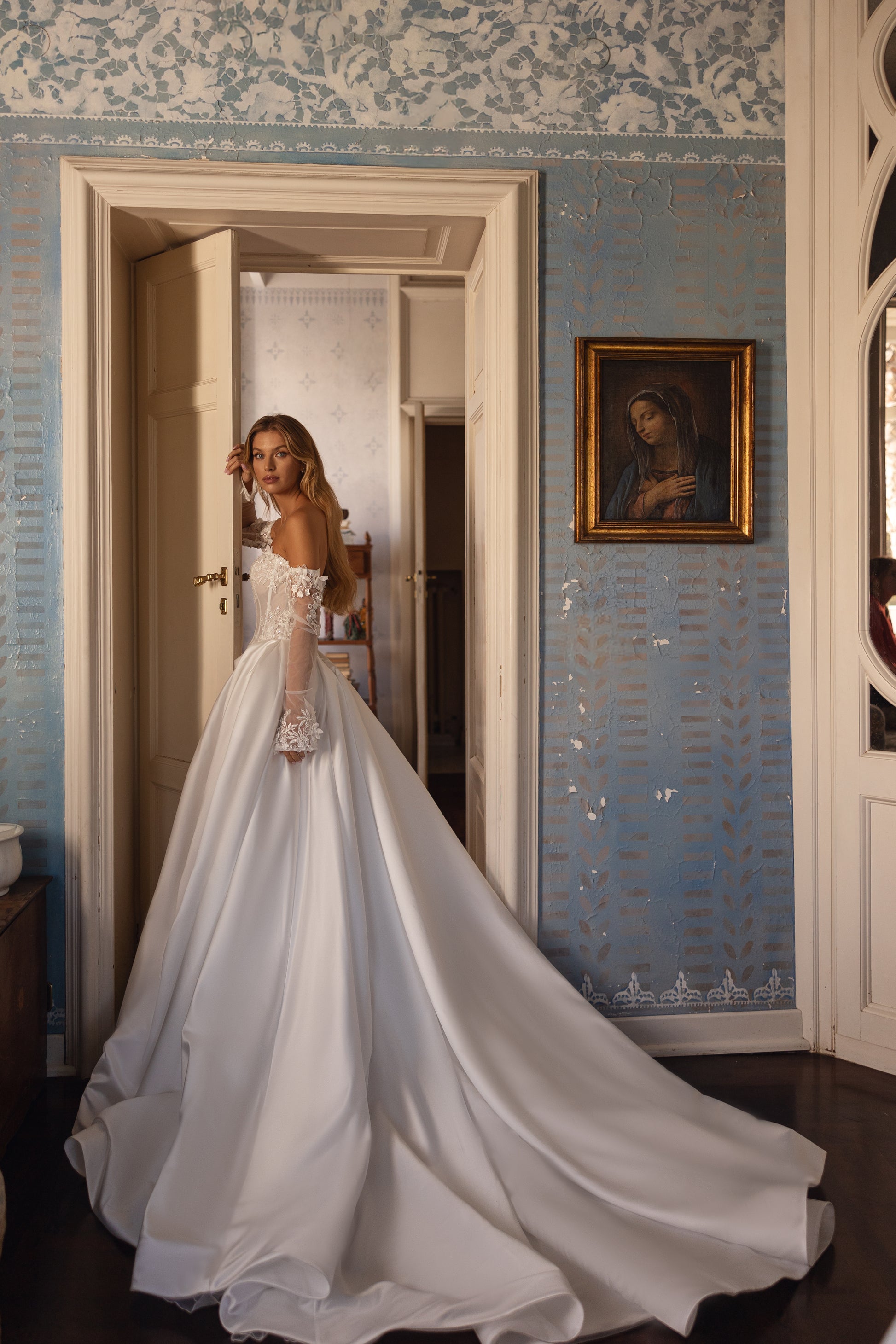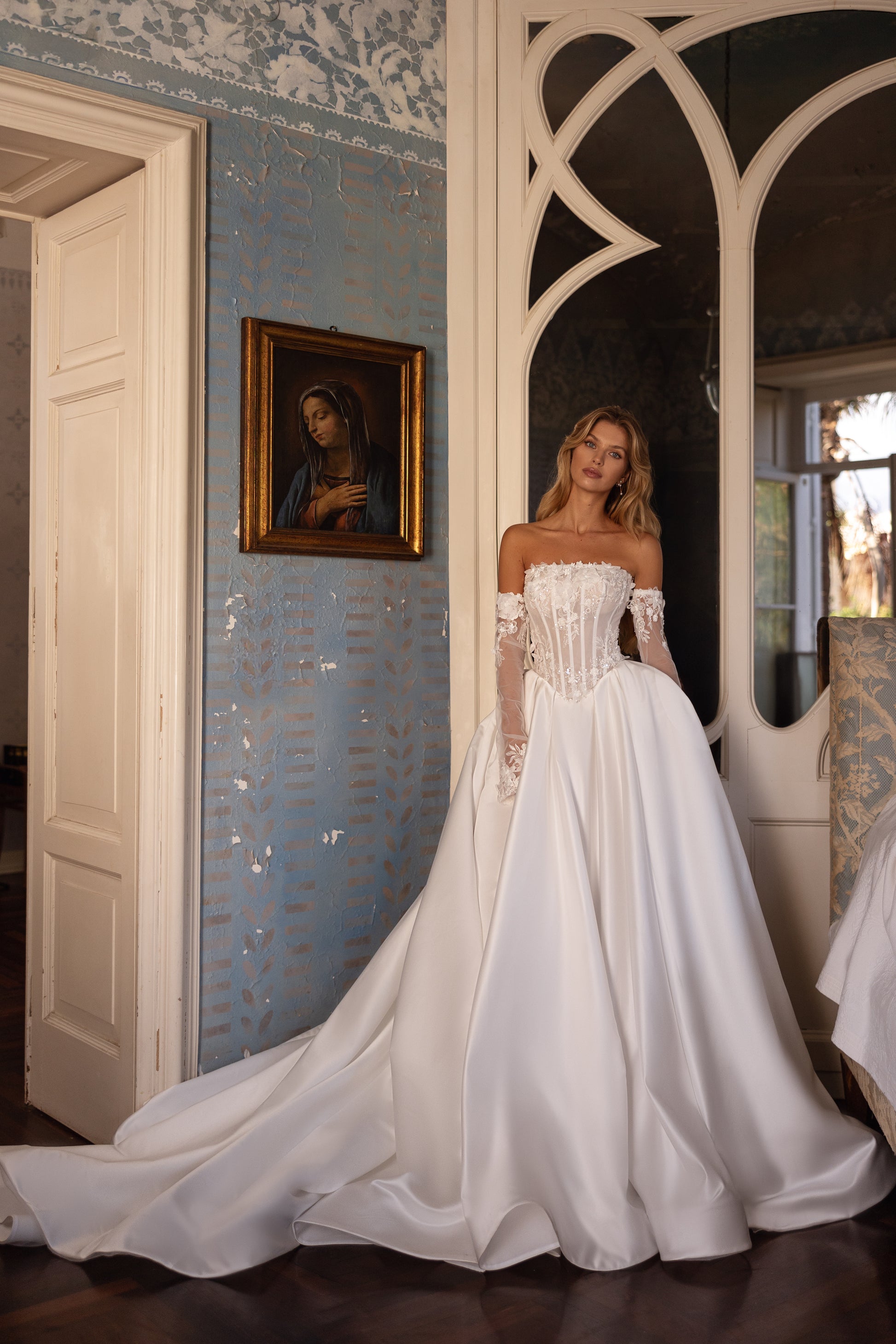 A royal masterpiece of satin and guipure, this ivory gown boasts a grand skirt and a calm straight neckline. 3D floral accents, sequins, and pearls add exquisite detail, while removable sleeves offer versatility. Lush and regal, it’s fit for modern royalty.