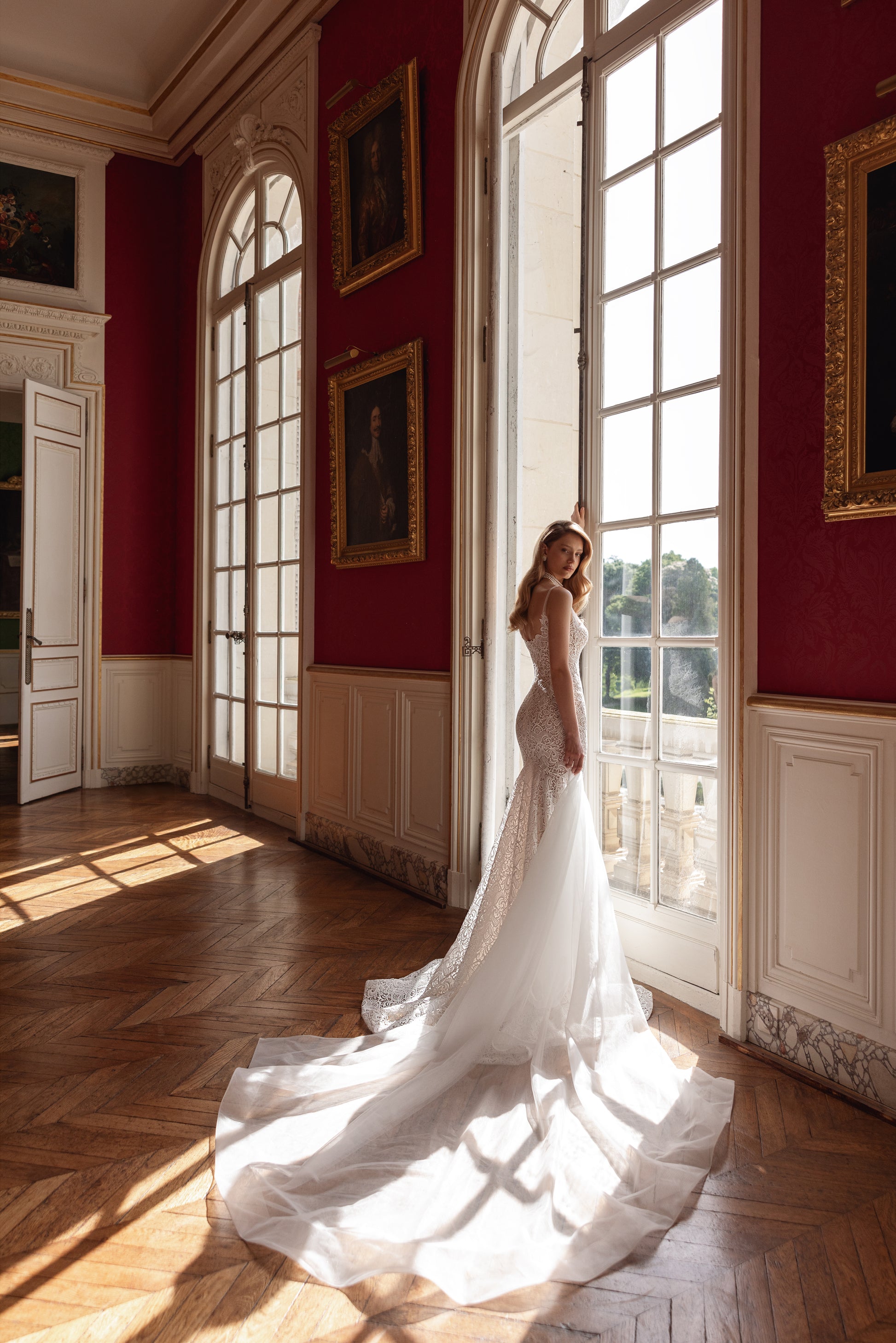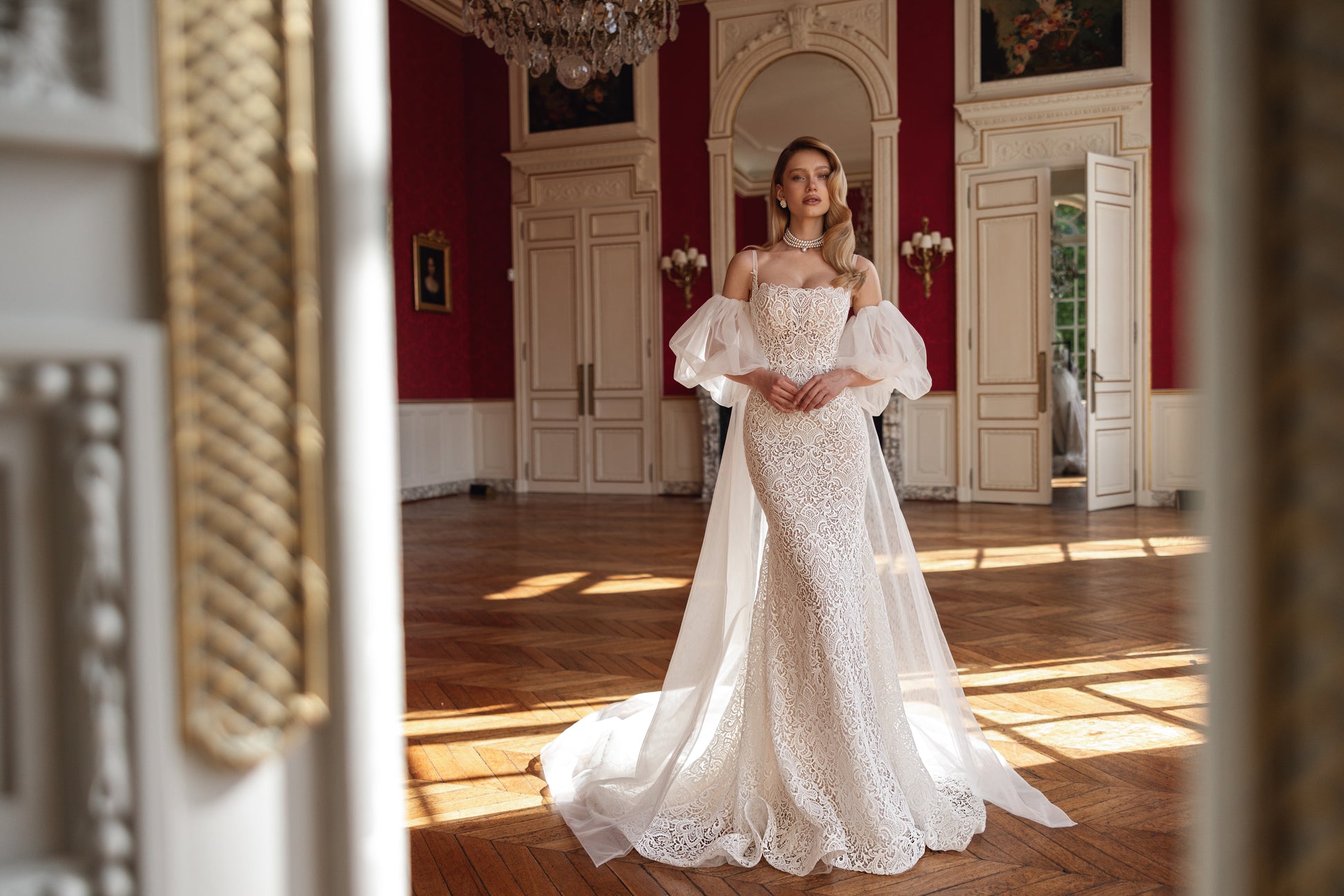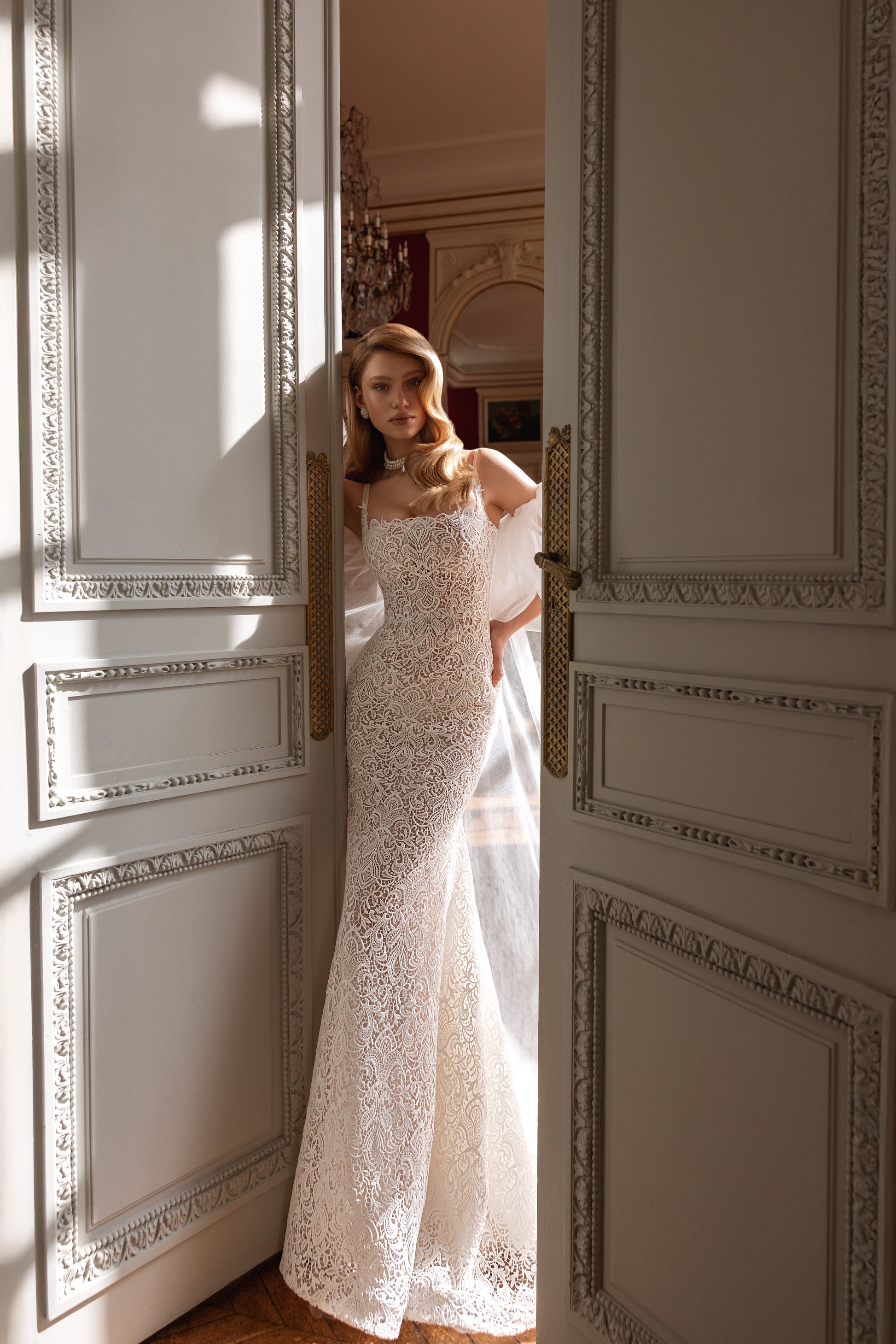 This cappuccino mermaid dress combines guipure with elegant macramé, featuring a detachable organza cape. The straight neckline frames a silhouette of understated warmth and endless elegance. Crafted from handmade fabrics, it whispers quiet luxury and invites the bride into a world of refined sophistication.