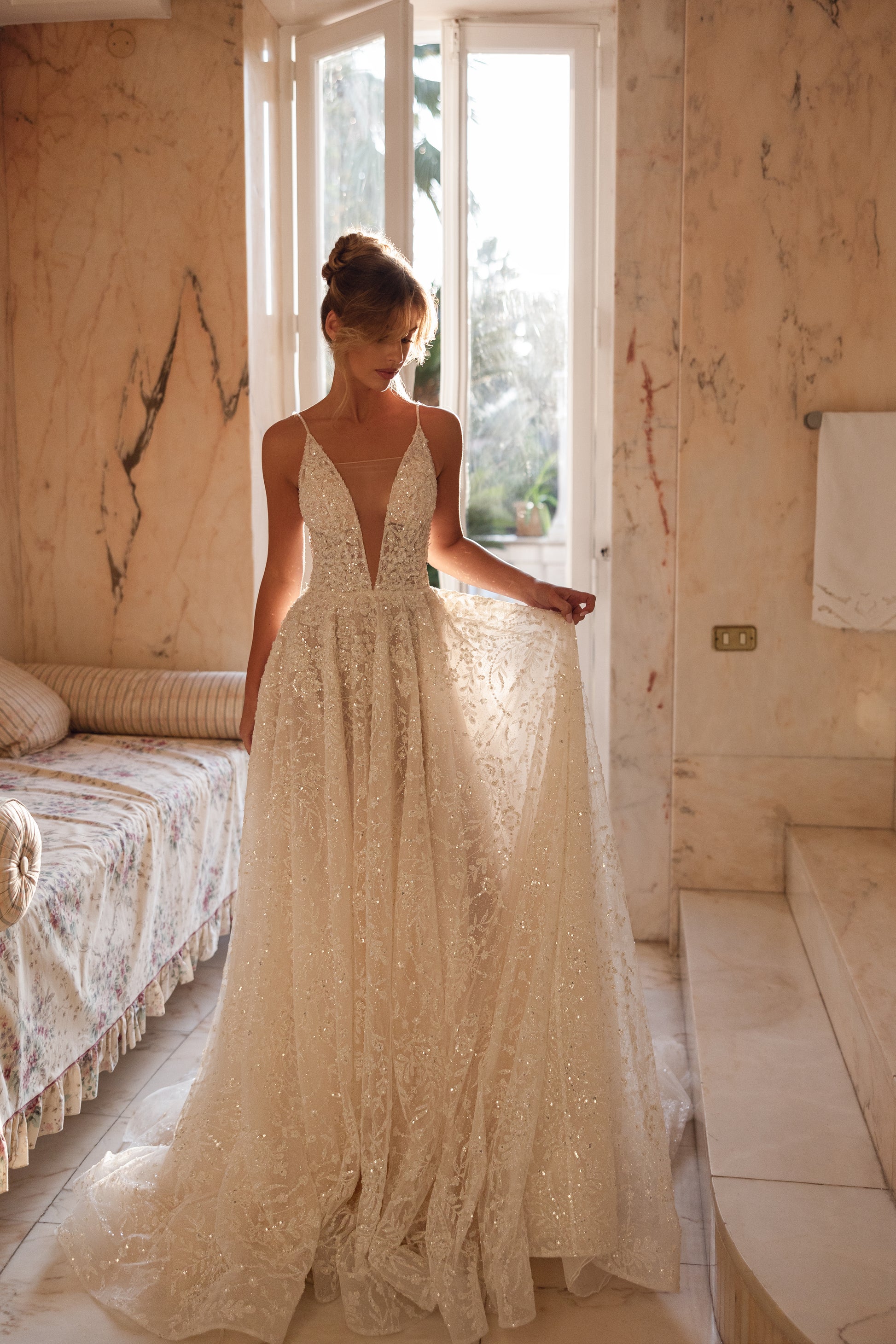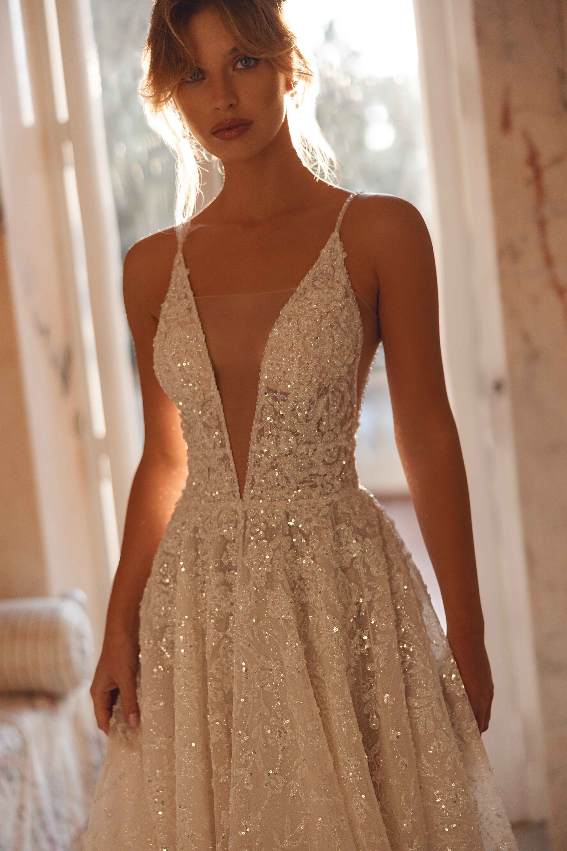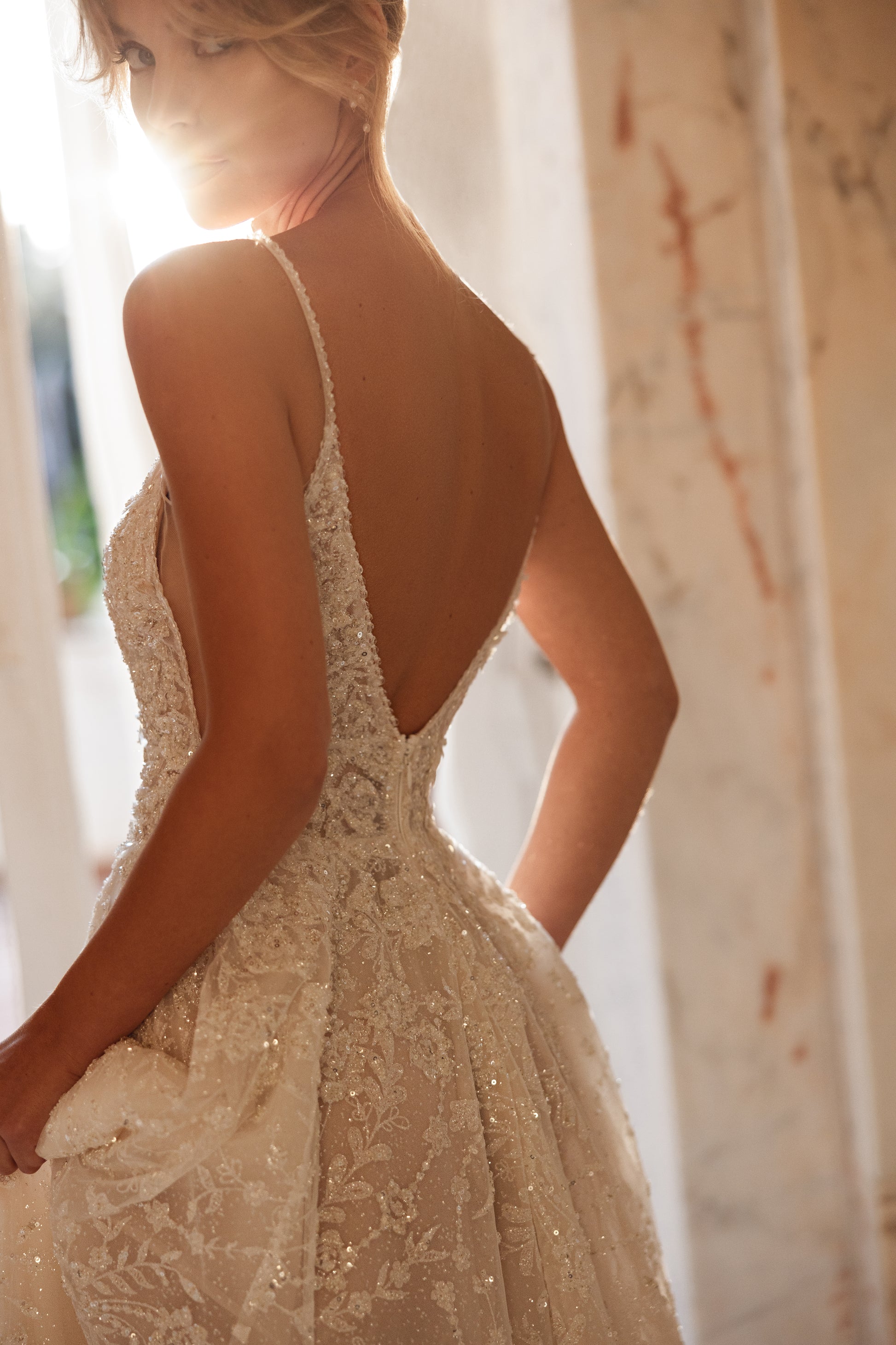 A cappuccino dream that glimmers like morning mist. Crafted from guipure with beads, sequins, and pearls, this gown radiates an effortless airiness and a touch of mystery. Deceptively minimal yet undeniably captivating, it embodies the beauty of understated elegance with a luminous edge.