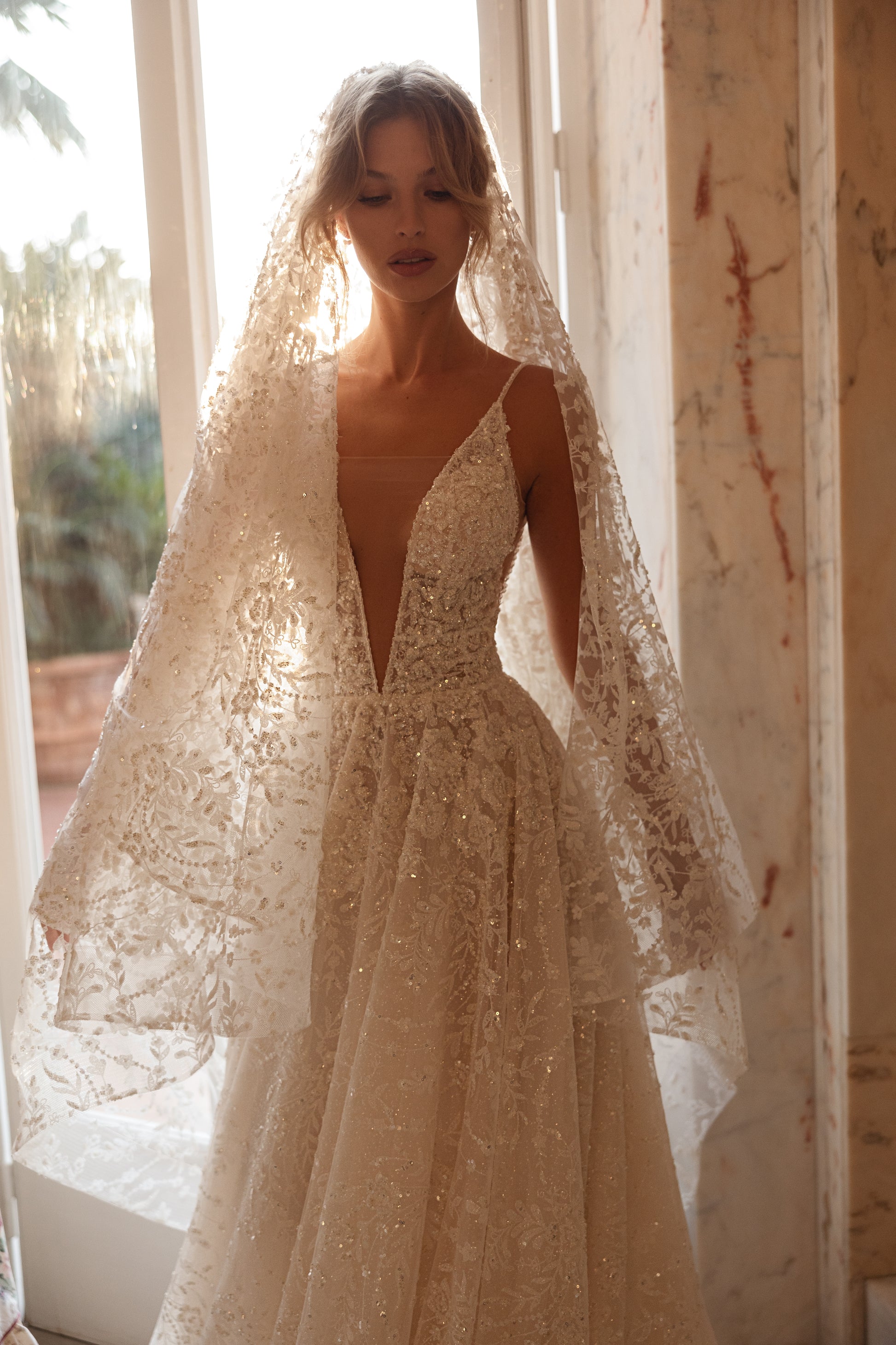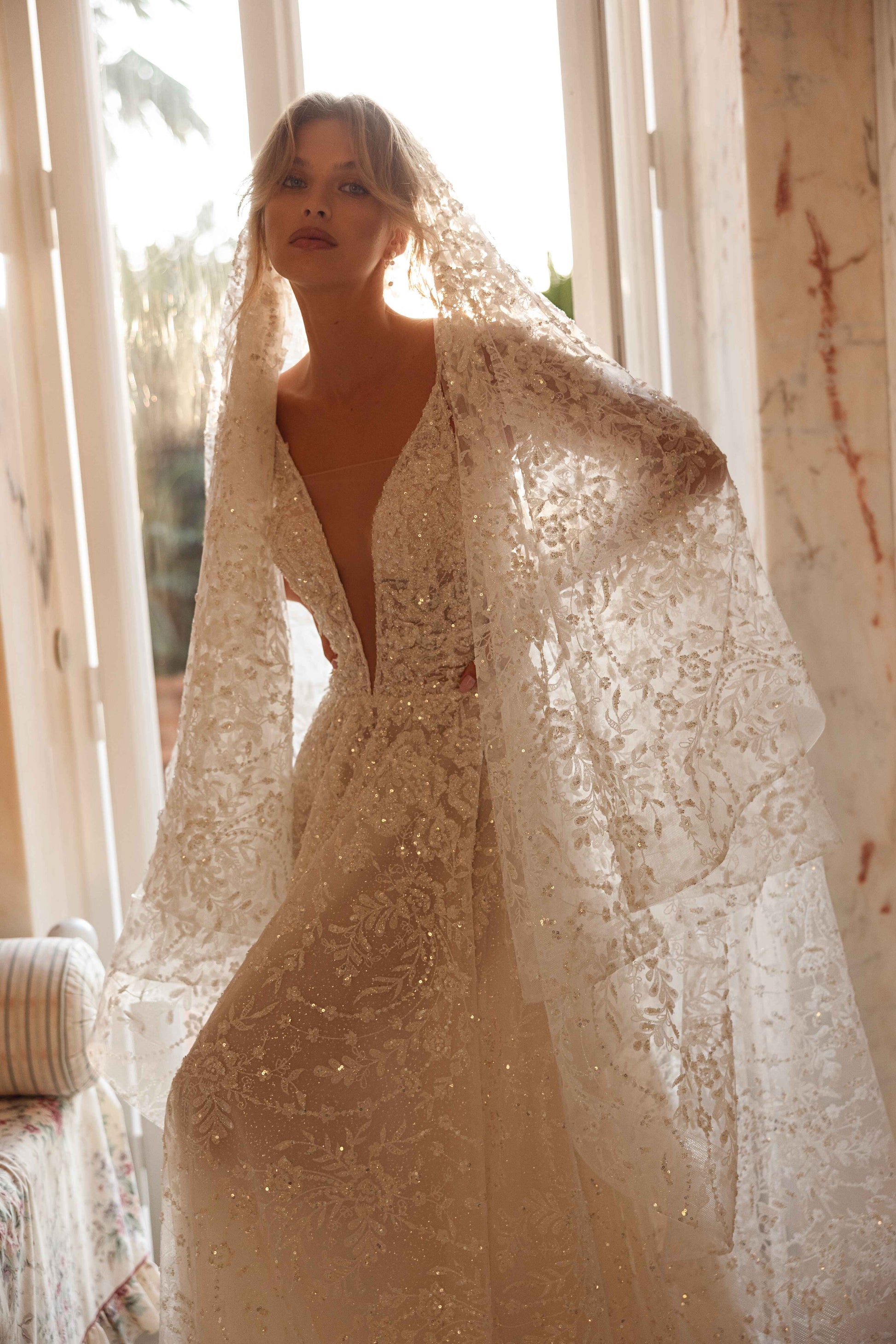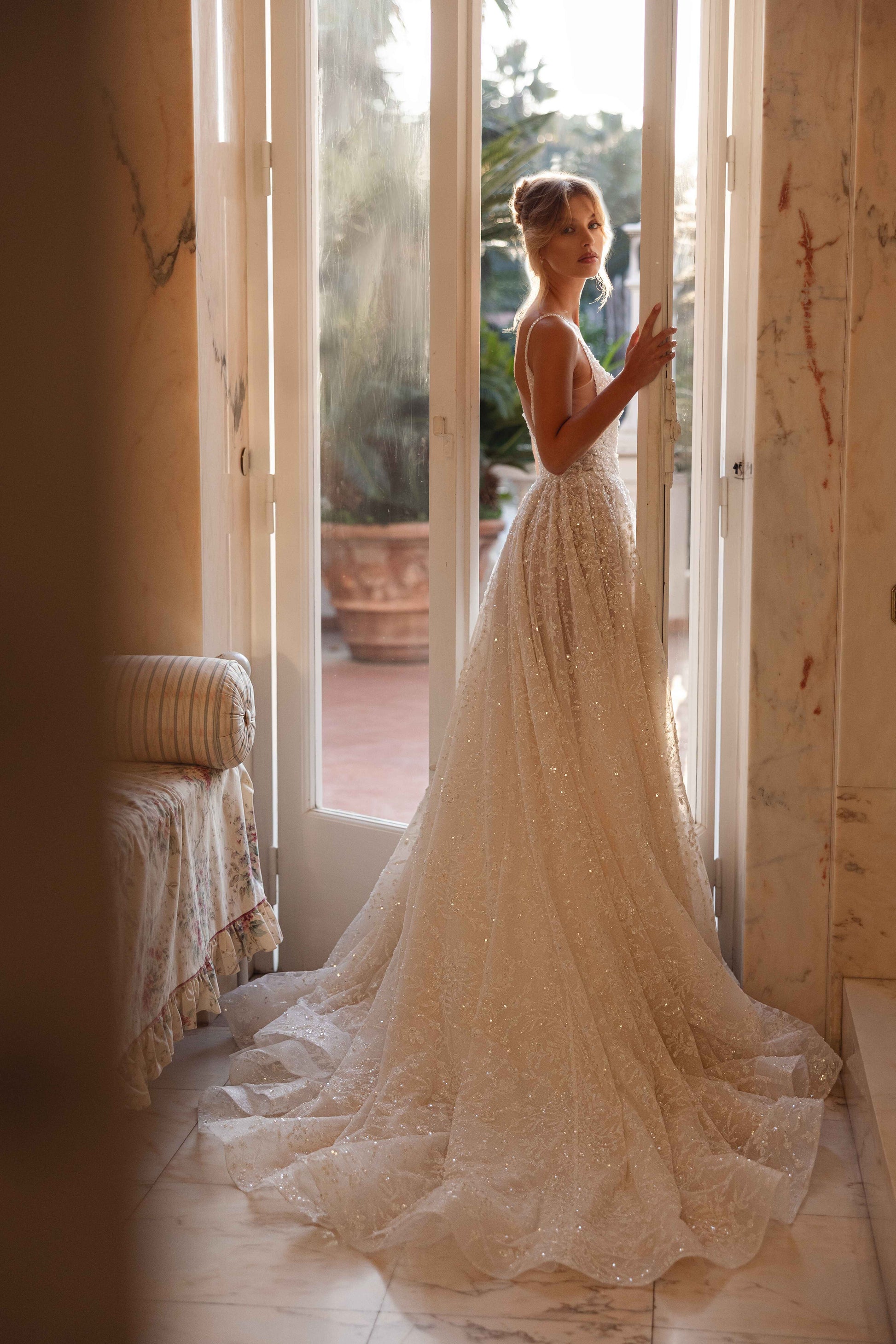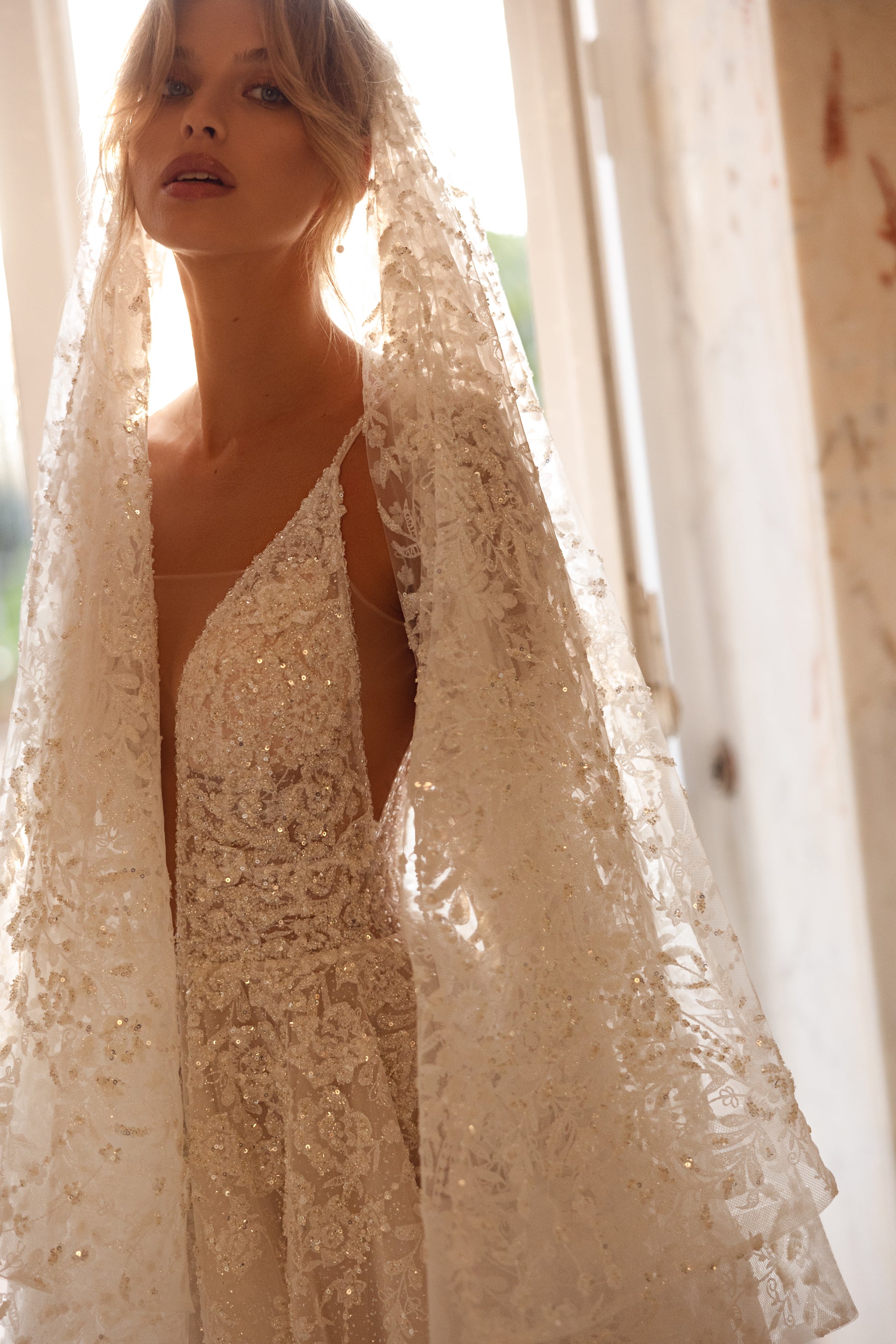 A cappuccino dream that glimmers like morning mist. Crafted from guipure with beads, sequins, and pearls, this gown radiates an effortless airiness and a touch of mystery. Deceptively minimal yet undeniably captivating, it embodies the beauty of understated elegance with a luminous edge.