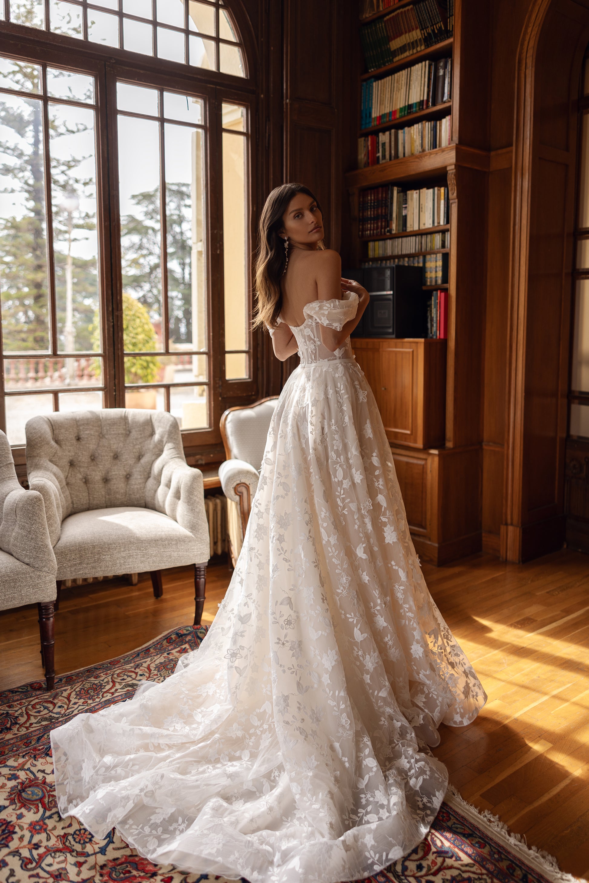 A handcrafted mesmerizing cappuccino lace gown with tulle layers, featuring a sweetheart neckline and off-shoulder elegance. Its dreamy, naive allure highlights a soft, romantic style that’s perfect for a fairytale-inspired celebration.