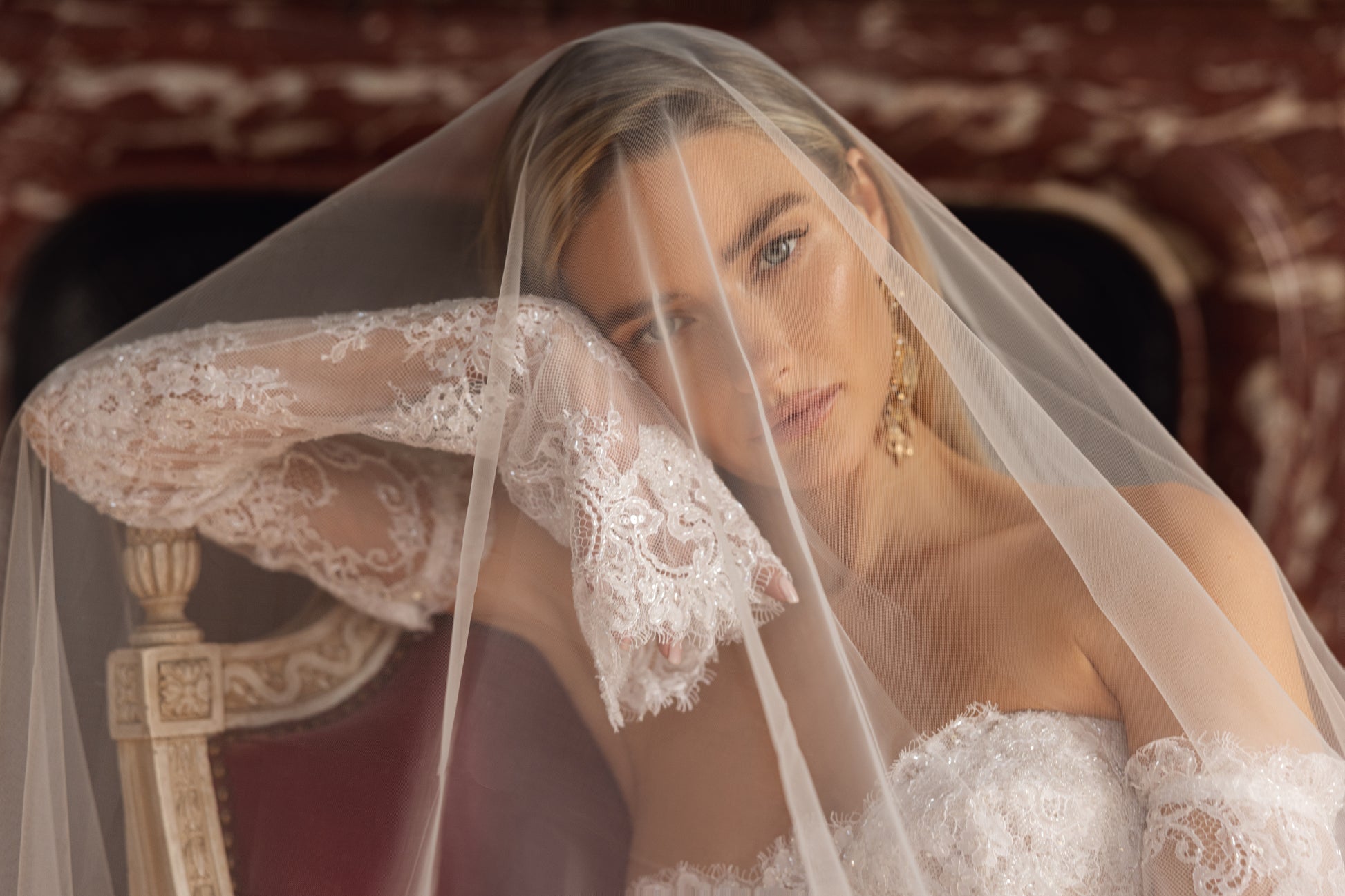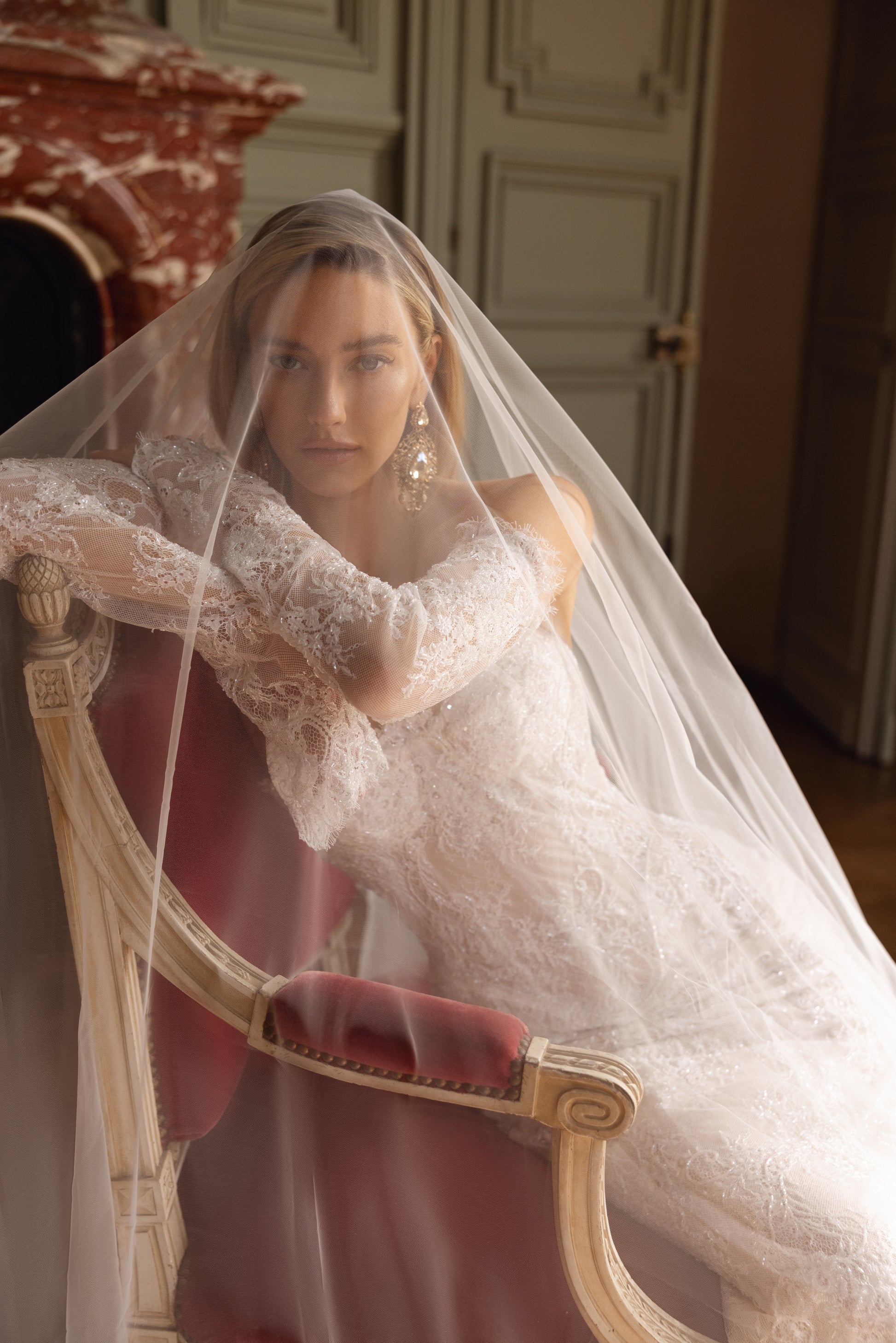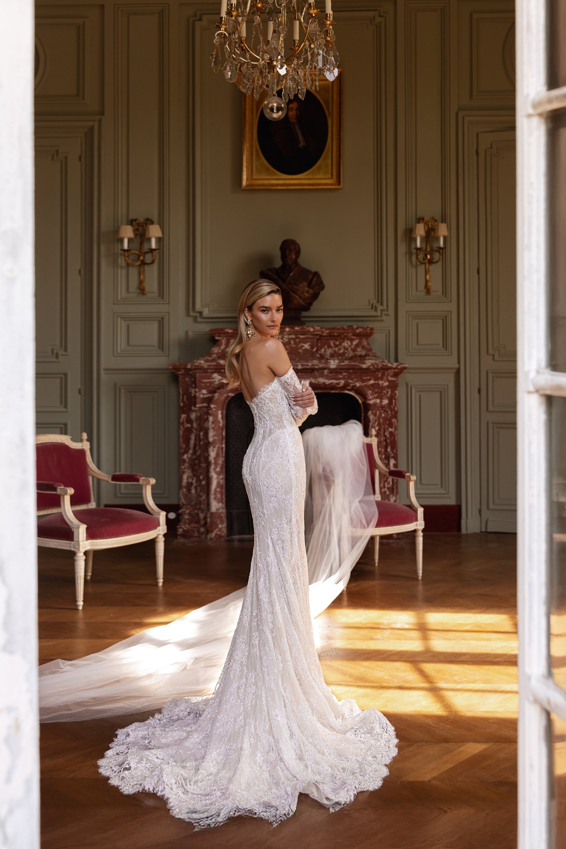 A cappuccino mermaid lace gown embroidered by hand with beads and sequins, complete with detachable sleeves. The sweetheart neckline highlights playful yet elegant details, as the delicate textures soften the look. This couture piece balances grace with youthful spirit, creating a soft and inviting bridal charm.