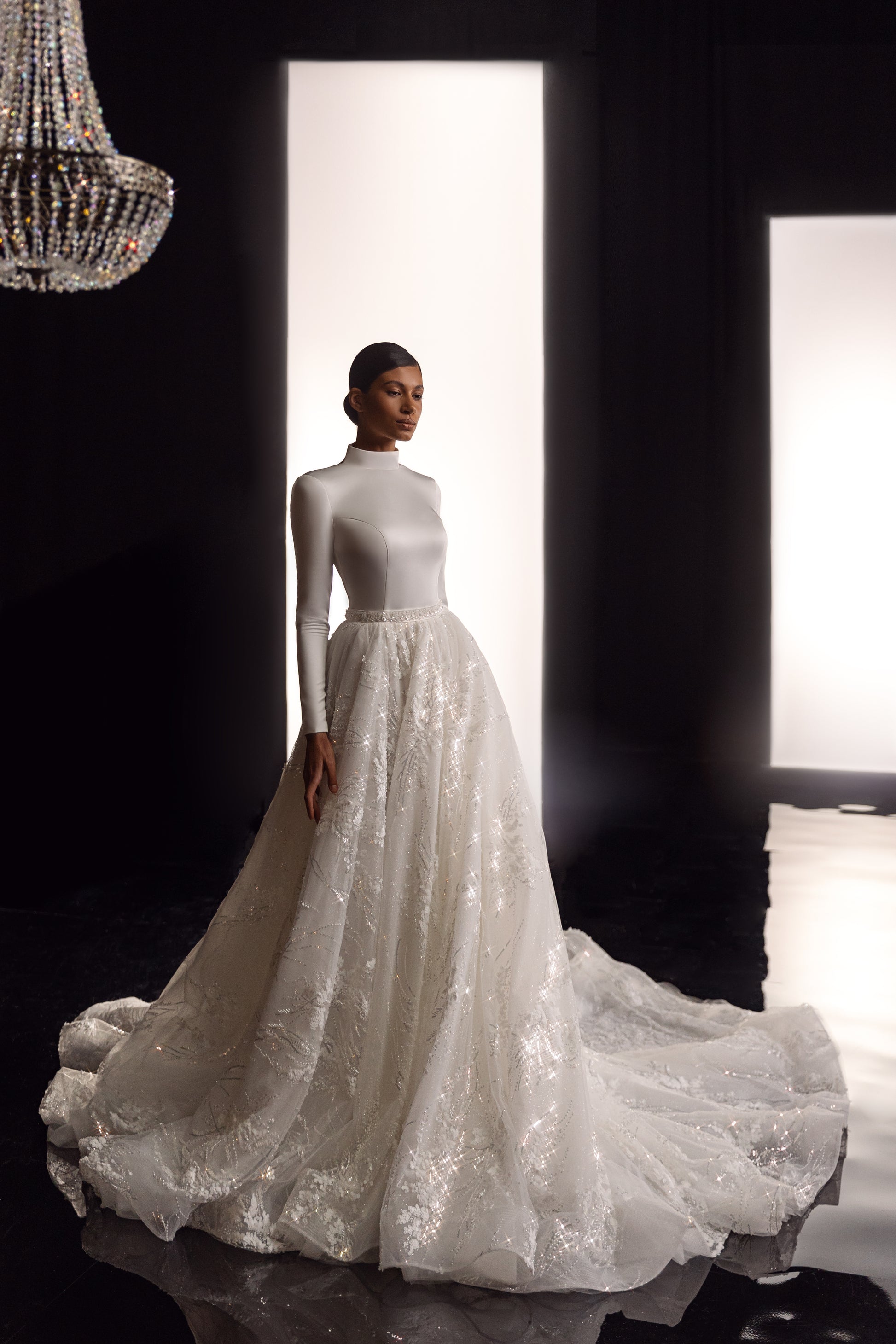 This ivory masterpiece fuses a satin bodice with a guipure skirt shimmering with sequins and beads. Graceful as a ballerina, it features a closed satin top and a striking V-shaped open back with a neck collar. A hand-beaded belt cinches the waist, accentuating the flowing, blooming princess skirt that trails long behind—elegant and surprising.