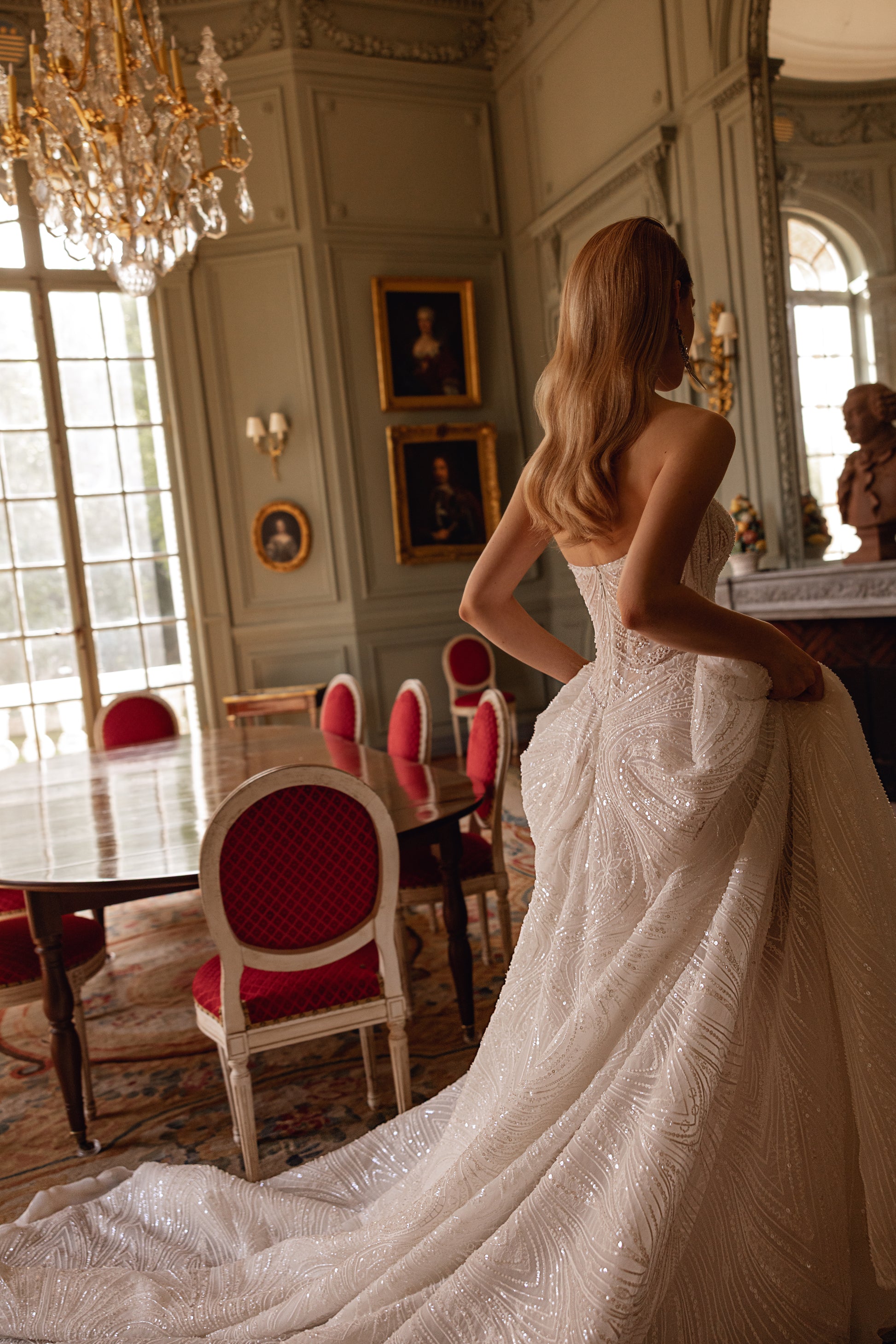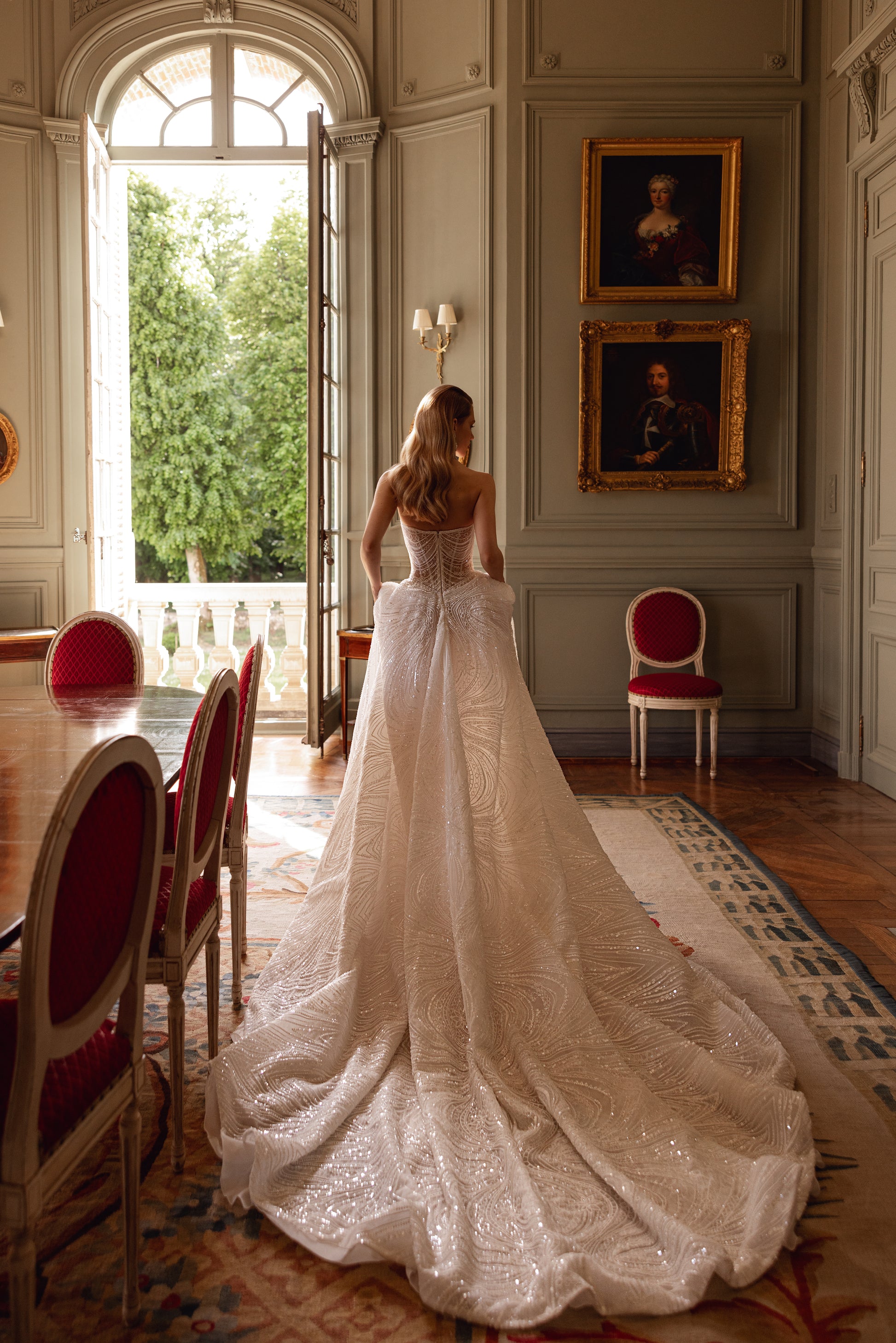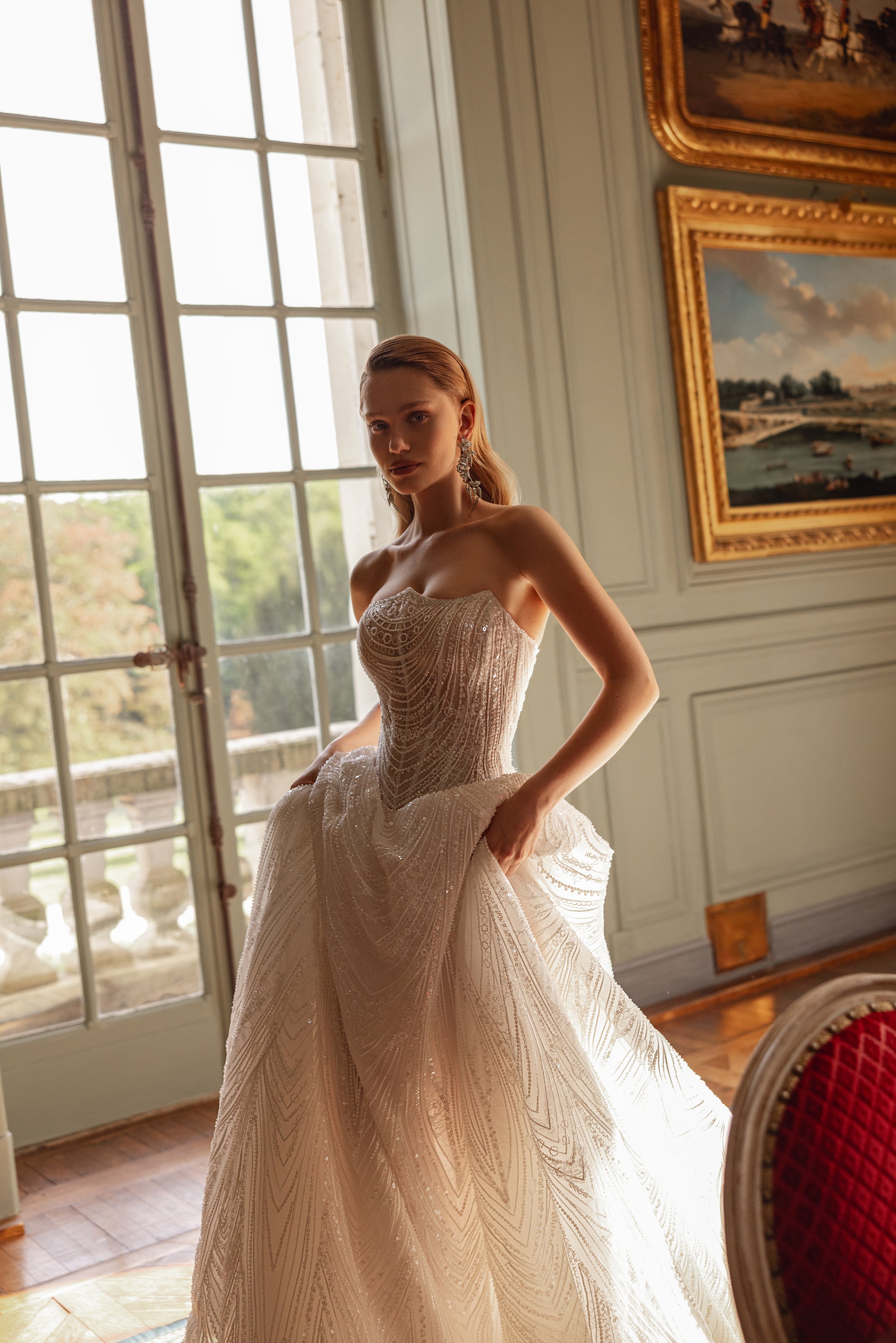 In ivory, this voluminous A-line gown dazzles with a unique underskirt structure made of delicate beaded lace and sequins. The straight neckline and pearl-adorned waist and bodice add a sharp, stylish edge to its princess allure. Crafted from finest fabrics, this dress commands attention with regal poise.