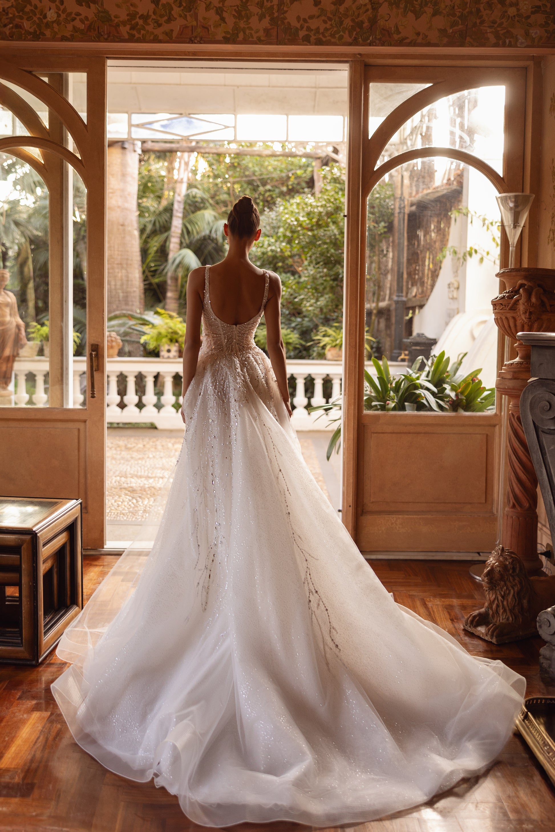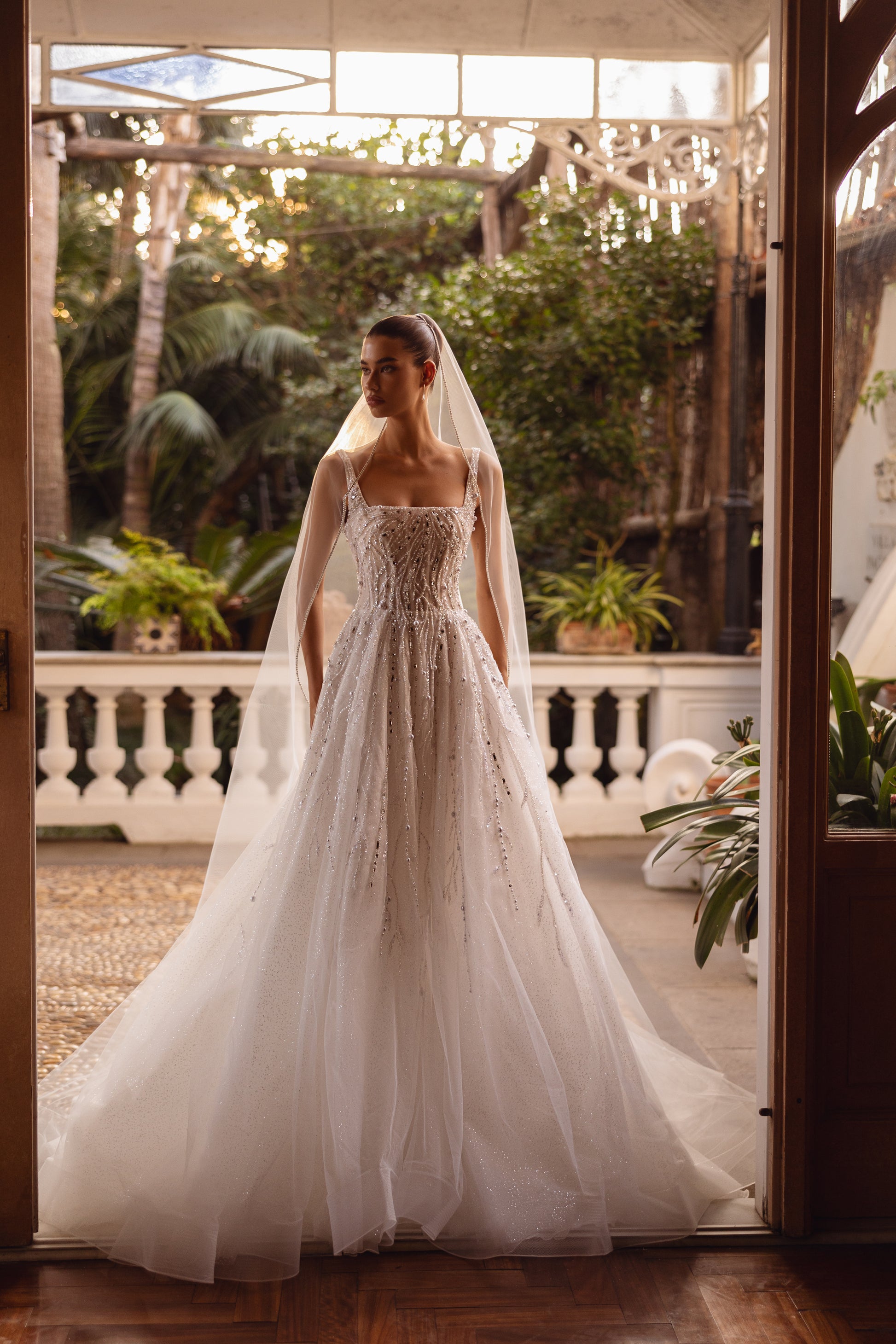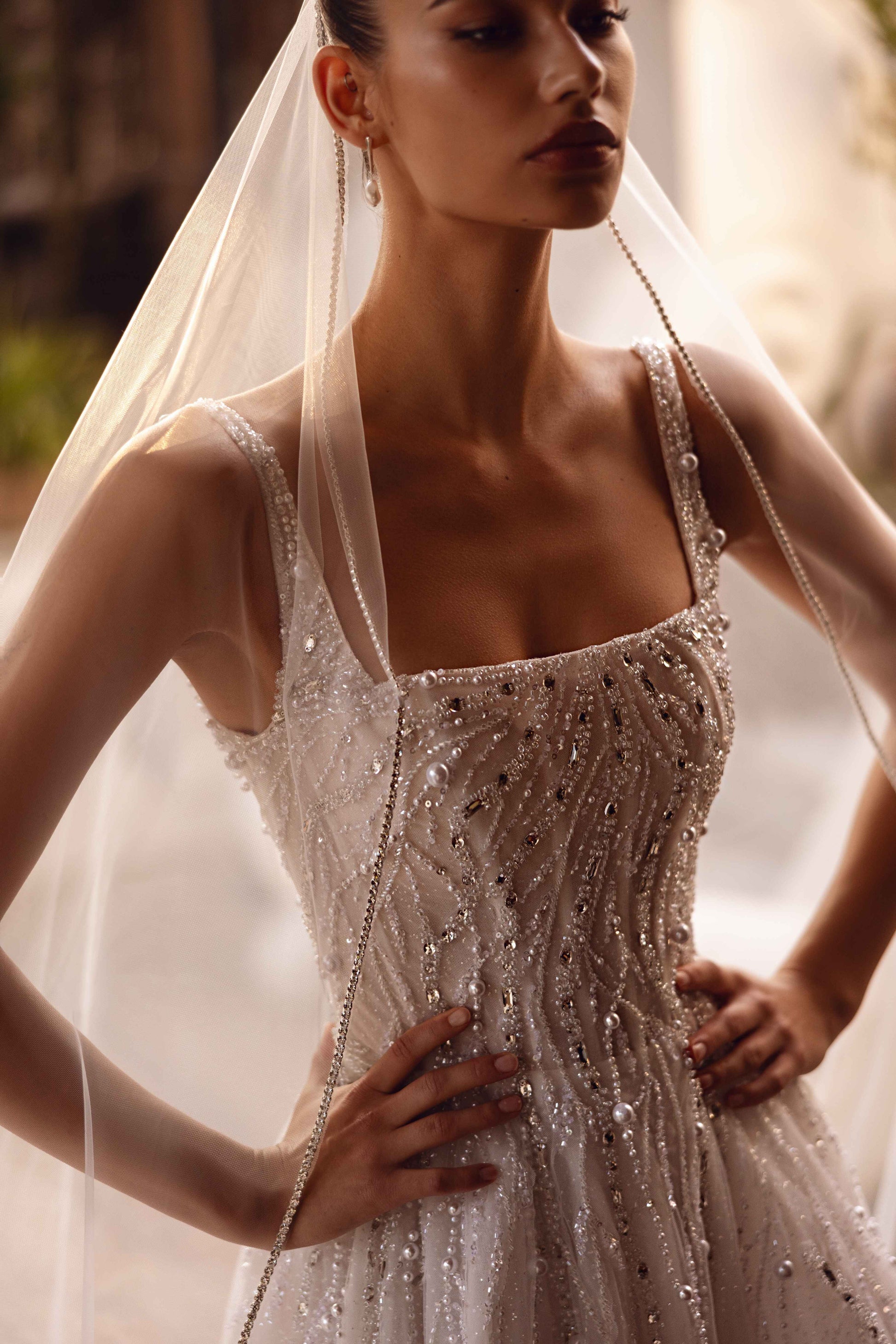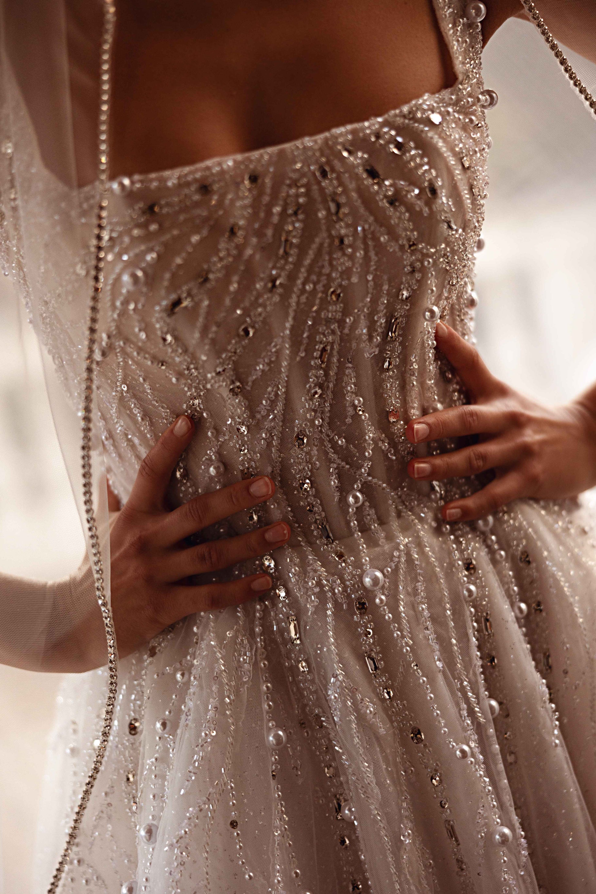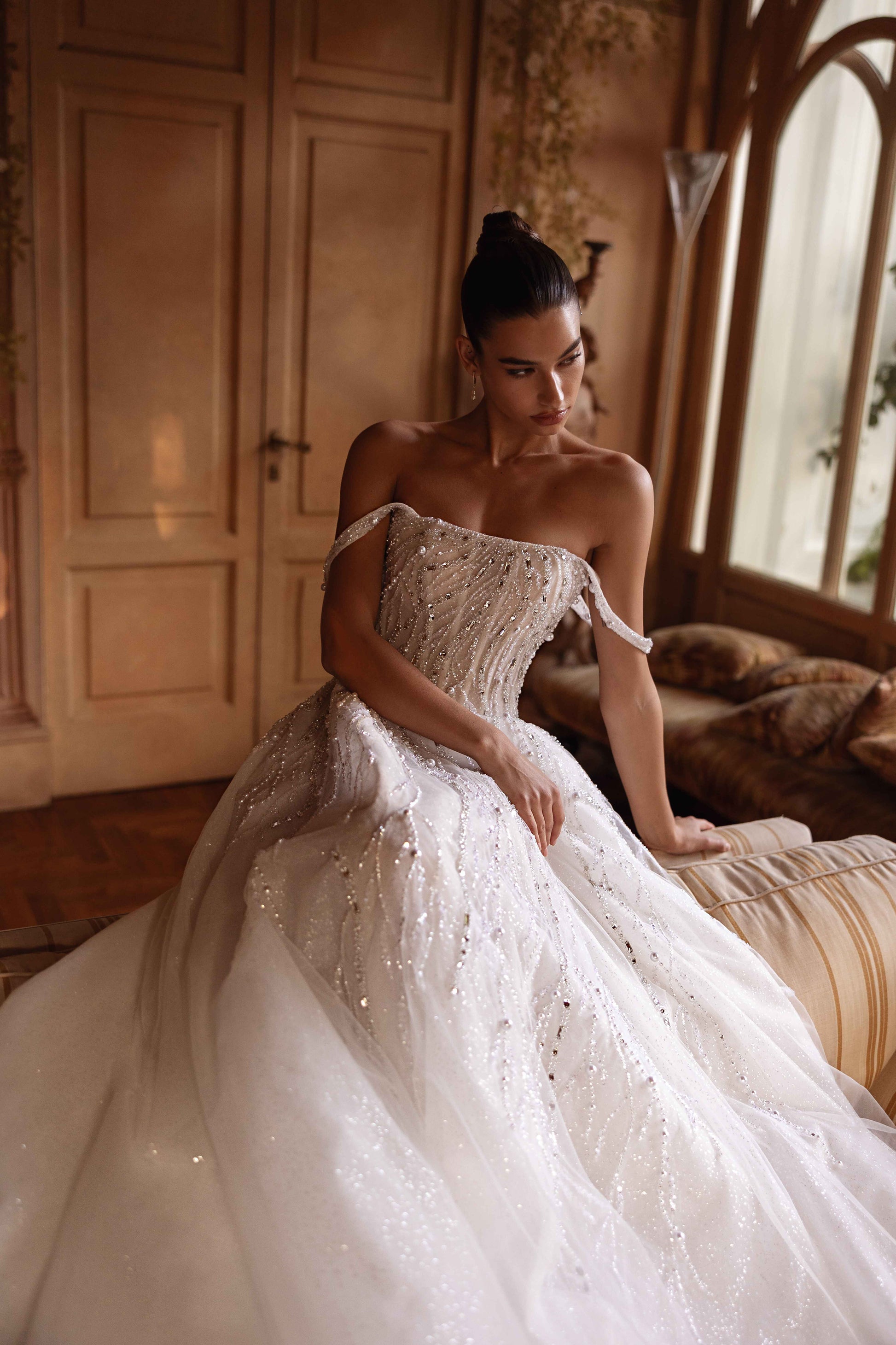 Dominant yet ethereal, this ivory tulle gown exudes strength and refinement. Guipure accents, paired with beads, sequins, and pearls, create a look that’s both airy and assertive. Designed for the bride who embraces self-assured elegance and timeless grace.