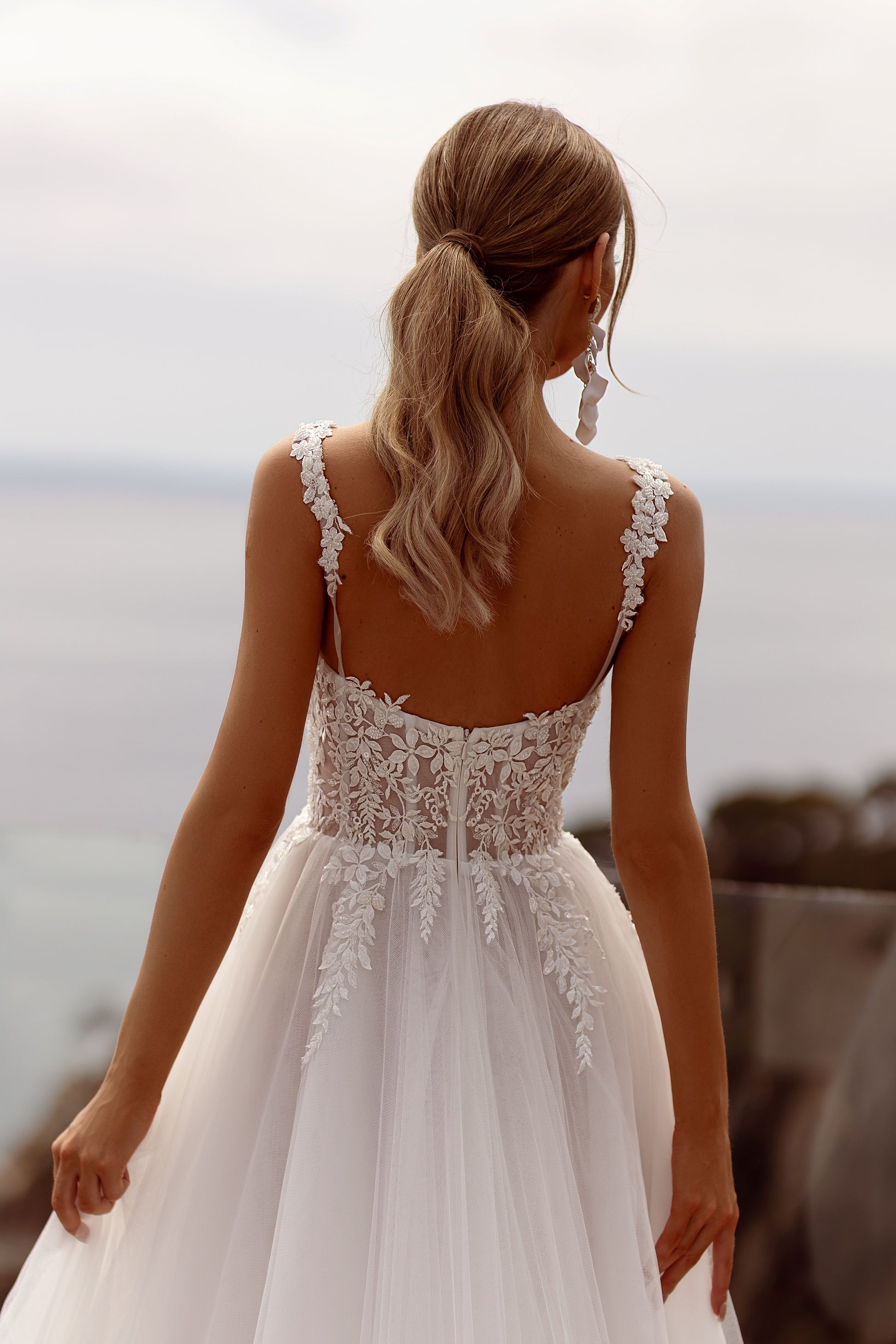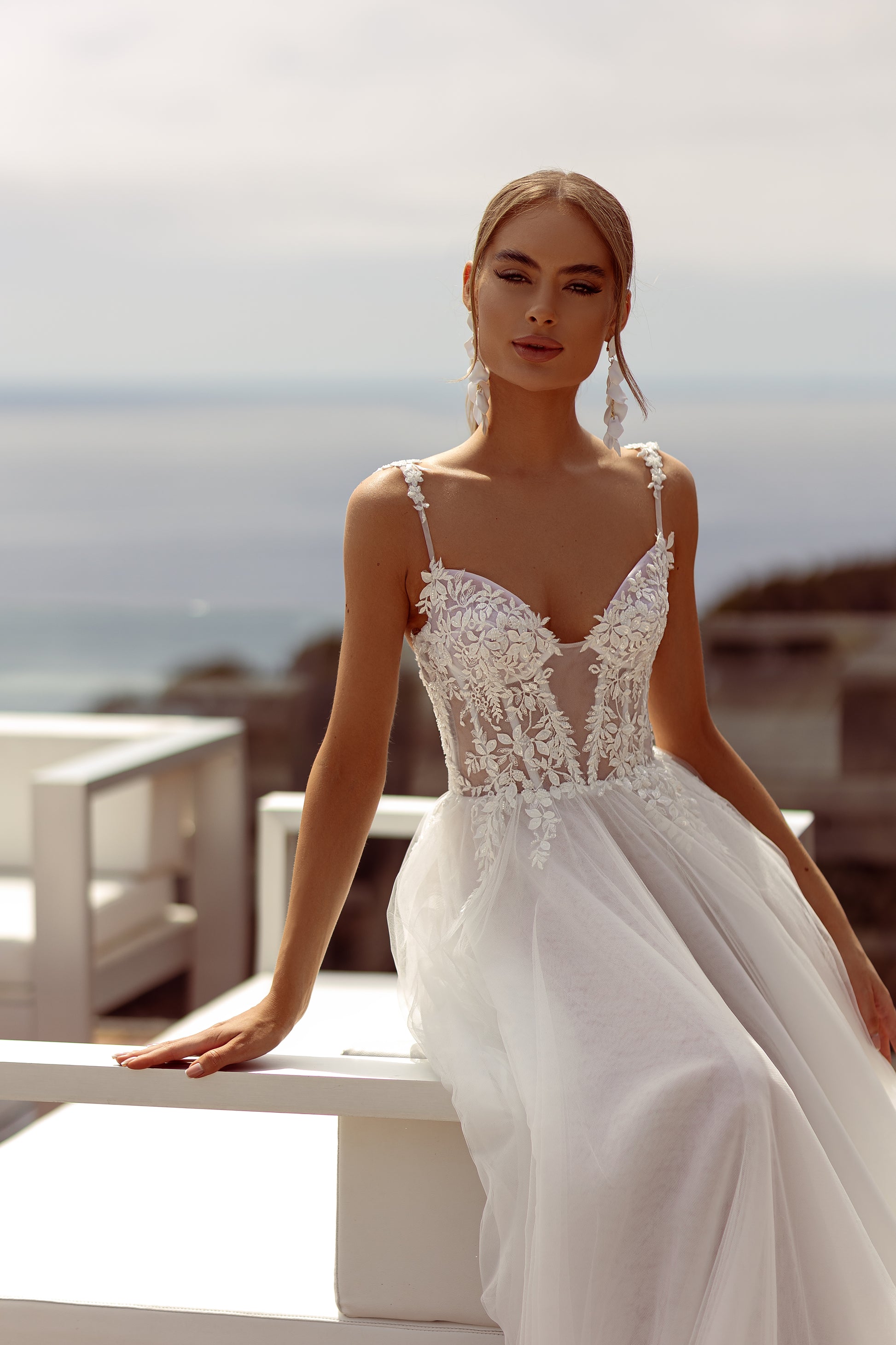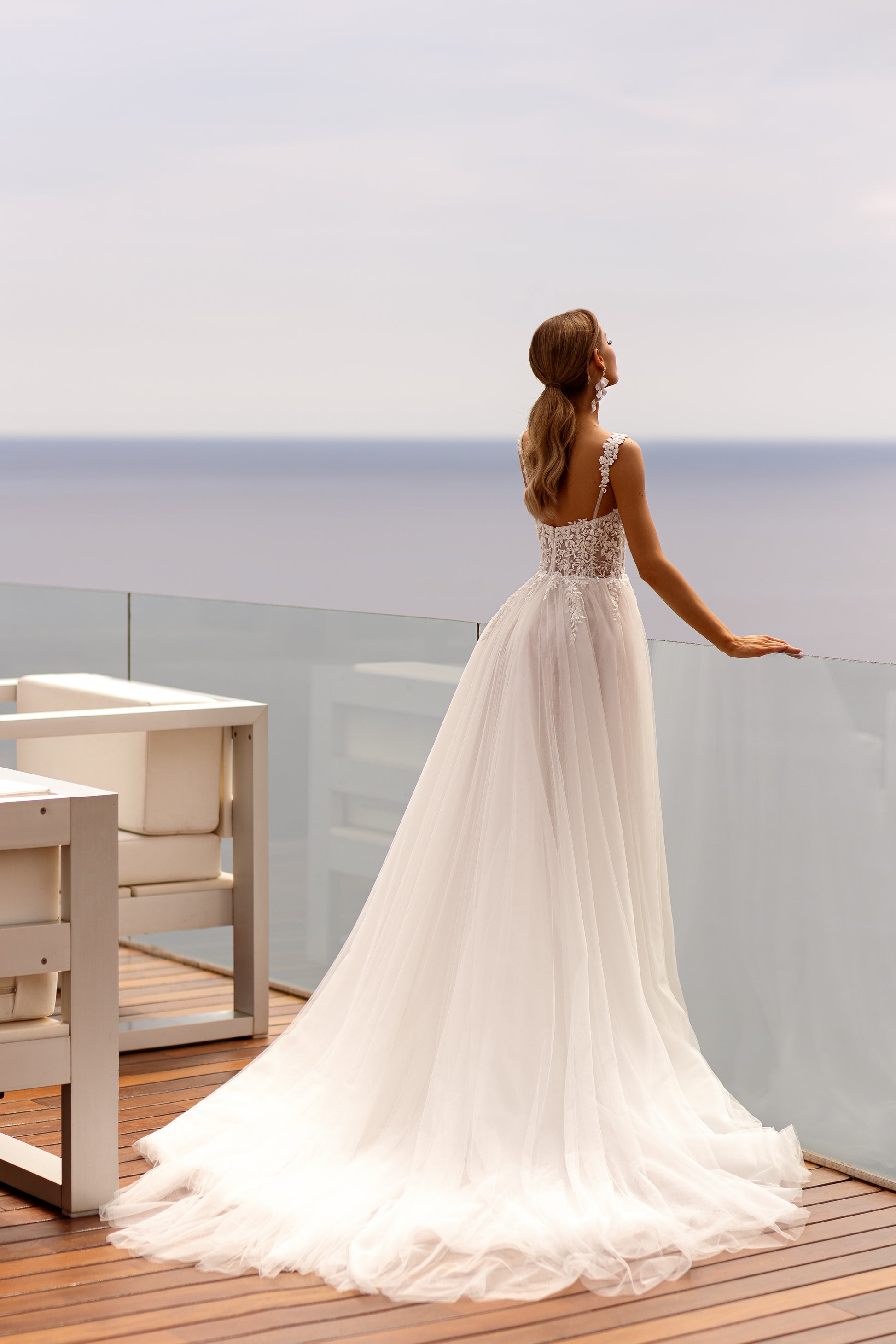 Mercedes is a dream materialized in ivory tulle, guipure, beads, and sequins. Each layer adds depth, creating an enchanting silhouette. Delicate straps provide an air of subtle elegance, while the flowing gown radiates goddess-like grace. It’s the dress of a bride who embodies both strength and soft beauty.