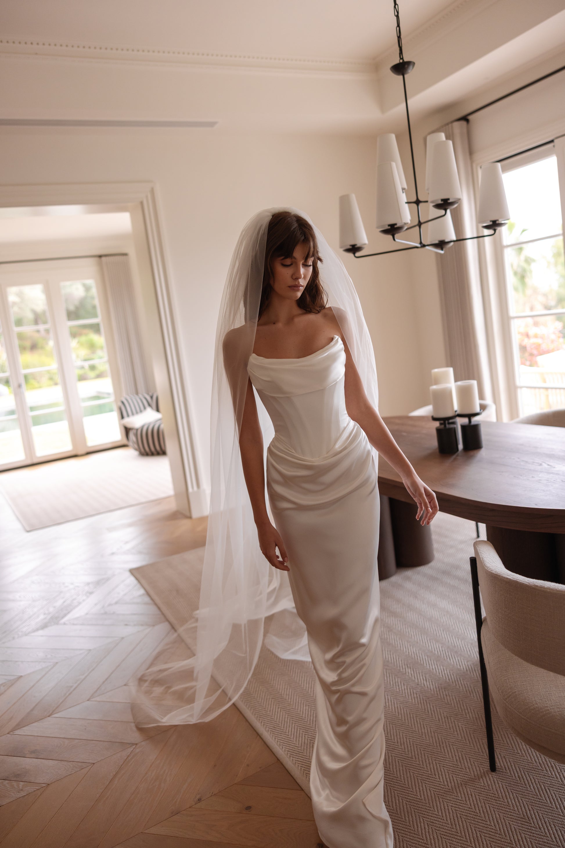 Mirabelle is a modern classic satin gown made for brides who love clean lines and understated elegance. The bodice has a refined corset fit with soft draping across the neckline, adding gentle movement and femininity. The straight silhouette elongates the figure, while the smooth satin reflects light beautifully for a luxurious minimal look. A subtle train completes the design with effortless sophistication.