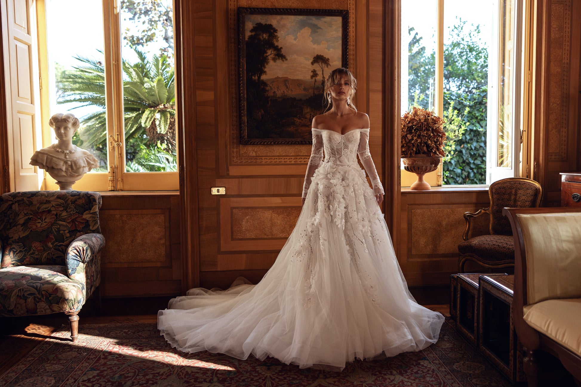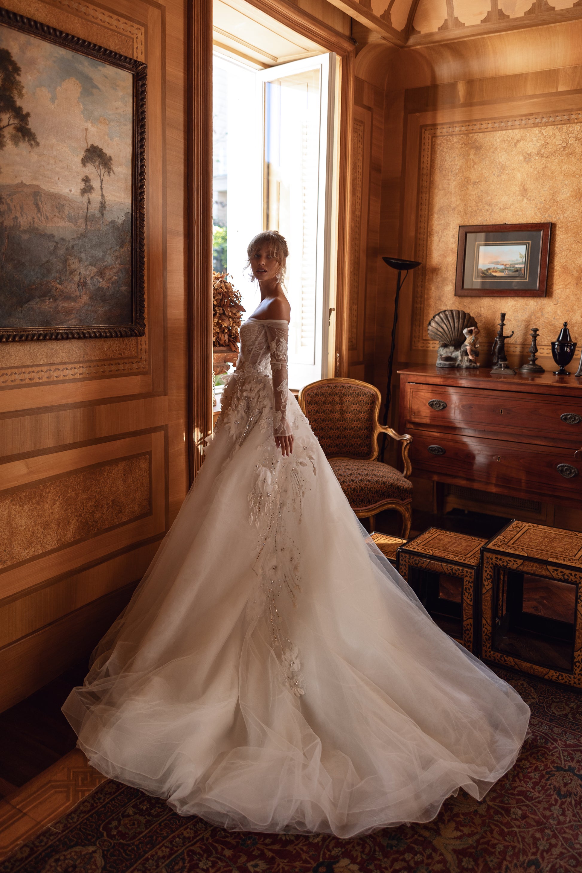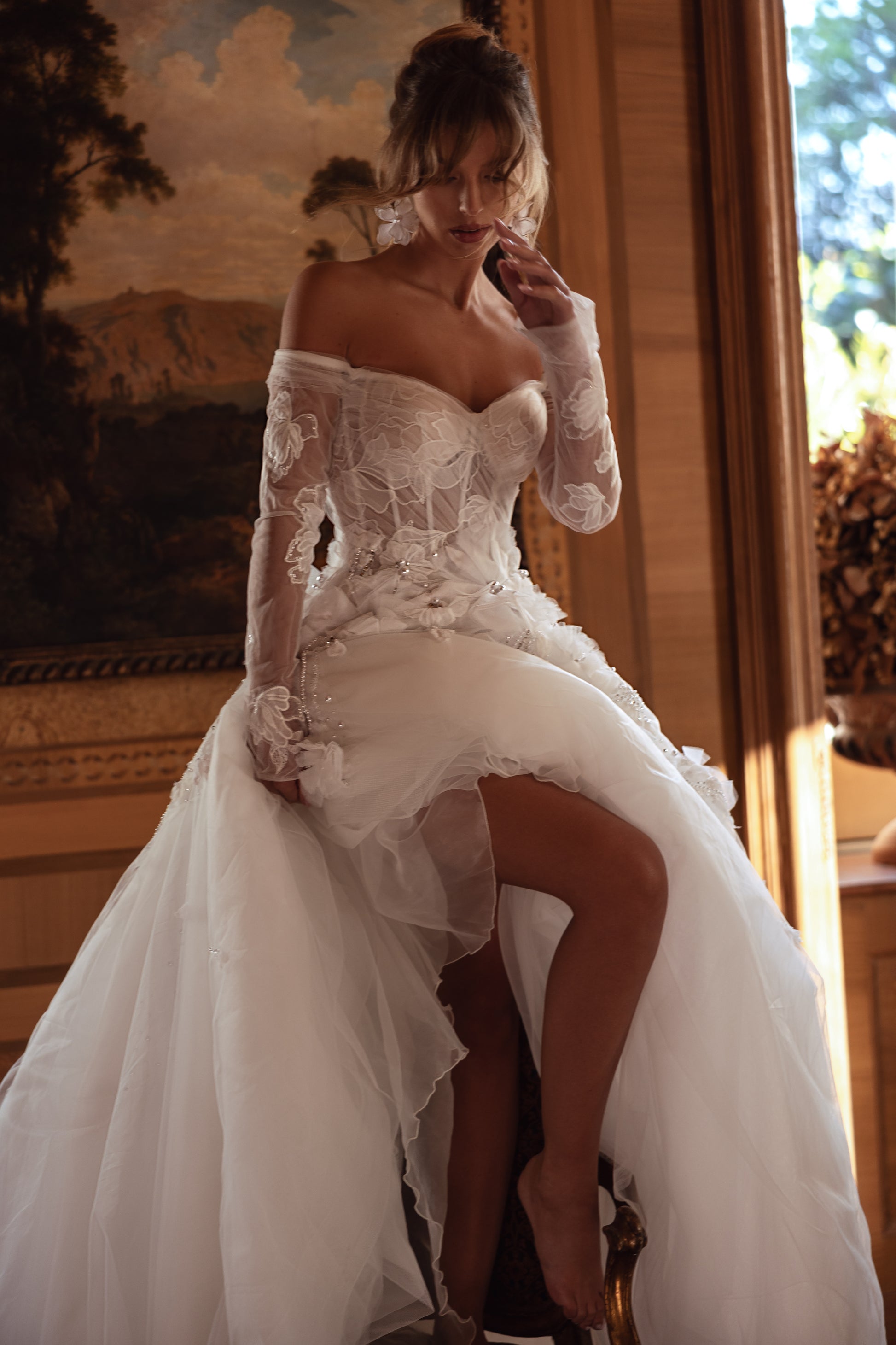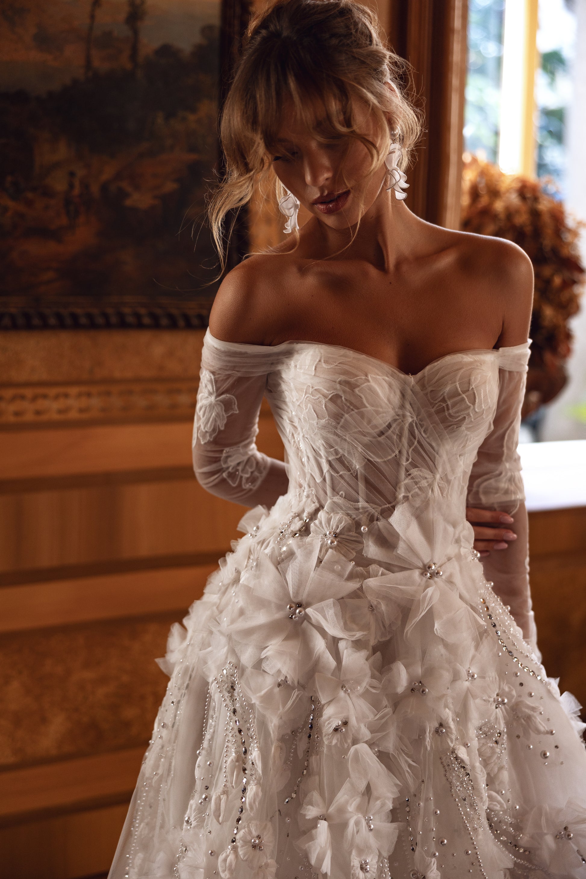 Step into a fairy tale with this enchanting guipure gown, where shimmering beads, pearls, and cascading 3D blooms blend with an off-shoulder design. Its waves of voluminous florals whisper romance and create a dreamy, princess-worthy silhouette with every twirl.