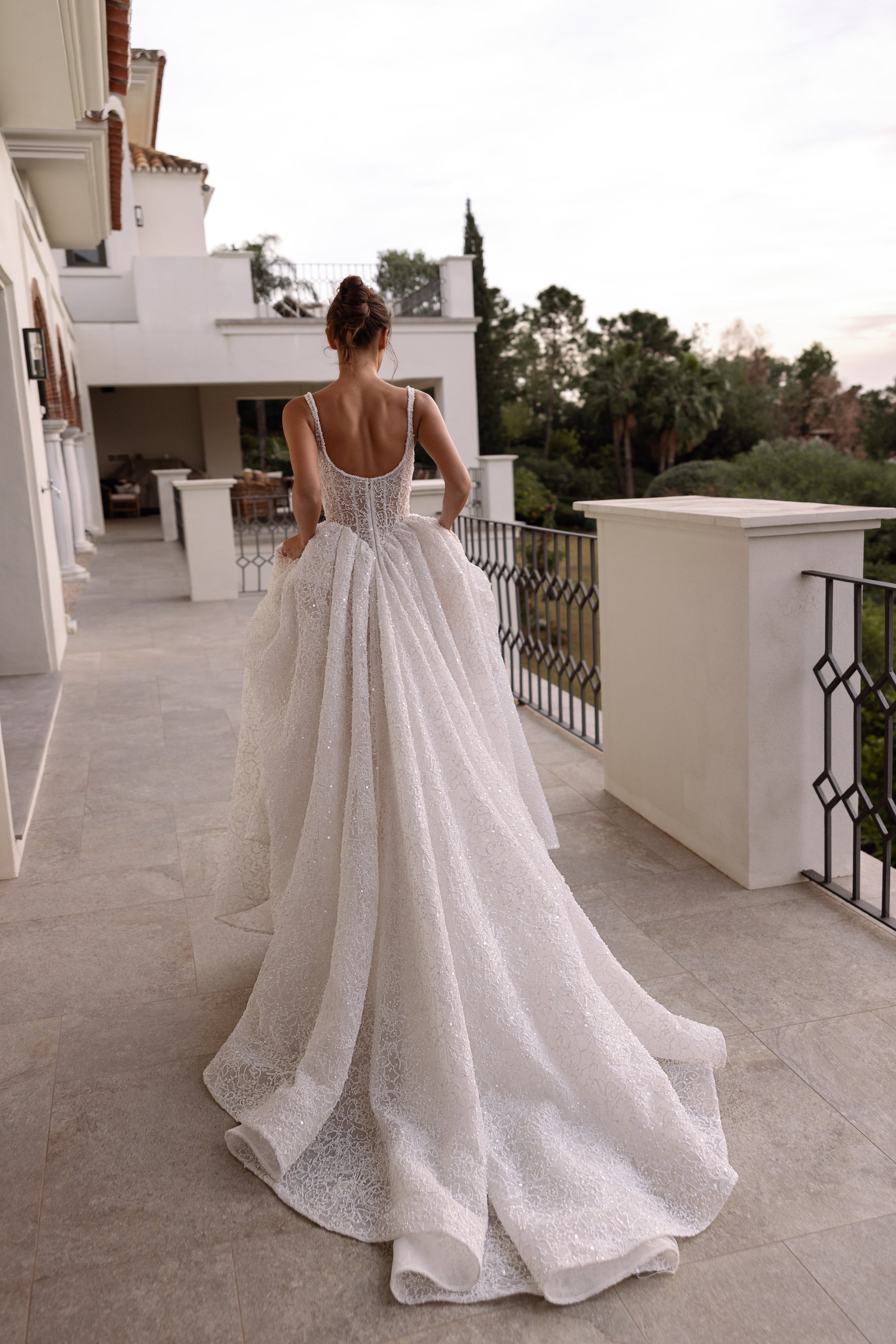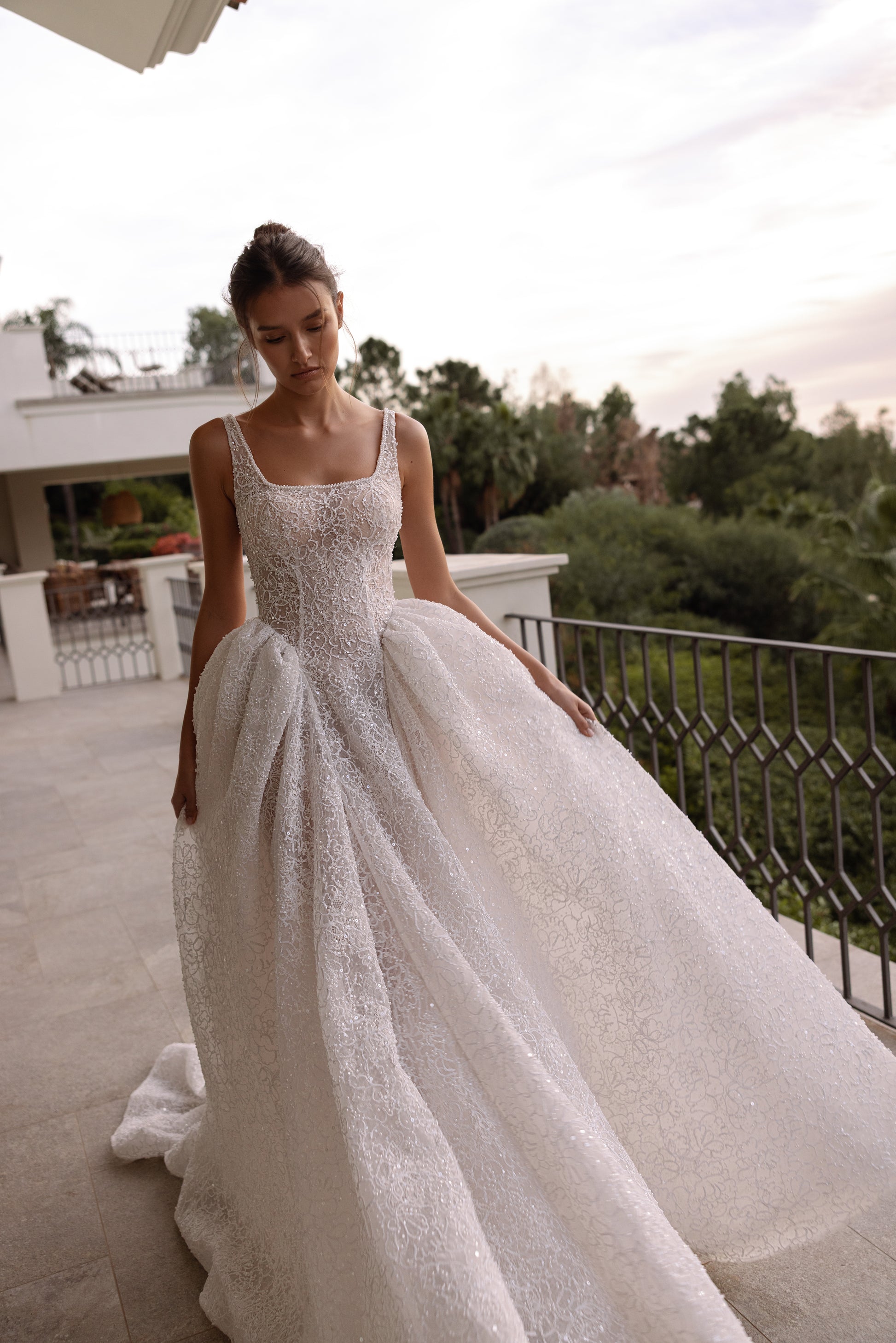 A princess gown with a couture-inspired structure and a modern square neckline. The corset bodice is handcrafted for a perfect, supportive fit, shaping the waist with clean architectural lines. Corded French lace layered over a subtle glitter base creates a refined shimmer and rich texture, while the full skirt adds effortless volume and elegance.