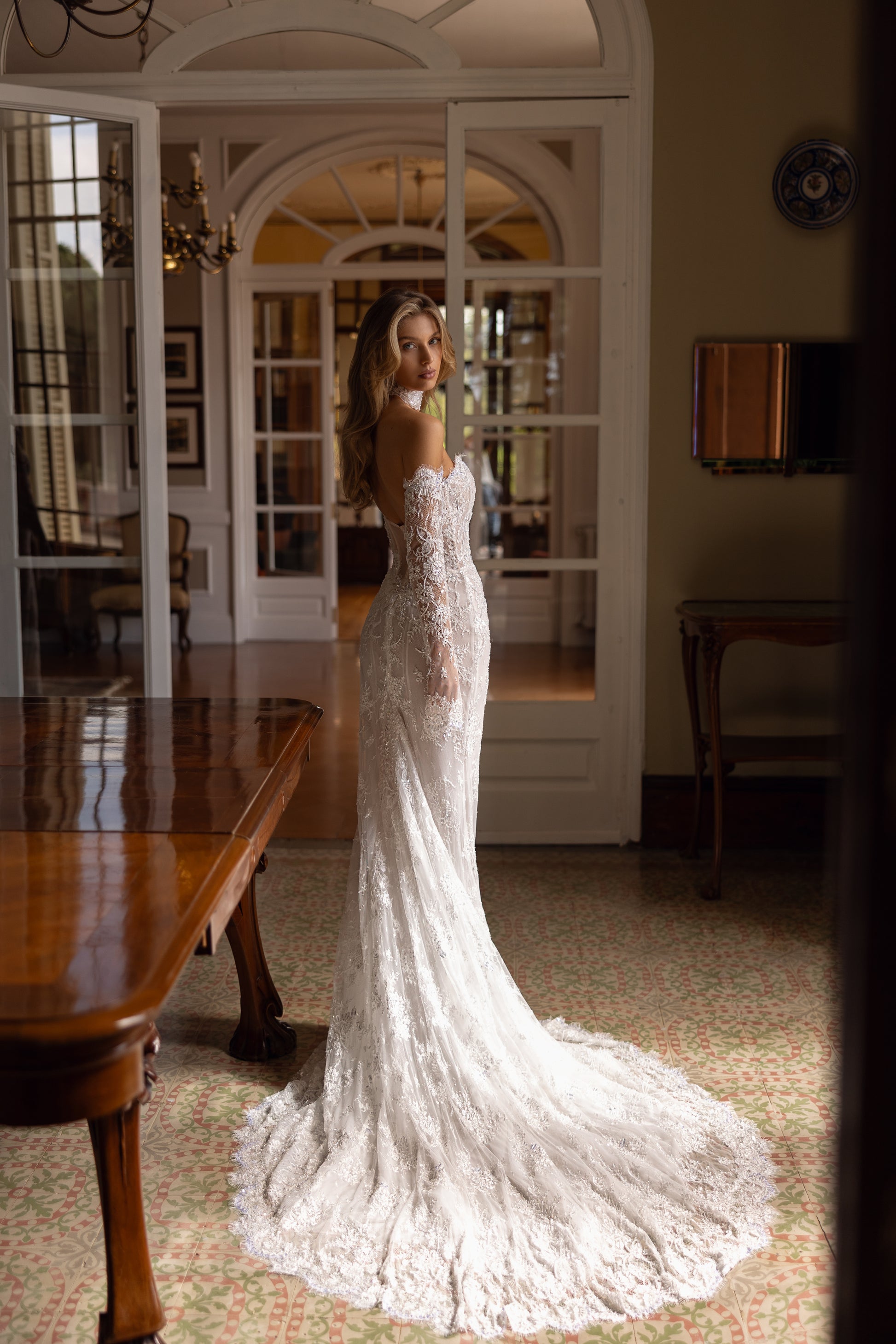 This ivory Chantilly lace gown, intricately embroidered with beads, exudes an air of mystery and promise. Handmade with care, it features detachable sleeves and a delicate lace choker, creating a captivating and enchanting look. Its subtle yet powerful allure evokes a sense of untold stories, calling to the soul.