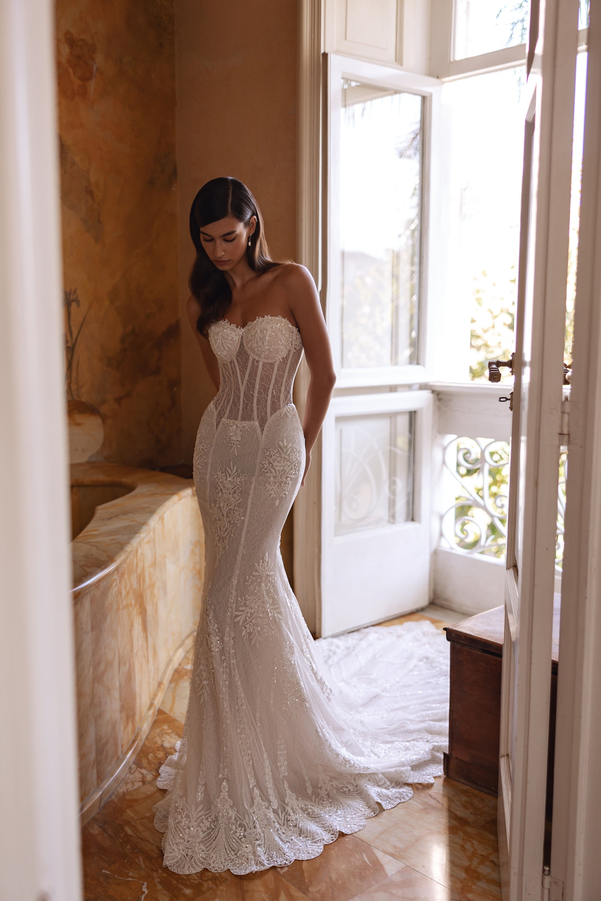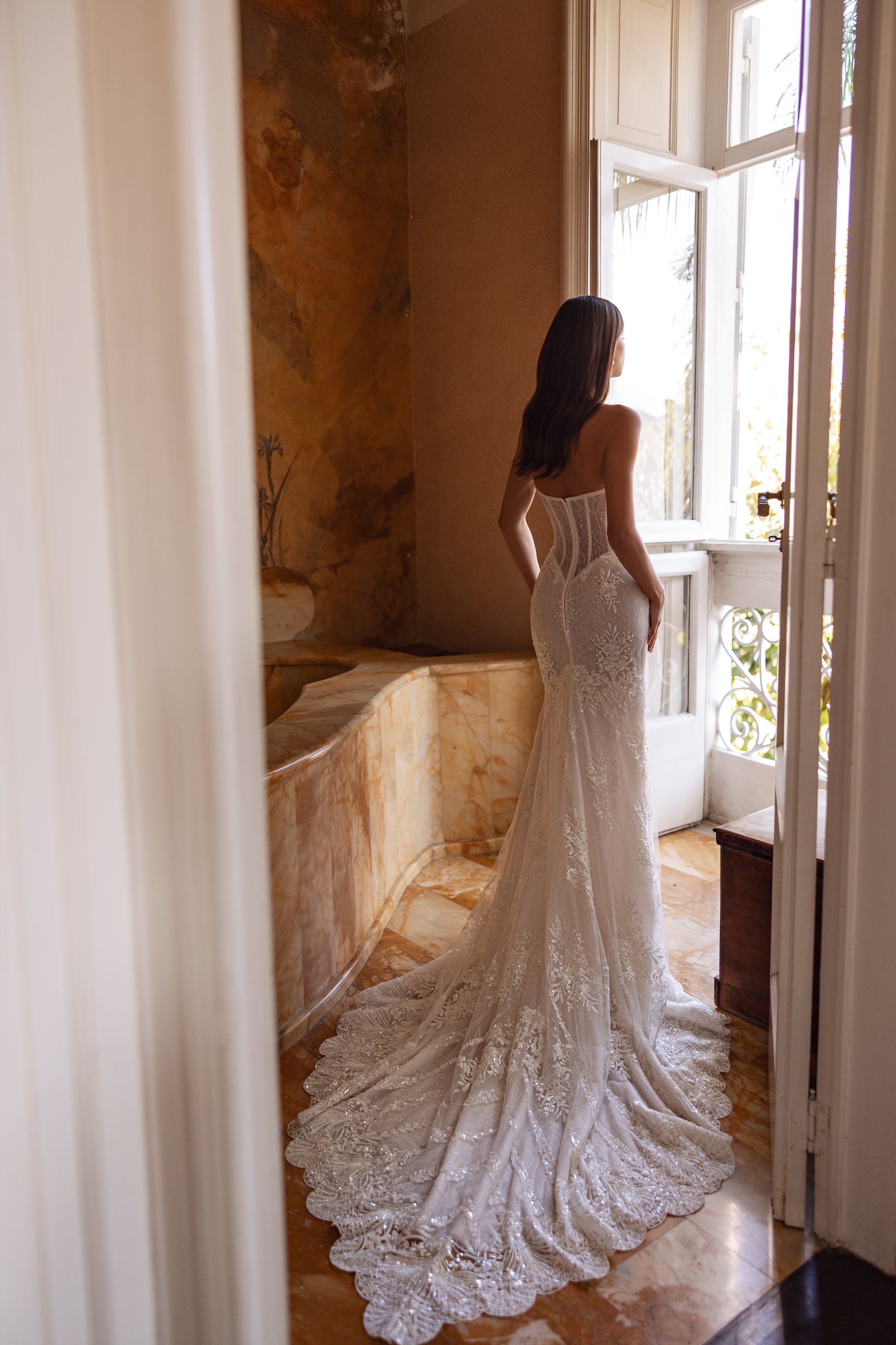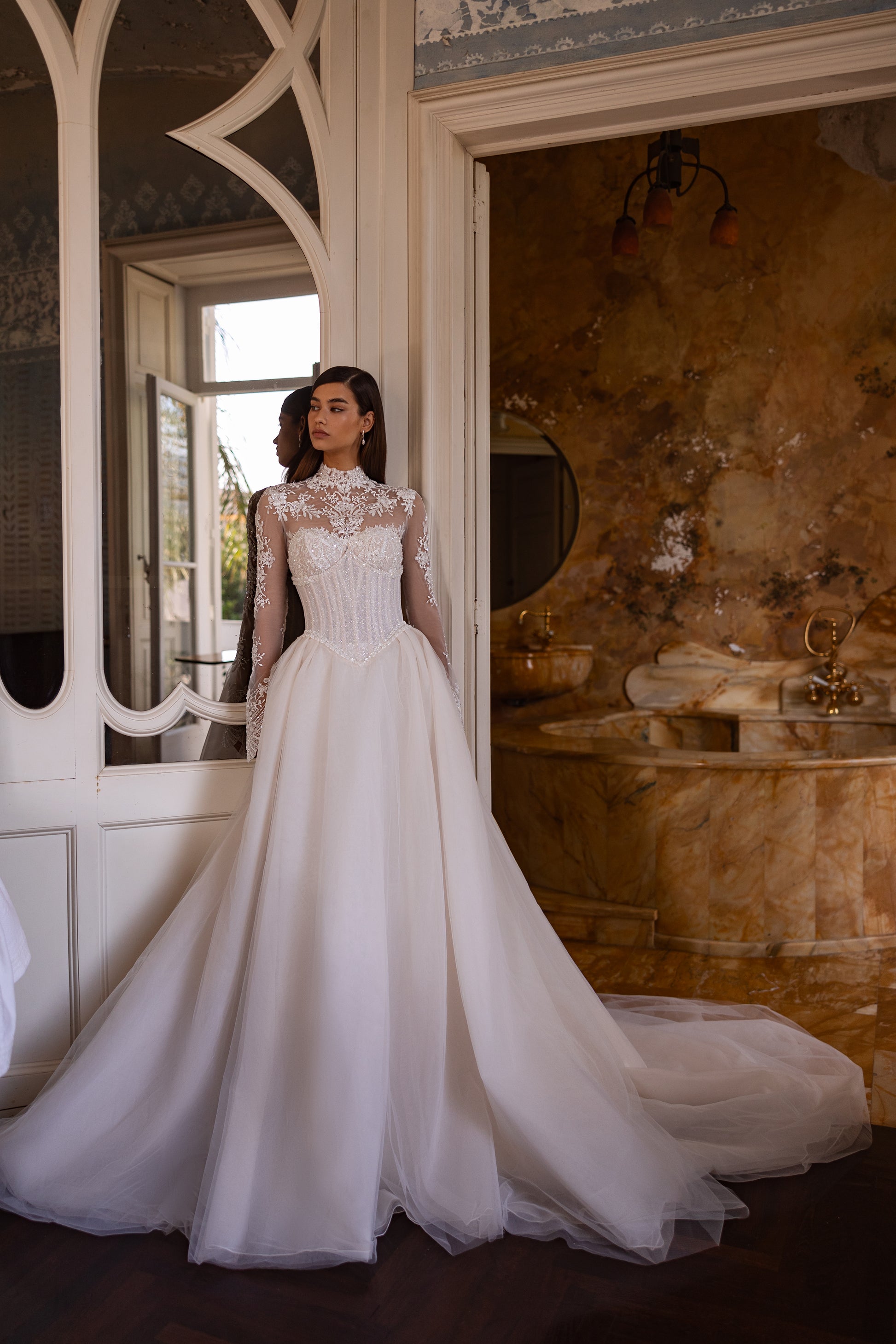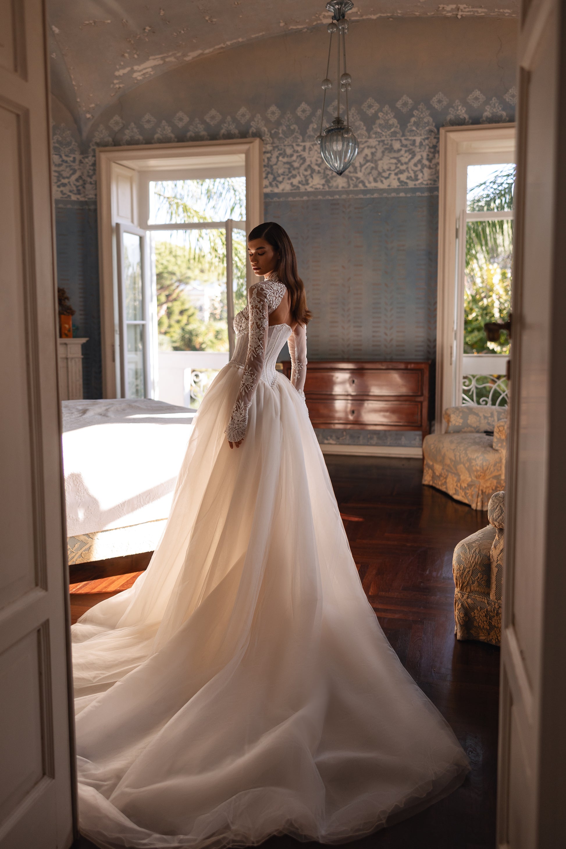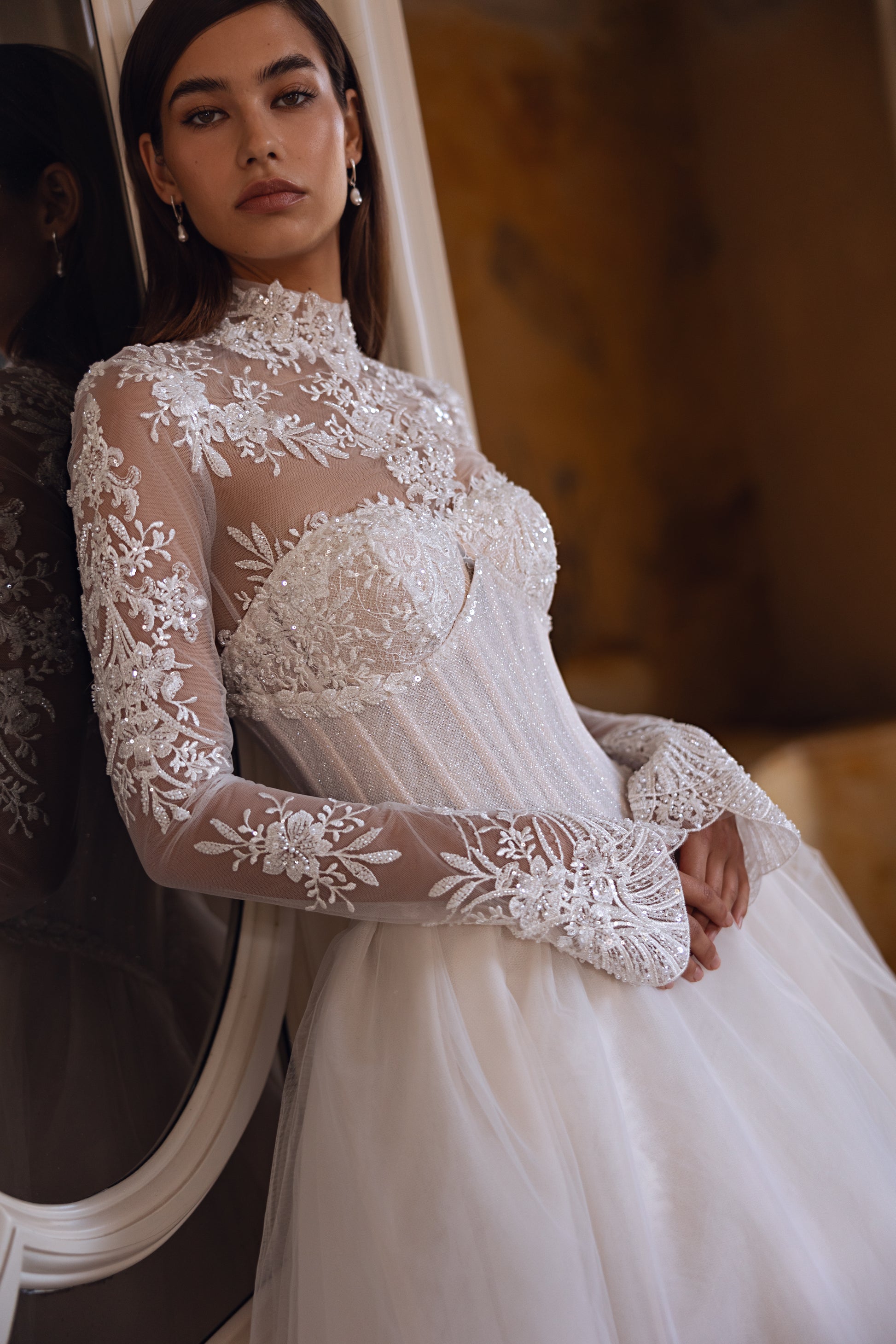 Unpredictable yet effortlessly elegant, this gown combines glittering Chantilly lace, guipure accents, and exquisite beadwork. A detachable shoulder-covering detail and removable lush skirt let you transform the look—go dramatic or refined, depending on the moment.