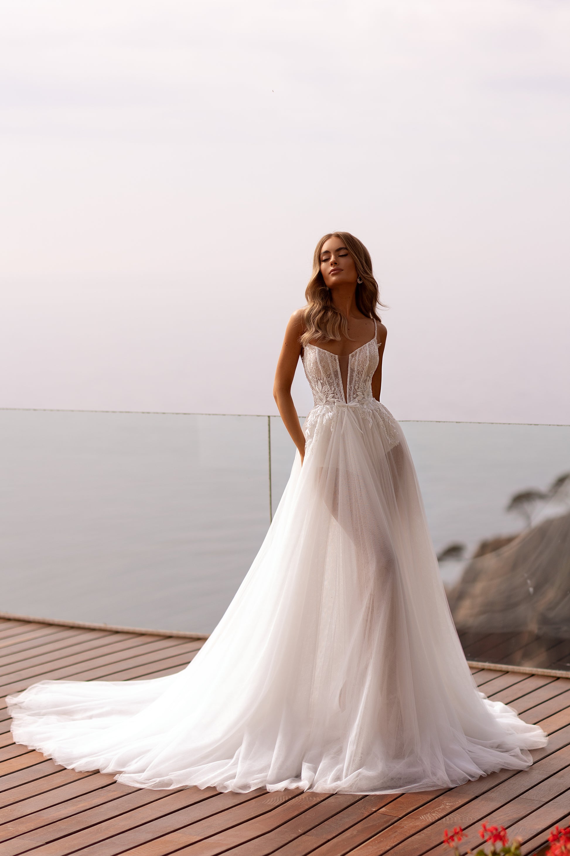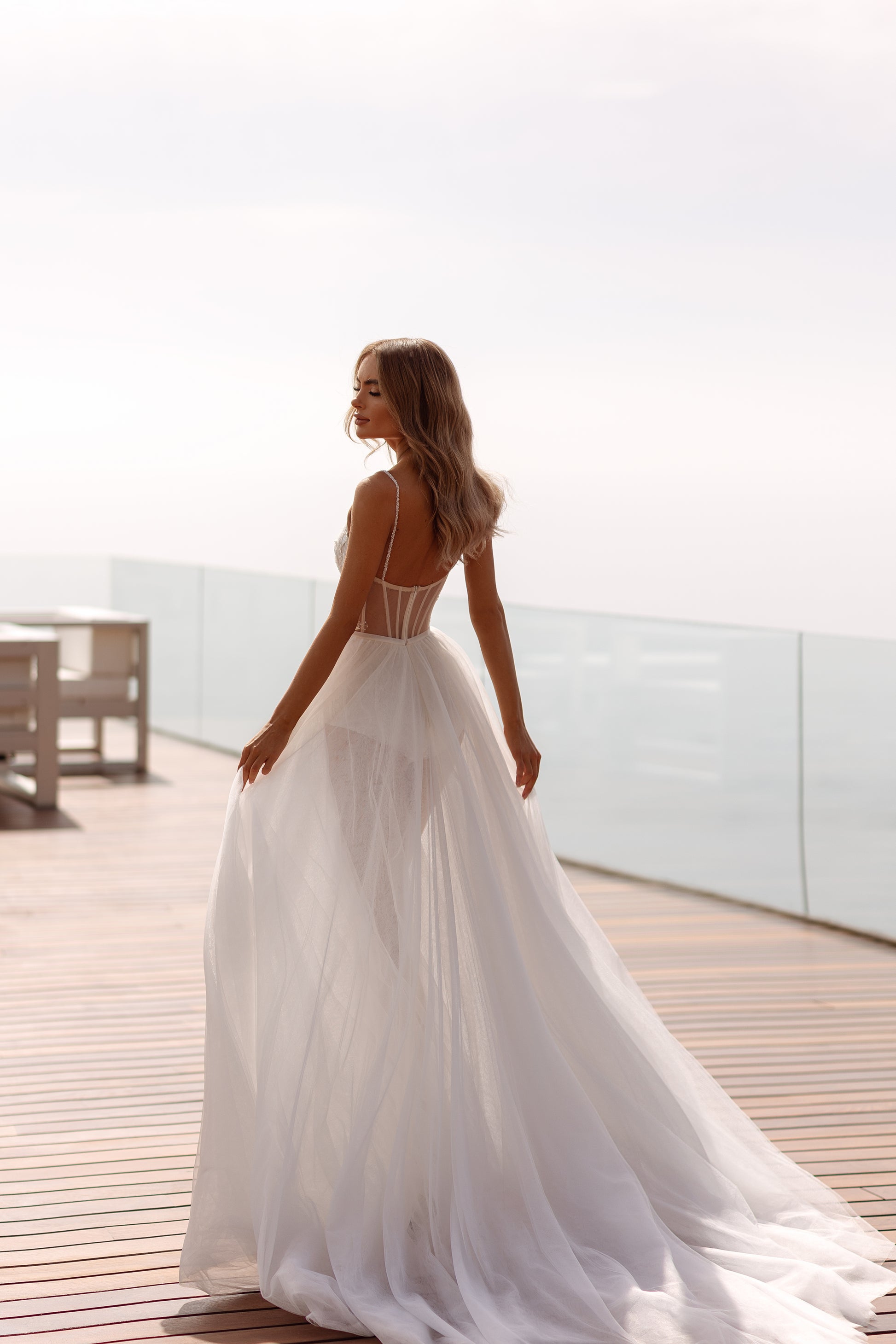 Bold and unapologetically feminine, Rolanda is designed for the confident bride. Draped in shimmering ivory tulle and adorned with beads, pearls, and sequins, this gown captures the perfect balance of strength and sensitivity. Its dramatic silhouette and intricate details create a bold statement of modern couture and timeless romance.