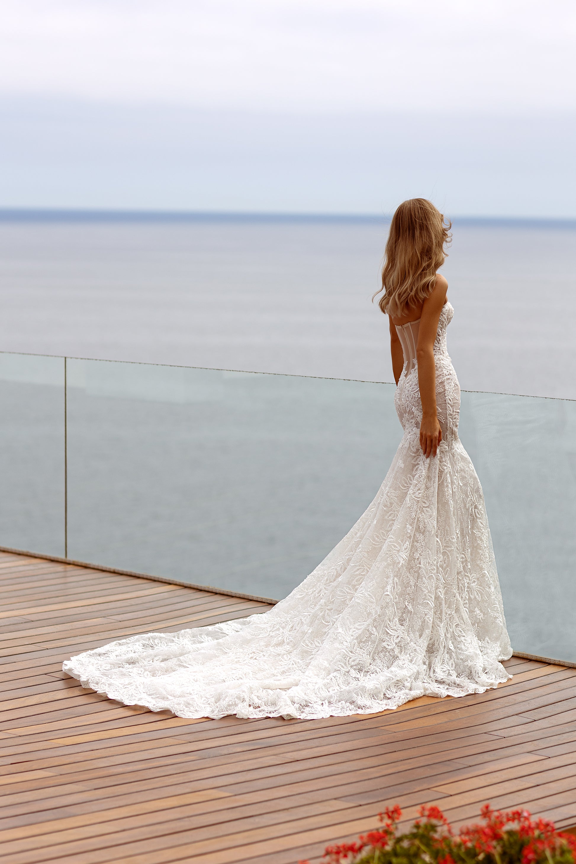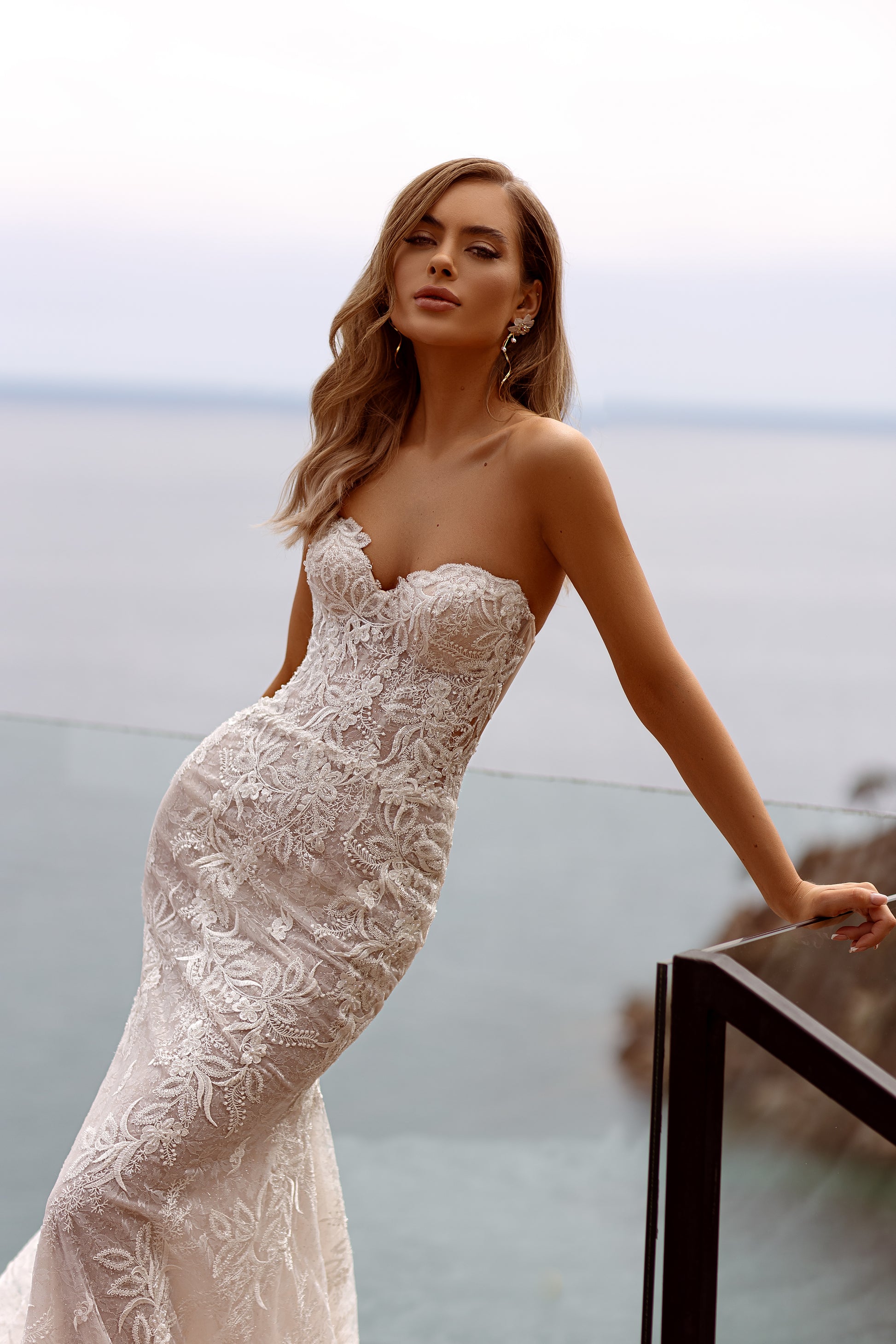 Sophistication meets modern allure in Roza, a cappuccino couture gown designed for the timeless bride. Guipure lace is delicately adorned with beads and pearls, creating a look that’s both understated and luxurious. The sweetheart neckline and flowing silhouette exude elegance, making it a seductive yet refined choice.
